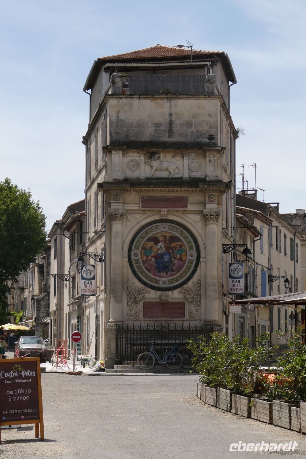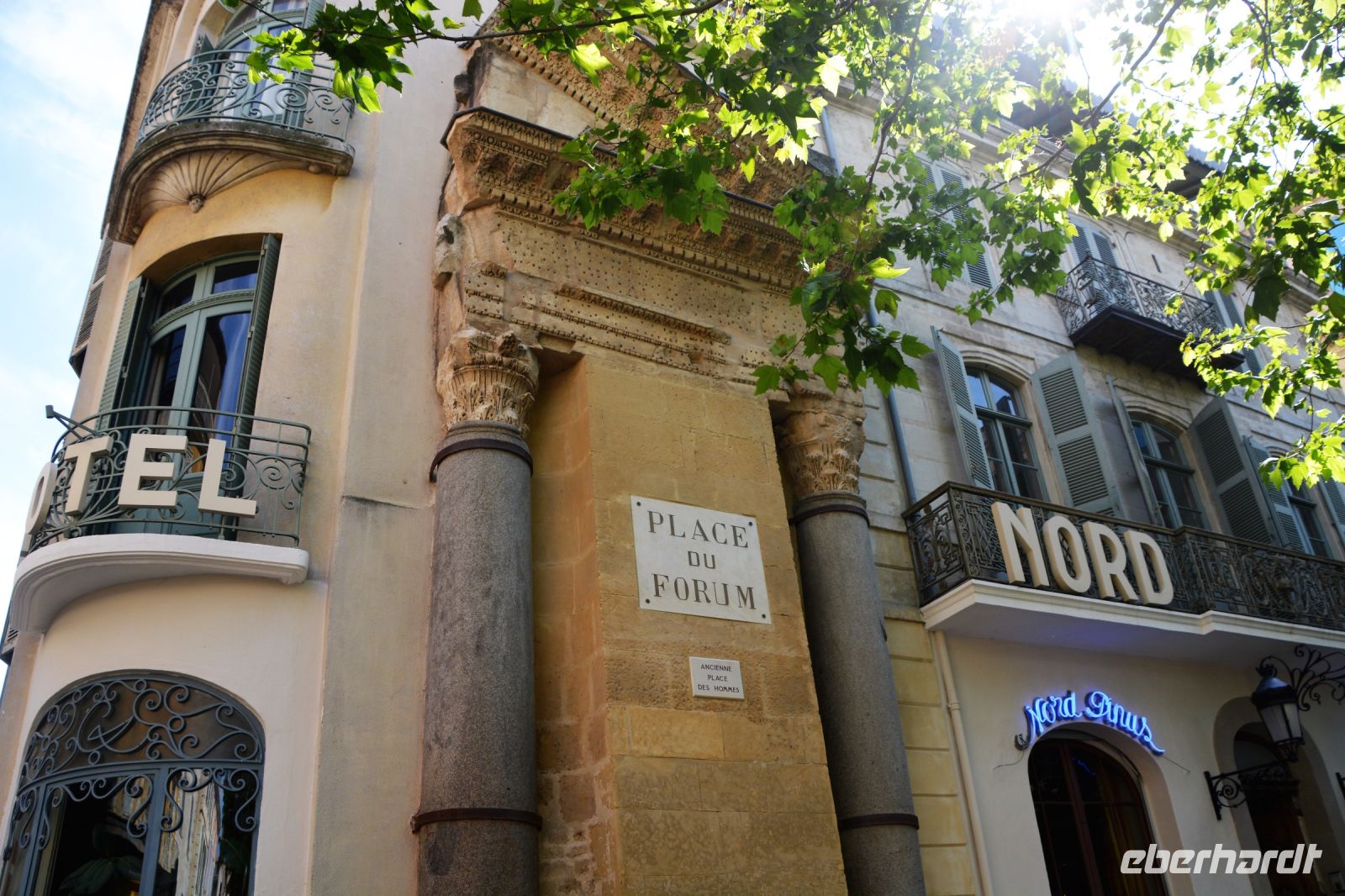 Unser erstes Ziel ist der sog, Espace Van Gogh. Hier im Hotel Dieu wurde der heute berühmte Maler behandelt, nachdem er sich nach einem Streit mit seinem Malerfreund Gauguin ein Ohr abgeschnitten hatte. Wir besichtigen kurz den Innenhof der wunderbar mit Blumen dekoriert ist und gehen weiter in Richtung Place du Forum, auf dem sich, wie der Name schon sagt, einst das Römische Forum, Zentrum jeder römischen Stadt, befand. Eine Säule aus der Zeit des Kaiser Trajan in einer Hotelfassade kündet noch von dieser fernen Epoche. In der Mitte des Platzes steht eine Skulptur des provenzalischen Dichters „Frederic Mistral“ und am Rande des Platzes erkennen wir das „Café de nuit“ welches der Maler Van Gogh in seinen Bildern verewigt hat. Man lebt hier nicht schlecht vom Malergenius.