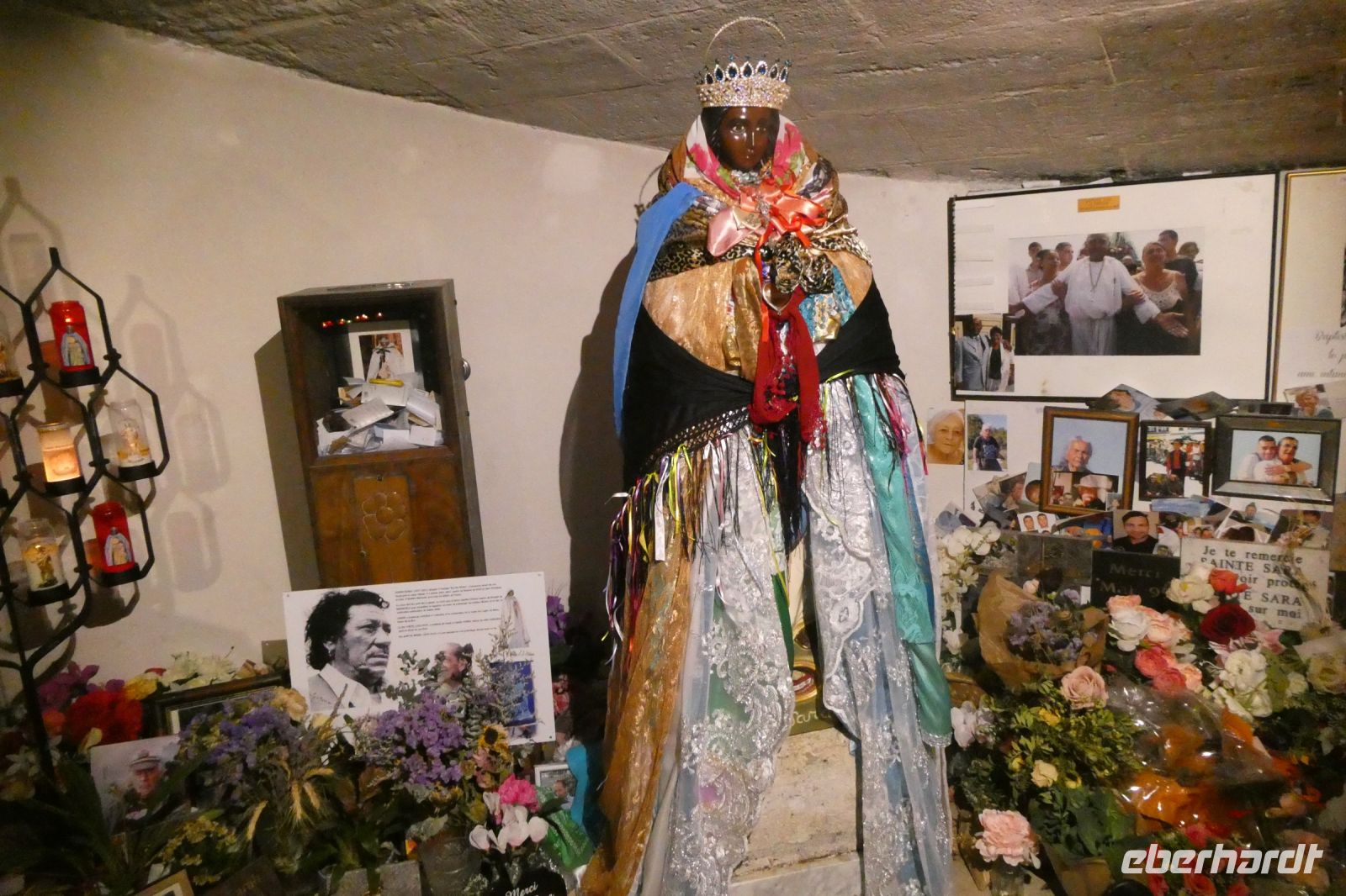 Zu Fuß laufen wir durch den Ortskern zur wichtigsten Sehenswürdigkeit des Ortes, die Kirche von"Stes. Maries" . Sie wurde im 14.Jahrhundert wegen der vielen Überfälle zur Wehrkirche ausgebaut. Im unteren Bereich befindet sich die "Schwarze Sarah" eine Heilige die wohl aus dem Vorderen Orient mit den beiden Marien als deren Dienerin in das Land gekommen sein soll und sich zum Christentum bekehrt haben soll. Sehr viele Danksagungen und Gaben sammeln sich um die "Heilige" welche im Mai anlässlich einer Wallfahrt von den "Gitans" (hauptsächlich Roma) und anderen Pilgern durch den Ort zum Meer getragen wird.