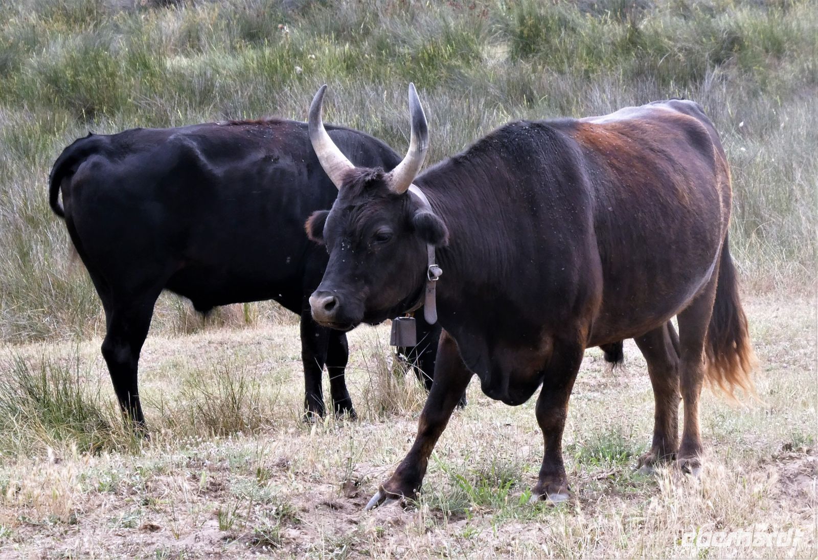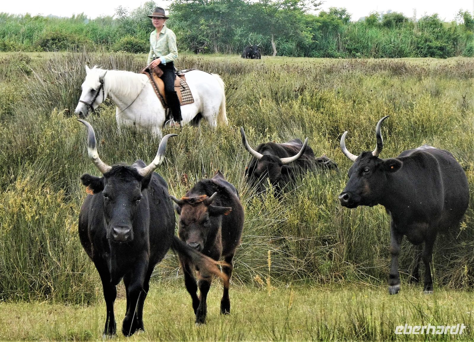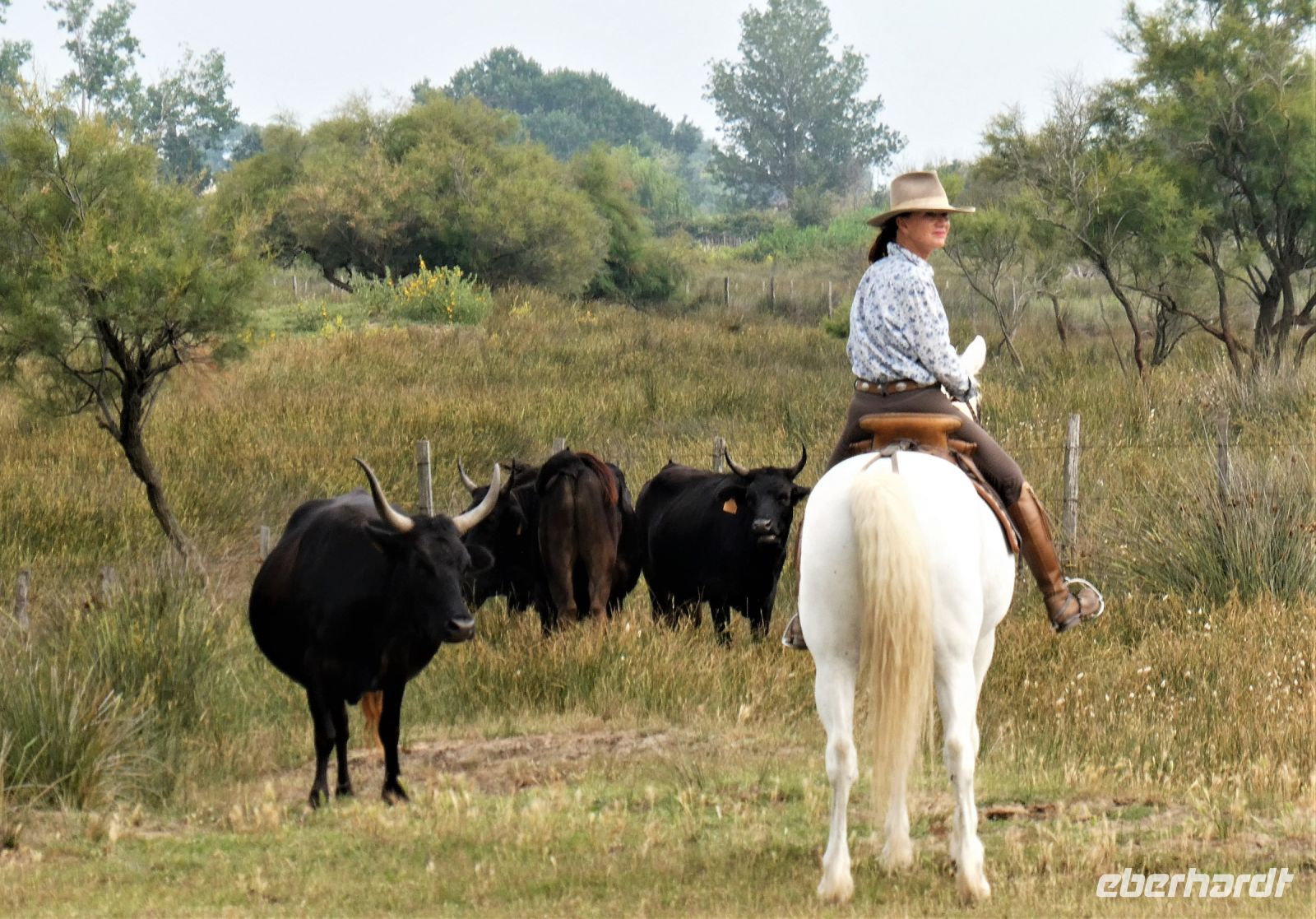 Dann aber geht es zu einem Stierzuchtbetrieb der besonderen Art. Wir werden dort schon erwartet und kurz nach unserer Ankunft werden wir von Chefin Stefanie , welche es vor langen Jahren in die Gegend verschlagen hat, hoch zu Ross empfangen. Sie erzählt uns etwas über die Art der Farm und der Zucht der Tiere und deren Bedingungen. Wir steigen schon einmal in den Leiterwagen, der uns durch das Gelände mit den Rindern bringen wird. Wir fahren von einem Traktor gezogen in Richtung Wiese. Die gemischte Herde von Camargue-Rindern wird von Stefanie und einer anderen Helferin vor uns hergetrieben. Wir können die Stiere und auch die Kühe mit ihren Kälbern beobachten. Man hat den Eindruck, alle wissen worum es geht. Wir bekommen sehr viel über die Art der Aufzucht erklärt.