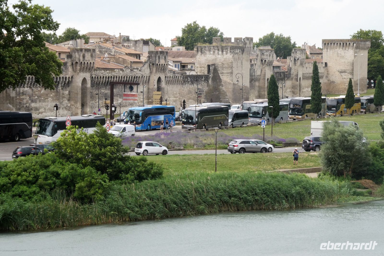 Dann geht es hinunter zum Ufer der Rhone und bald erblicken wir von weitem den "Rocher-des-Domes" hoch erhoben über der mittelalterlichen Altstadt, die von einer komplett intakten Stadtmauer umgeben ist. Die Brücke von Avignon ist ebenfalls zu sehen, kennt sie durch das berühmte Kinderlied so ziemlich jedes Schulkind in Europa.