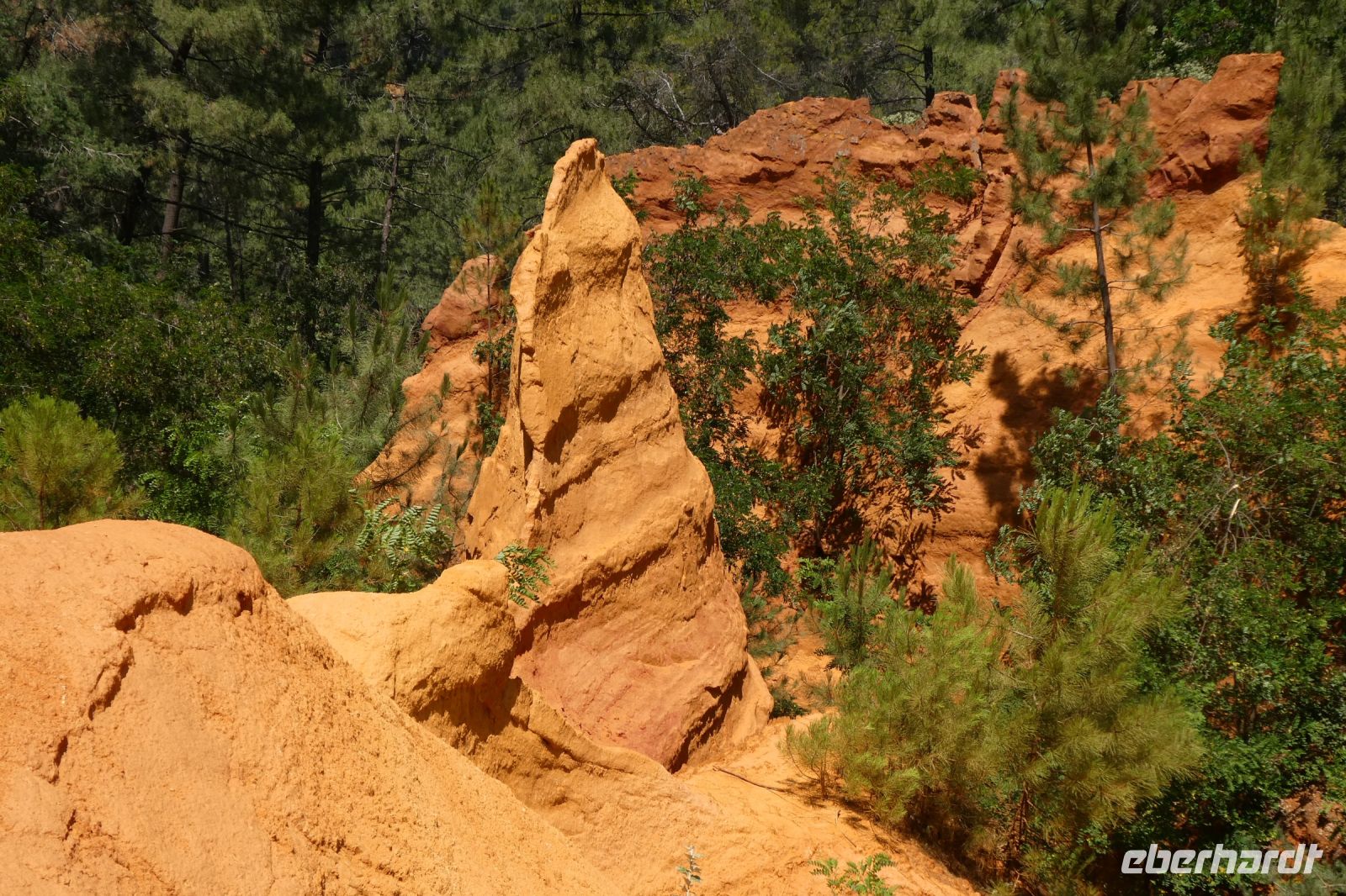 Wir fahren weiter in das Örtchen Roussillon, wo uns der "Ockerwanderweg" erwartet. Da es gestern geregnet hat ist die Feinstaubbelastung bei diesem Rundgang nicht ganz so stark. Wir können mit Ruhe und Gelassenheit auf den kleinen Wanderparcours gehen der von vielfältiger Flora begleitet wird. Starke Farbkontraste wie grüne Töne die sich gegen die Ockerfelsen abheben sind zu sehen. Licht und Schatten werfen Muster und auch hier begleitet uns das provenzalische Hintergrundkonzert: Zikaden.
