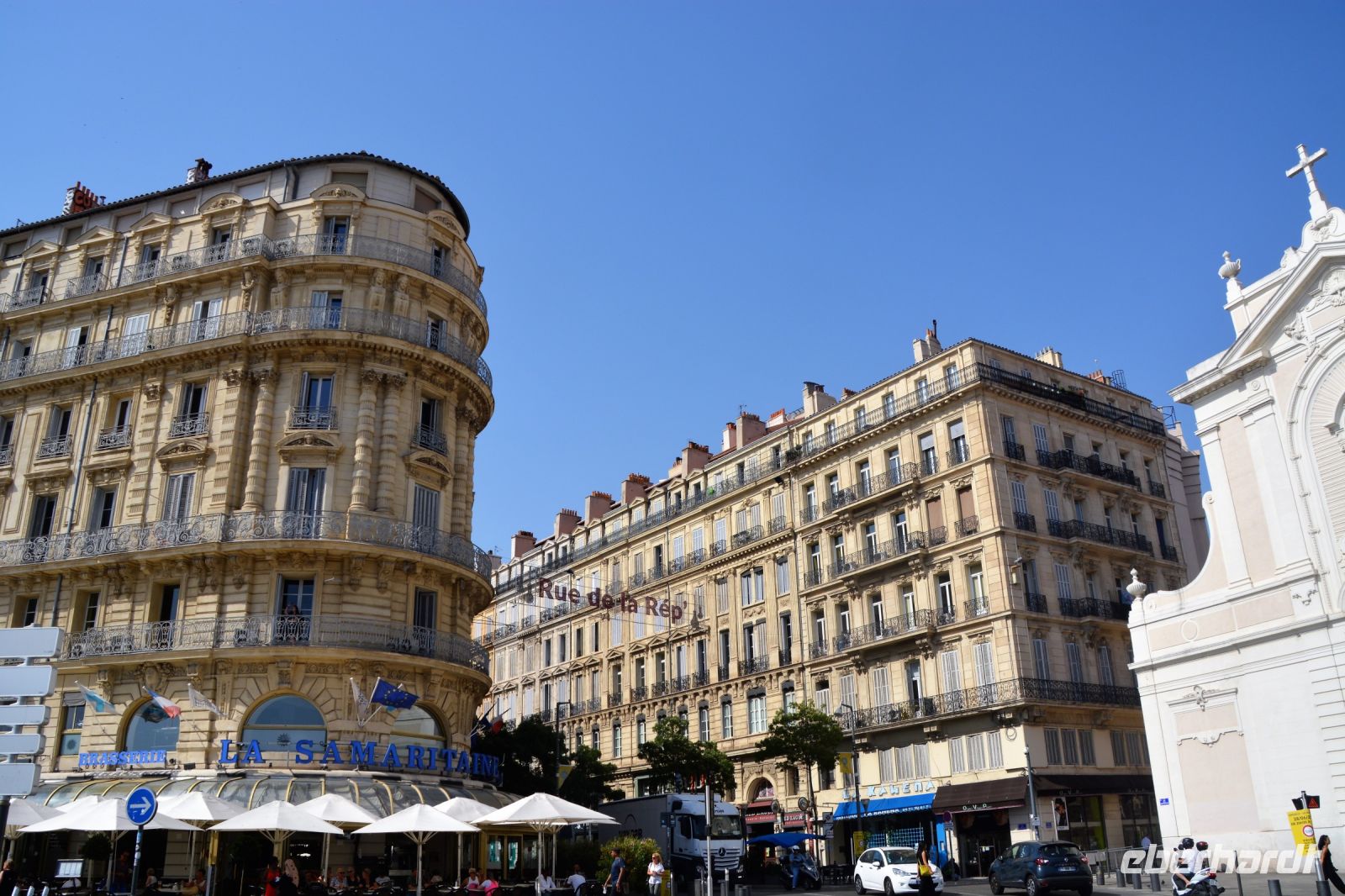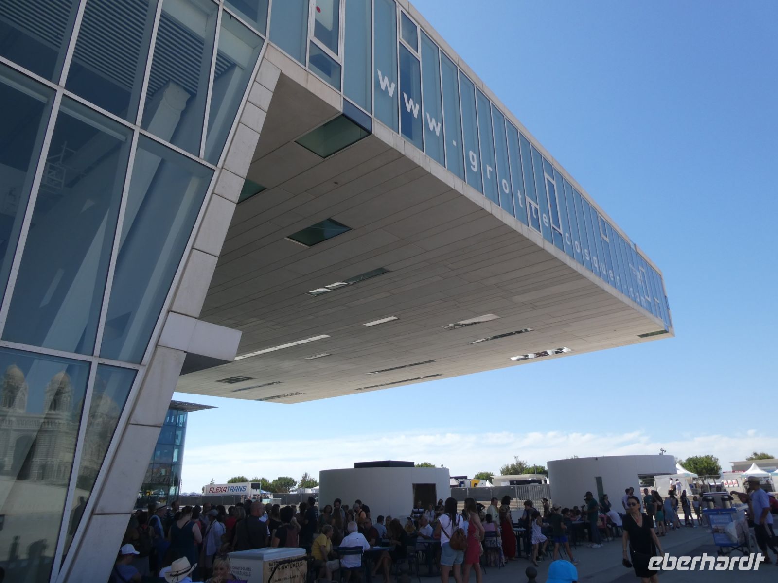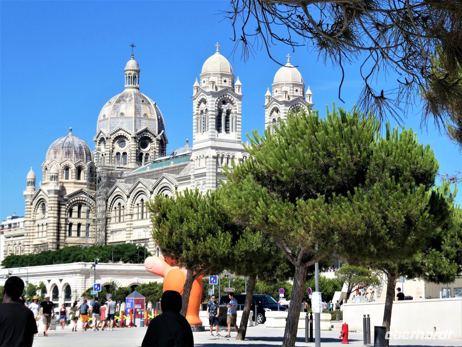 Von hier oben haben wir einen fantastischen Rundblick zu den vorgelagerten Inseln und zu dem durch den Grafen von Montechristo berühmten Chateau d'If,. Wir können den großen neuen Kreuzfahrthafen und die modernen Bauten der Stadt, wie das Mucem, ein tolles neues Museum sehen Mit der Villa Méditerrannée und ihrer nachgebauten Höhle von Cosquer ist es eine besondere Attraktion der Stadt. Alles ist mir dem alten Fort St. Jean. eine gelungene Kombination von Alt und Neu. Ganz im Hintergrund sieht man die Kathedrale Sainte-Marie-Majeure, ebenfalls aus dem 19.Jahrhundert im neobyzantinischen Stil erbaut. Anschließend sehen wir noch einmal einige Gebäude aus der bei der Fahrt zum Hotel aus der Nähe.