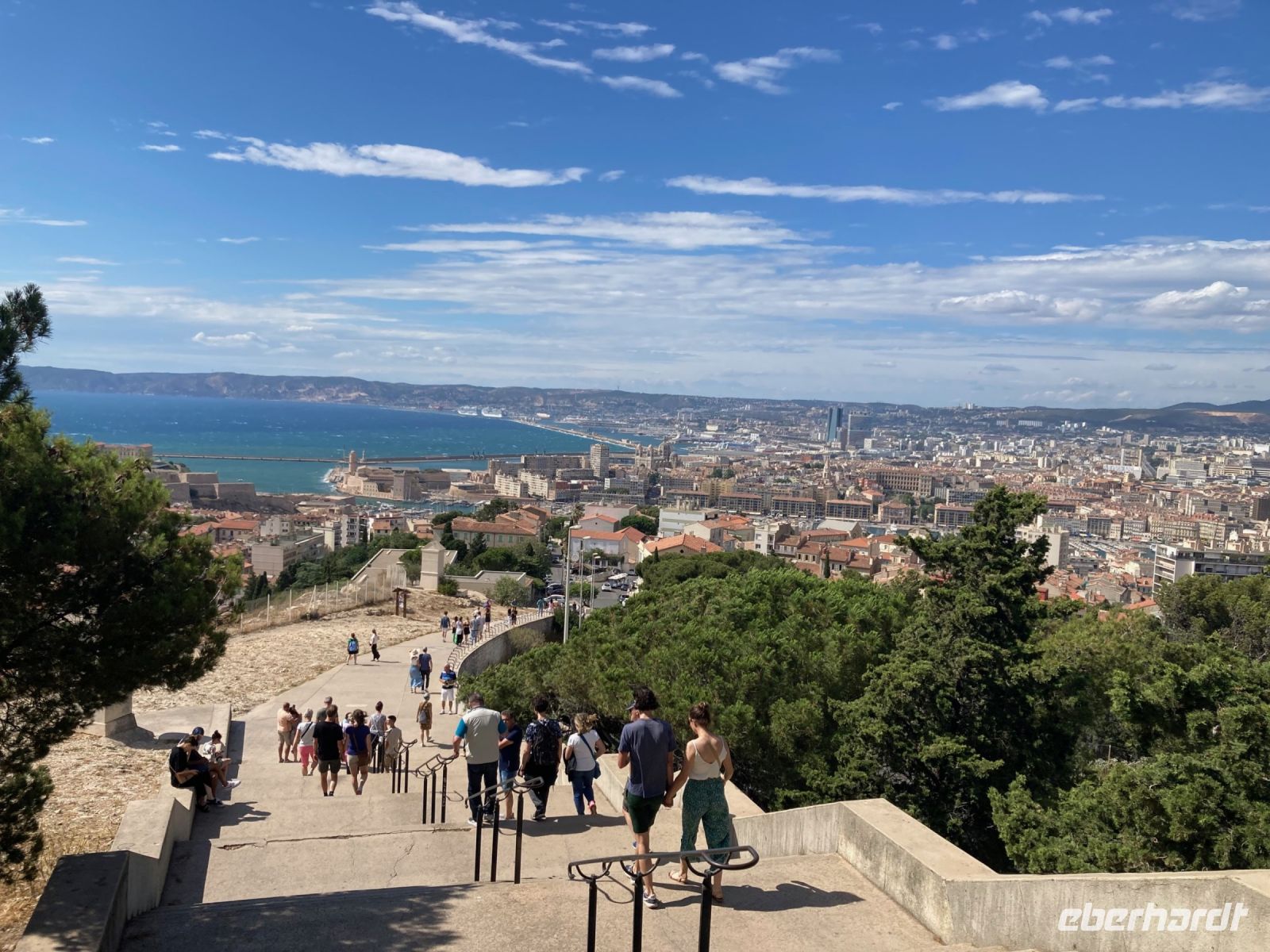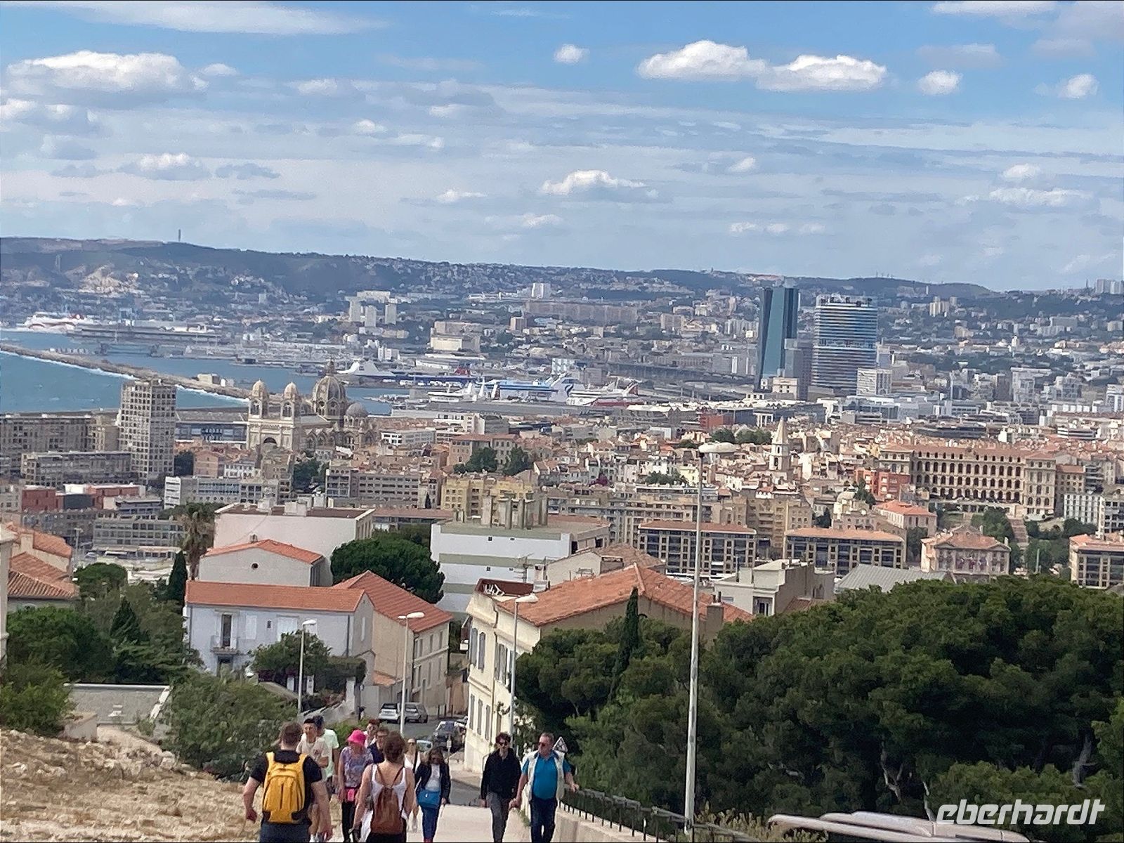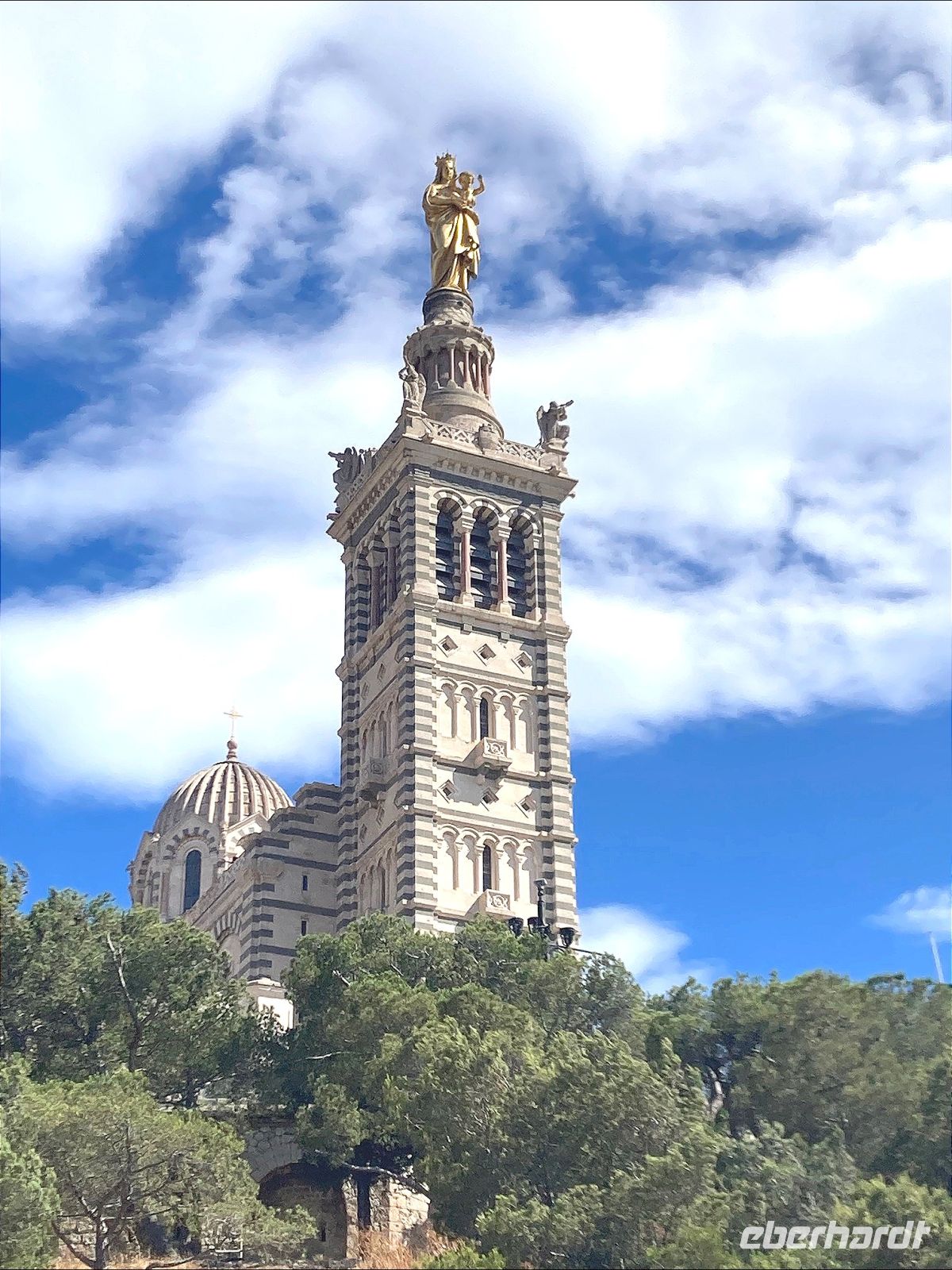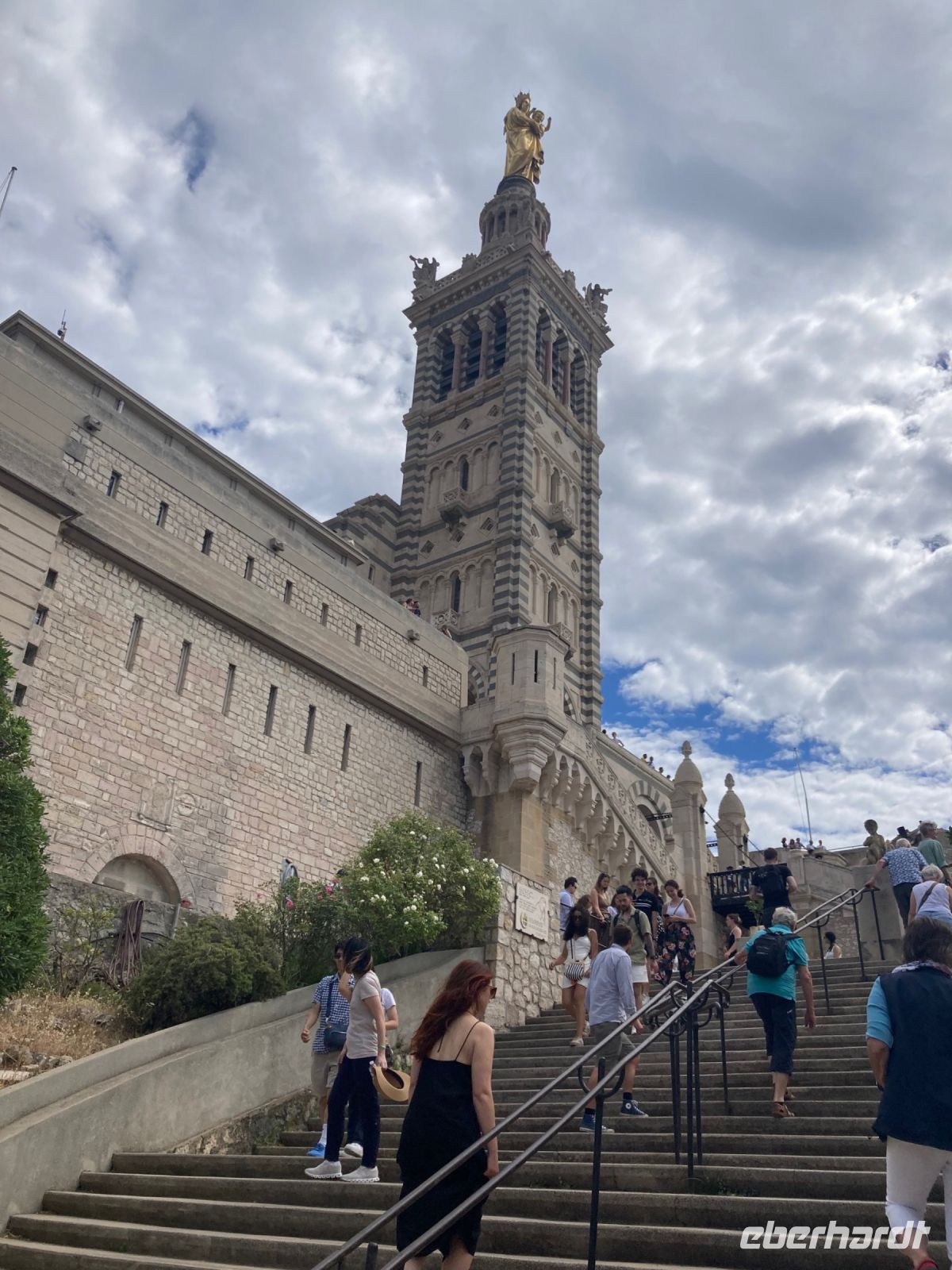 Danach geht es per Bus, gesteuert von Fabrice, unserem neuen Busfahrer, nach Marseille, wo wir auf unsere örtliche Reiseleiterin Natalie treffen, die uns ihre Stadt zeigt. Vor allem Fabrice ist es zu verdanken, dass diese Rundfahrt zu einem harmonischen Erlebnis gerät, da er sein tonnenschweres Fahrzeug gekonnt durch kleine Gassen hoch zur imposant gelegenen Kathedrale Notre Dame bugsiert und uns so geld- und zeitraubende Momente erspart. So können wir den phantastischen Ausblick nach allen Seiten genießen, wenn auch die Frisur durch den inzwischen sehr kräftigen Mistral etwas leidet.