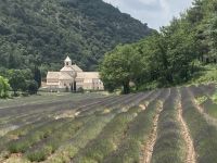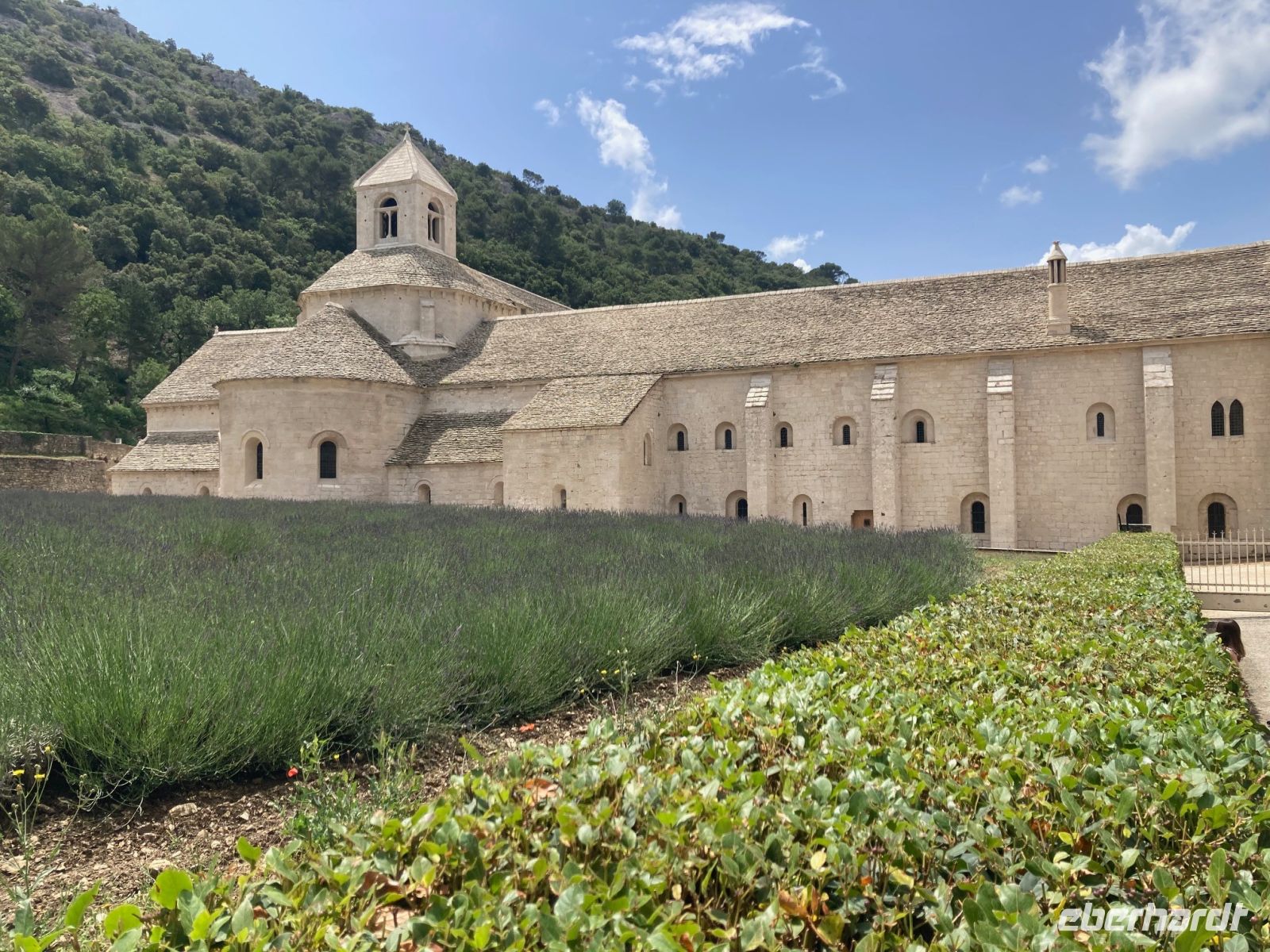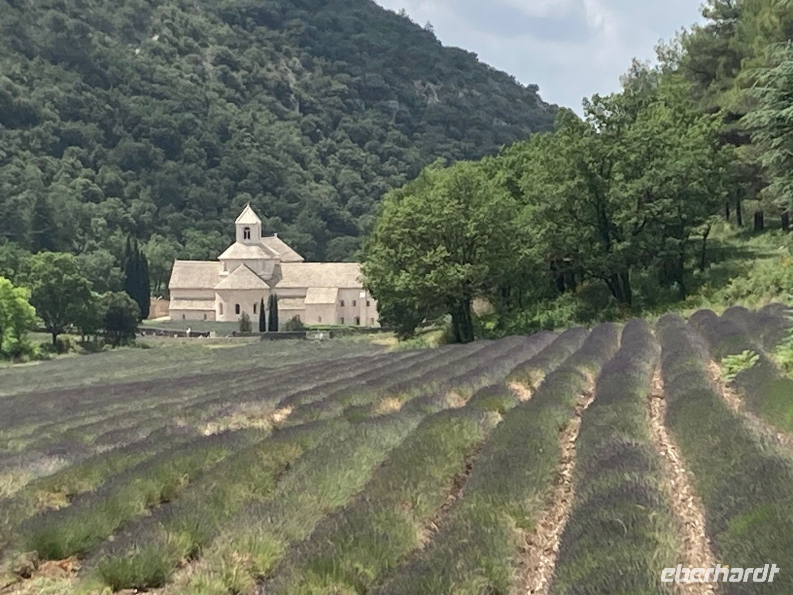 Zunächst machen wir am legendären Fotostopp vor Gordes Halt, um dieses Städtchen, das sich auf spektakuläre Weise an den Berg krallt,ausgiebig auf die Linse zu bannen, ehe wir es zu Fuß erkunden. Und dann geht es auf sehr engen Straßen mit unserem Riesengefährt zum Kloster Senanque, das inmitten von zart blühenden Lavendelfeldern in der Stille eines abgeschiedenen Tales thront. Da der Weg vom Parkplatz zum vielbesuchten Kloster relativ weit ist, der Rückweg bei hochsommerlichen Temperaturen noch mehr anstrengt und in der Abgeschiedenheit der Luberon-Berge nicht so viele Einkehrmöglichkeiten existieren, lädt die Firma EBERHARDT TRAVEL zu einem typisch französischen Picknick an einem herrlich gelegenen Platz mit weitem Blick ins Tal ein. Dies kommt bei den Gästen offensichtlich sehr gut an, denn von den reichlich aufgetischten Speisen und Getränken bleibt außer ein paar Wasserflaschen nichts übrig.