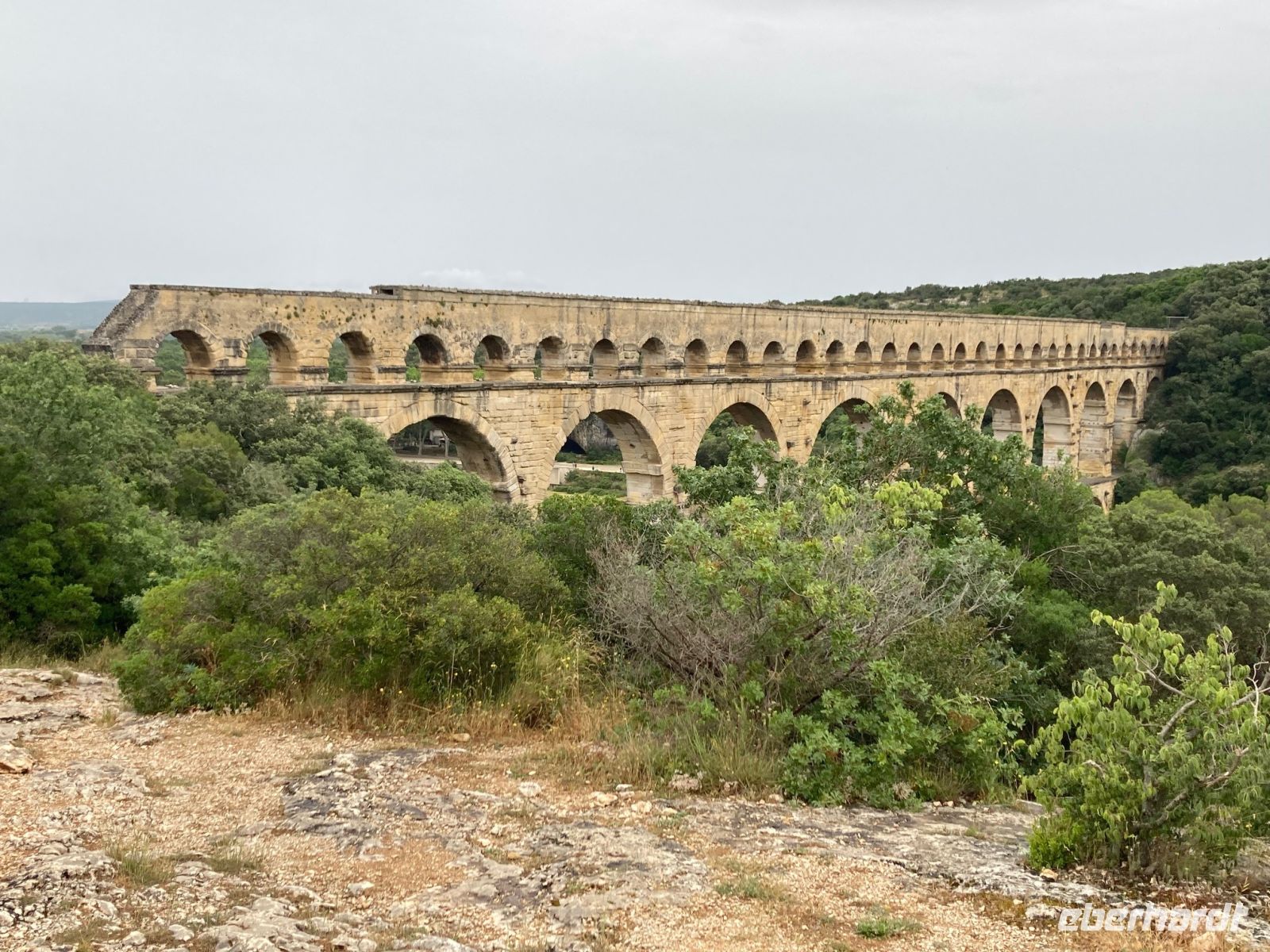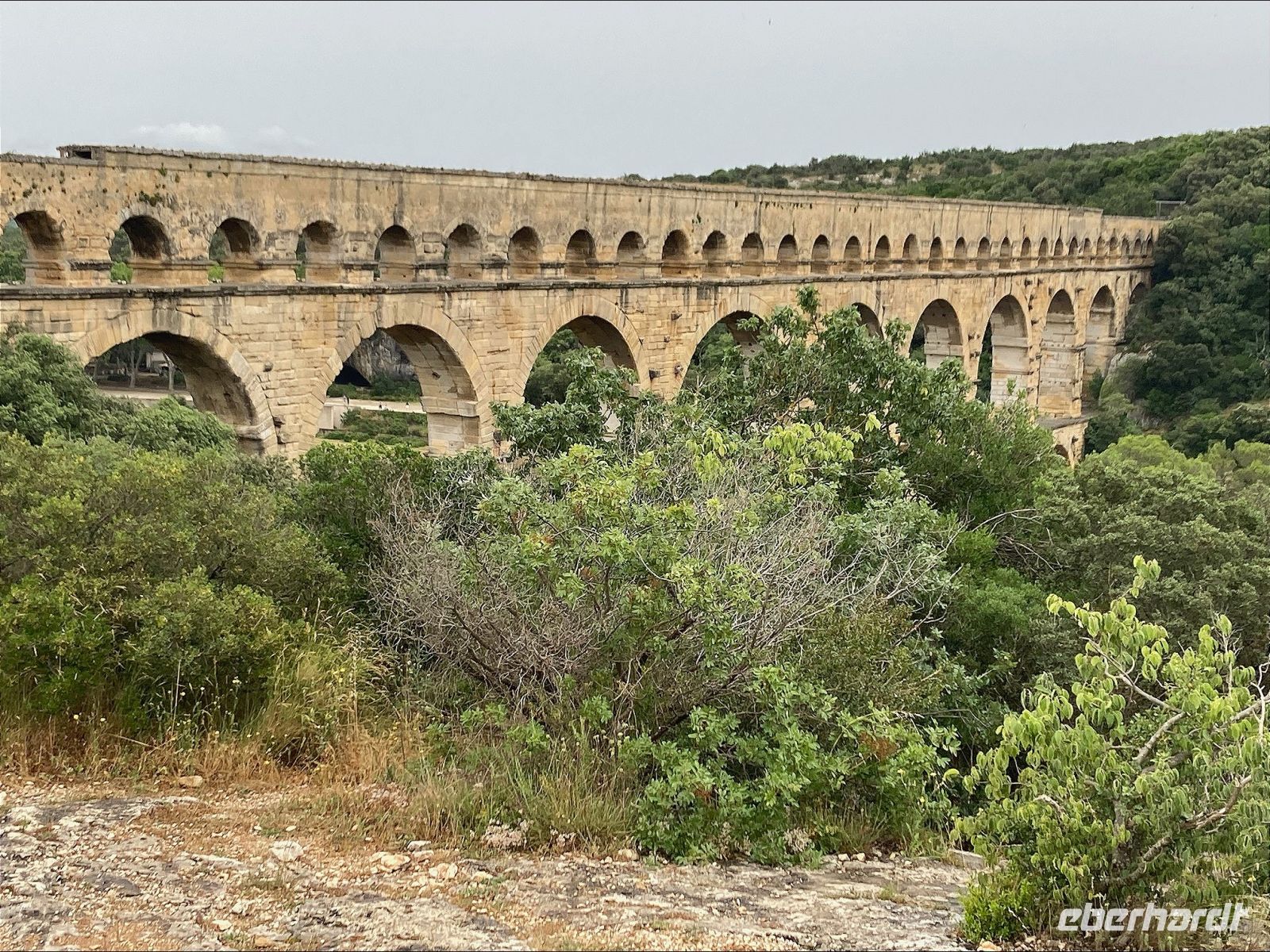 Am Nachmittag machen wir uns dann auf, die Krone römischer Ingenieurskunst zu begutachten, indem wir zum berühmten Aquaedukt, der Pont-du-Gard , fahren. Flankiert von uralten Olivenbäumen überspannt sie das Tal des Gardons mit ihren zahlreichen , in drei Reihen gegliederten Bogen. Nachdem wir auf den obersten Rängen Personen entdeckt haben, stürmen die meisten die steilen Stufen den Berg hinauf, um enttäuscht festzustellen, dass es sich bei den Brückenbesuchern um eine geschlossene Führung handelt, die teuer bezahlt werden muss. So müssen sich die Gäste mit der Erzählung des Reiseleiters begnügen, der vierzig Jahre zuvor mit einem mulmigen Gefühl Halbwüchsige über die oberste Rinne geführt hat. Ein schöner Aussichtspunkt, von dem aus das Aquaedukt in einem ganz anderen Licht erscheint, entschädigt sie aber für Ihren Aufstieg.