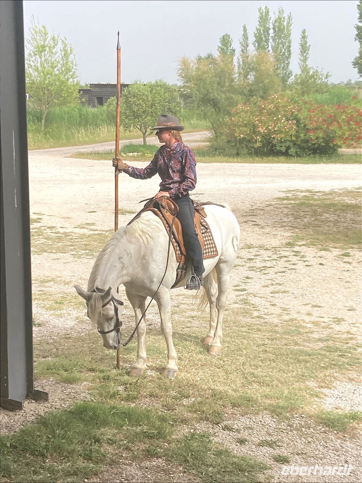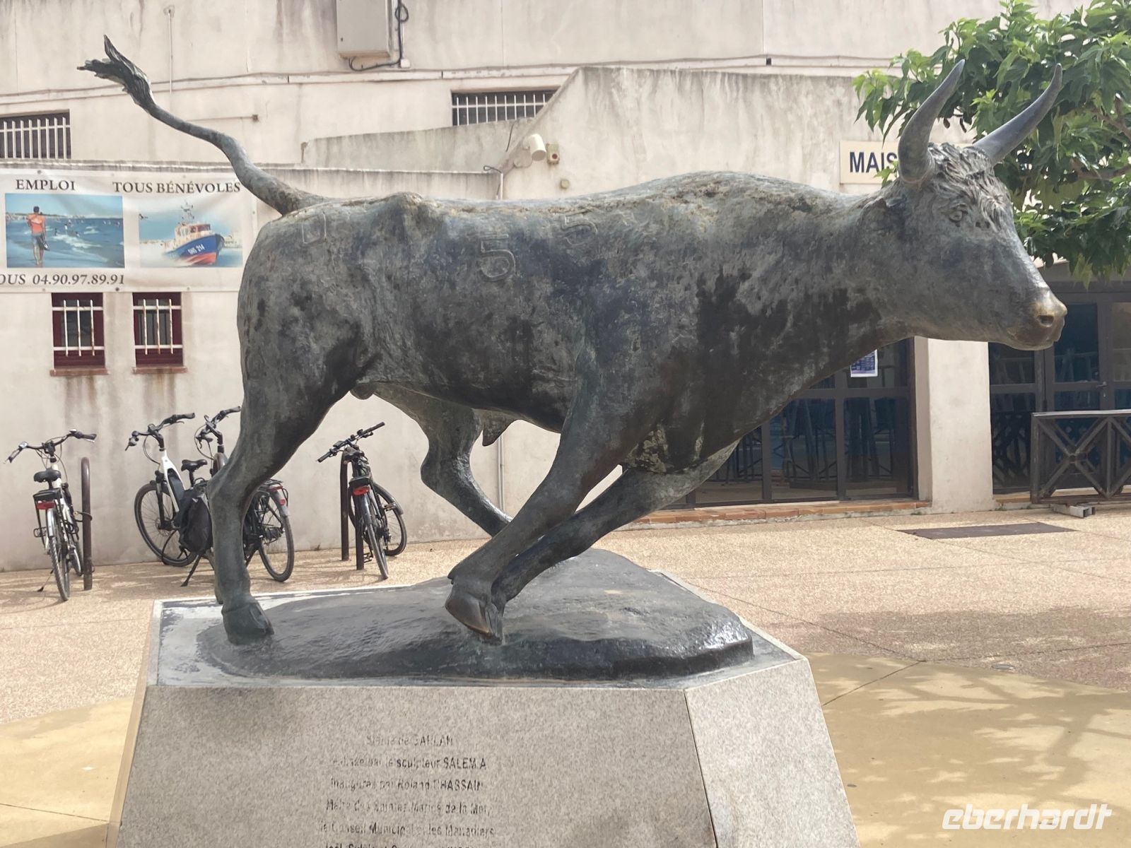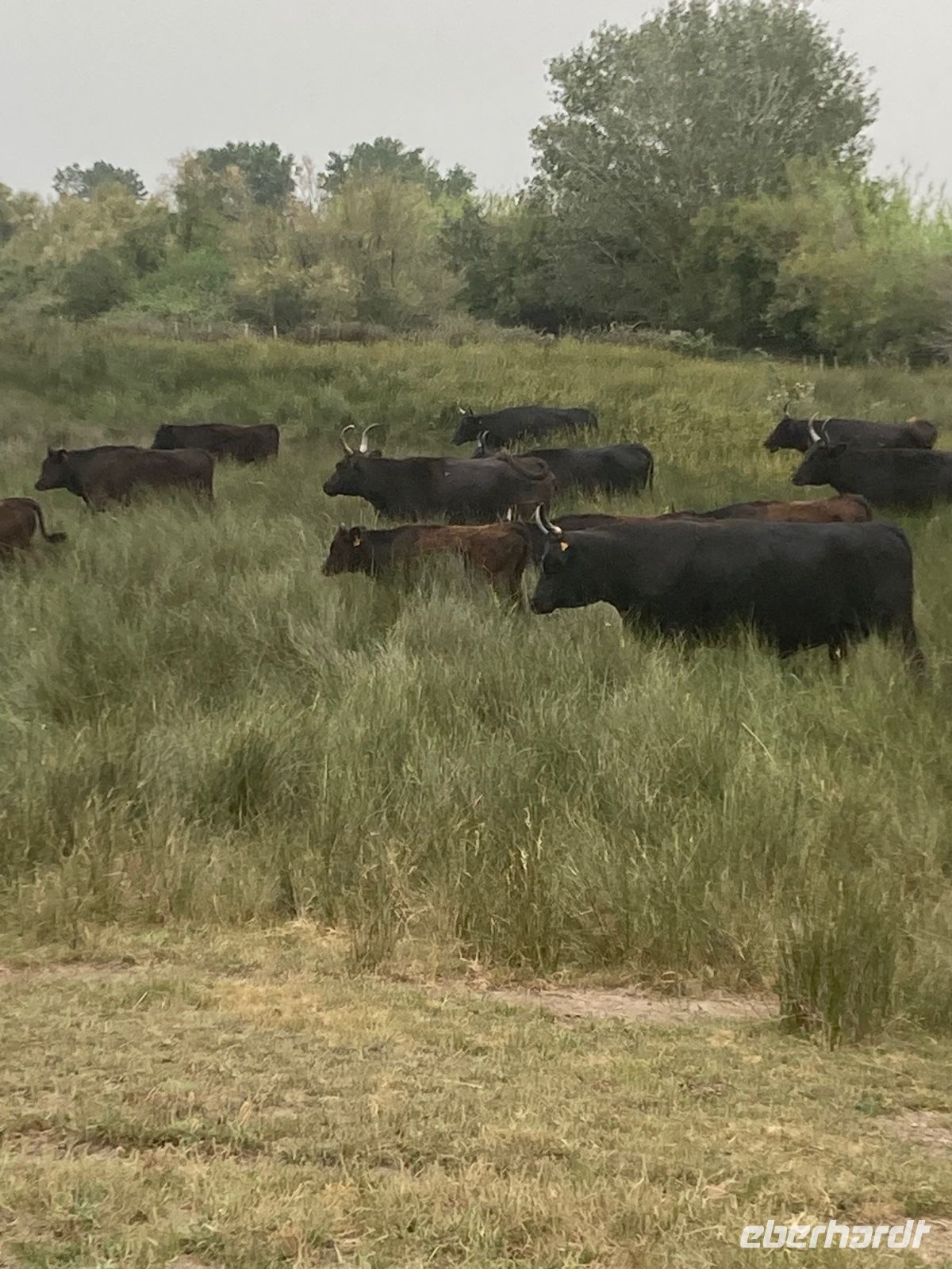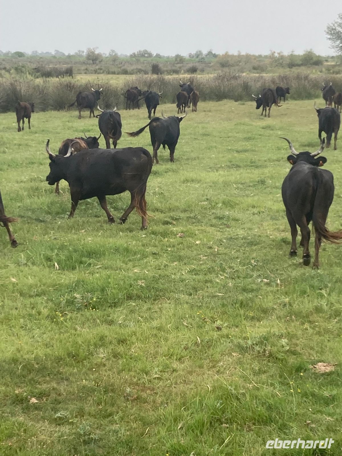 Zum Essen landen wir dann in einer Manade, einem typischen Stierzuchtbetrieb in der Camargue. Nach der Begrüßung durch die deutschstämmige Besitzerin fahren wir mit dem Traktor zur Stierherde, die von drei „Gardians“, den provencalischen Cowboys, mehr oder weniger erfolgreich bearbeitet wird. Und danach lassen wir uns das schmecken, was man mittel dieser Tiere alles herstellen kann: Stiersalami, Stierpastete, Stiergulasch – alles sehr lecker!