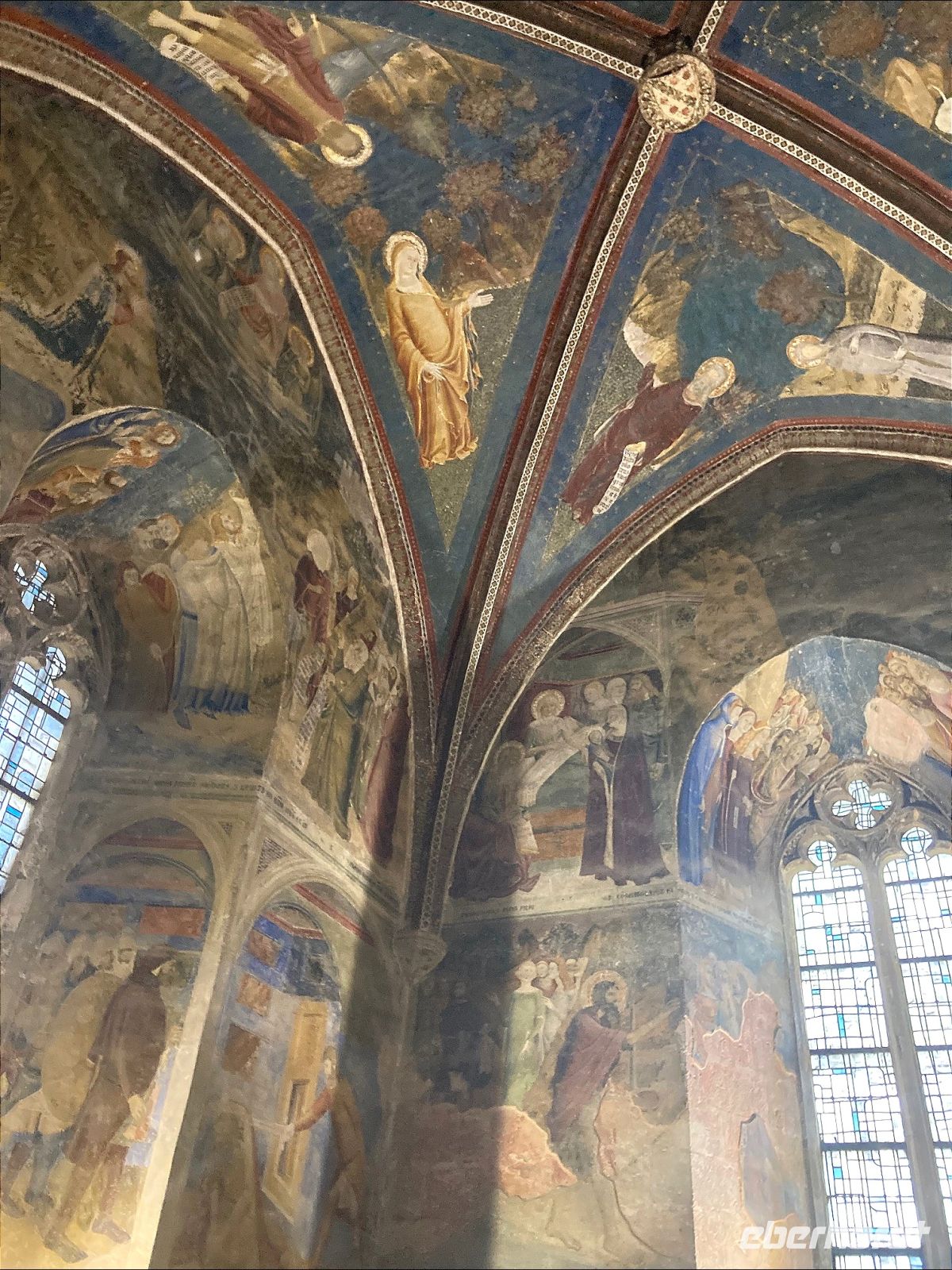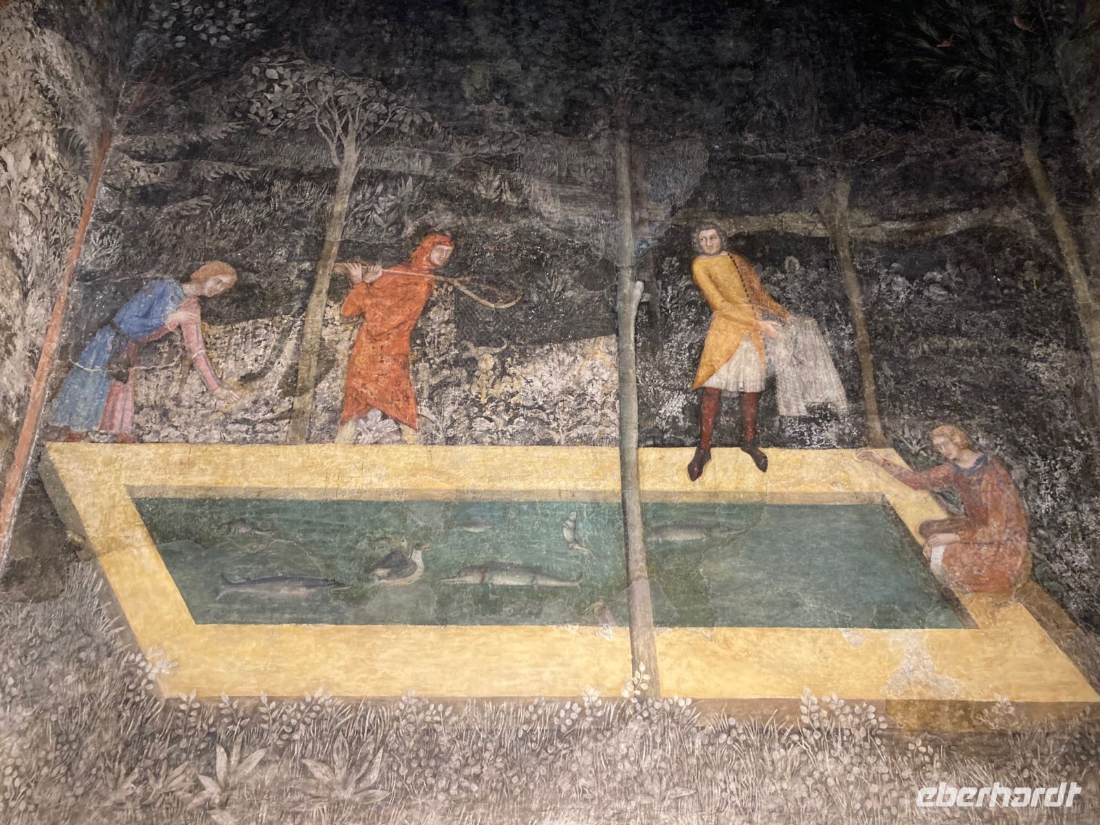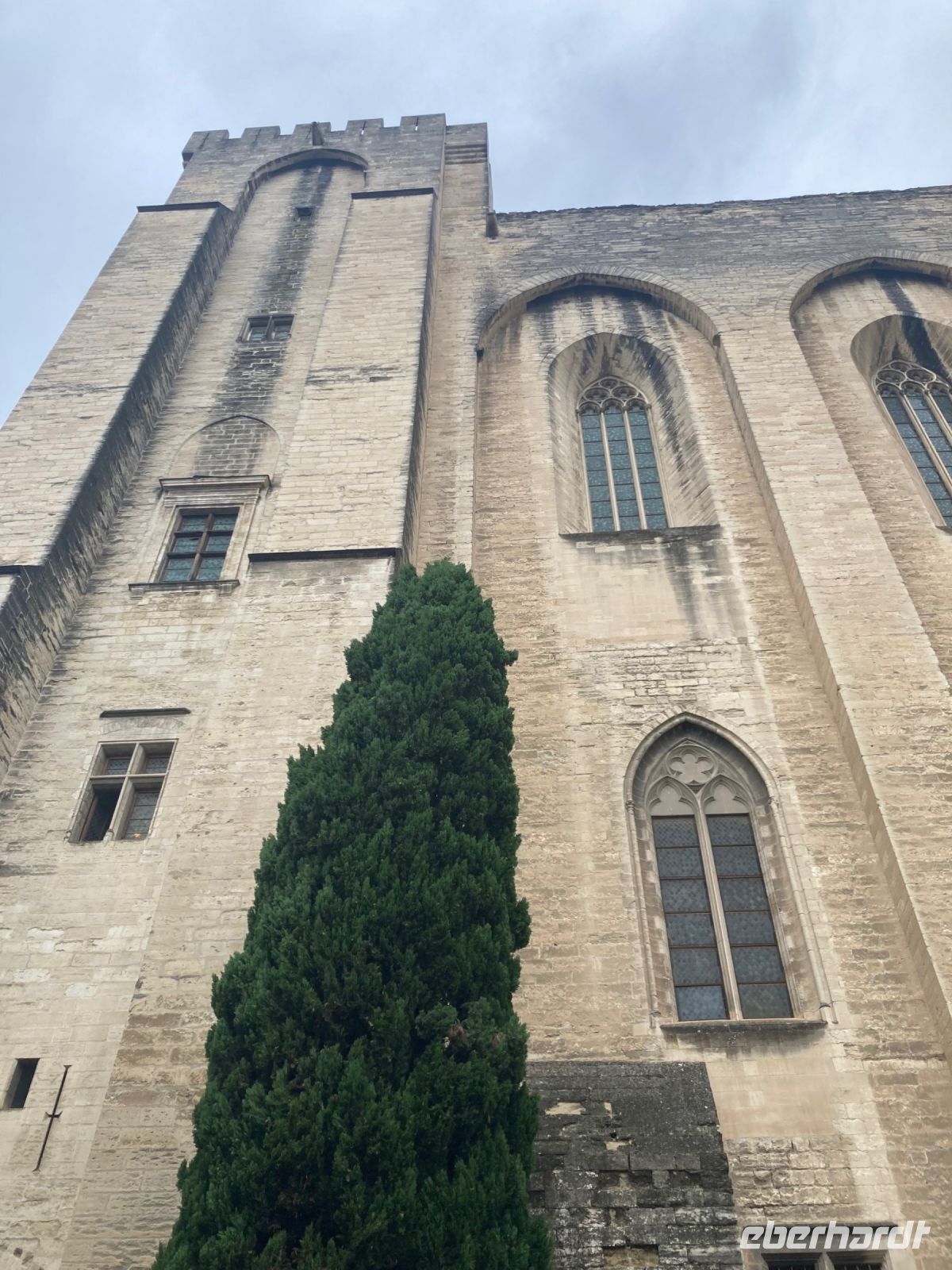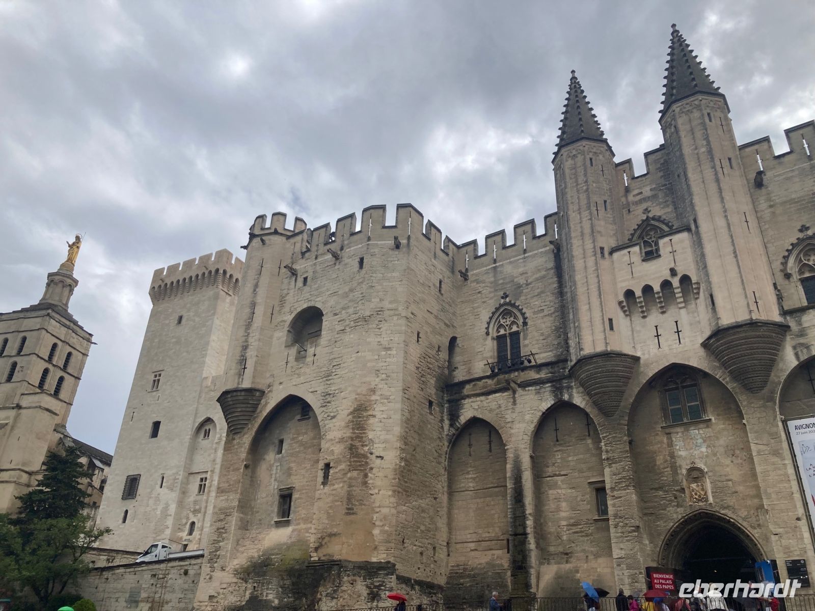 Heute lässt uns das Wetter etwas im Stich, sodass wir uns nach der Ankunft in Avignon sogleich dem großen Papstpalast zuwenden, obwohl wir eigentlich noch gar nicht dran wären. So können wir relativ trocken die riesigen Gemächer des Palastes in Augenschein nehmen. Zwar bereiten uns die angebotenen modernen Histopads anfangs noch Schwierigkeiten , denn für die filmische Einführung nehmen wir uns natürlich keine Zeit , doch spätestens im dritten, vierten Zimmer haben wir die Wirkweise begriffen und erfreuen uns an der virtuellen Darstellung der ehemaligen Gemächer.