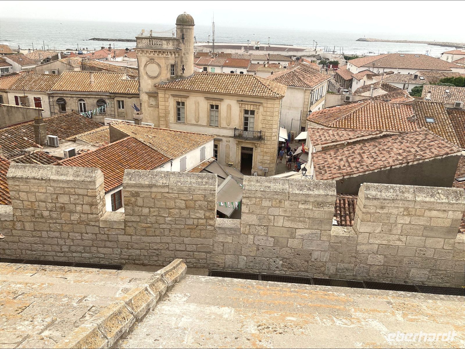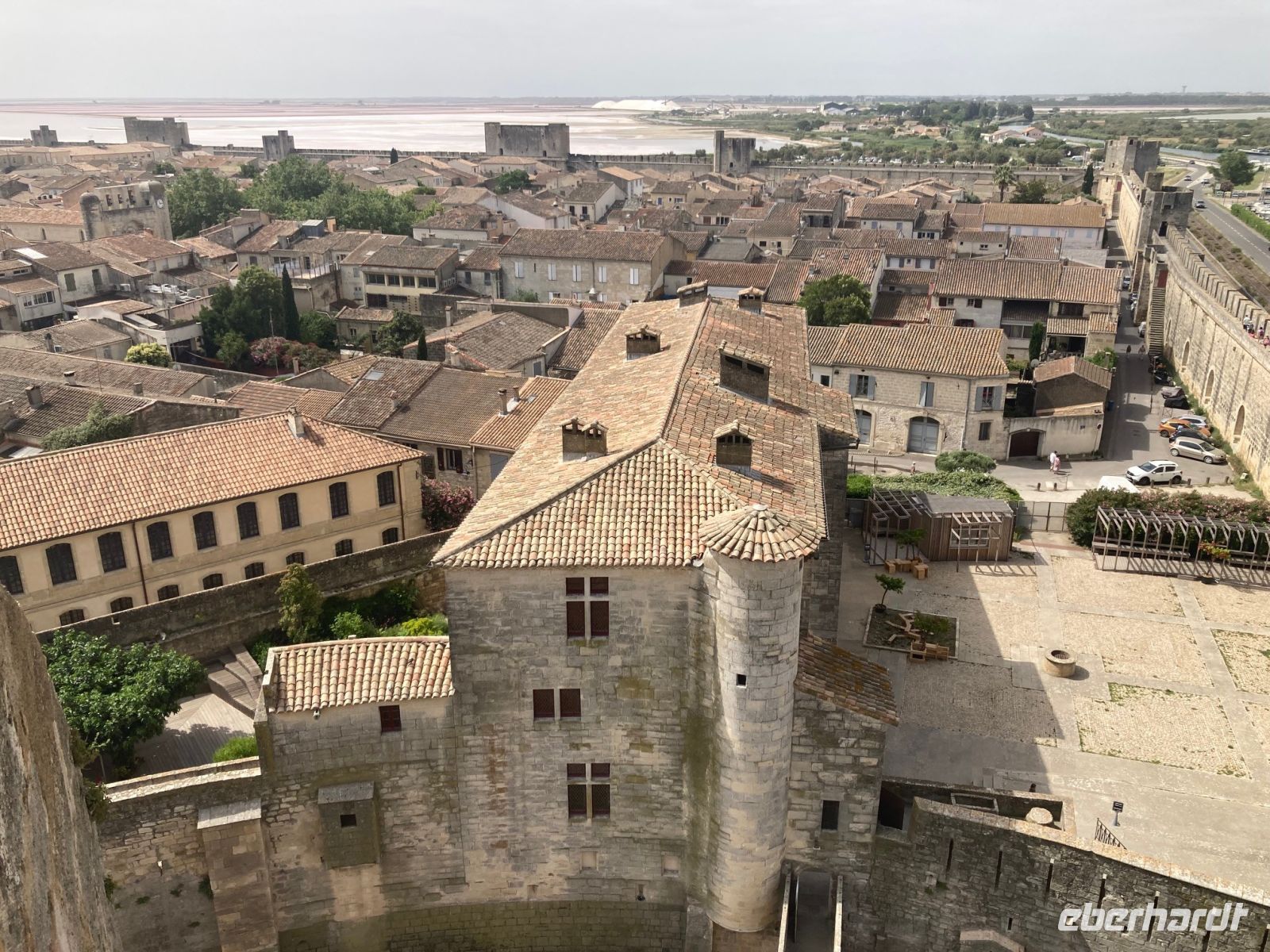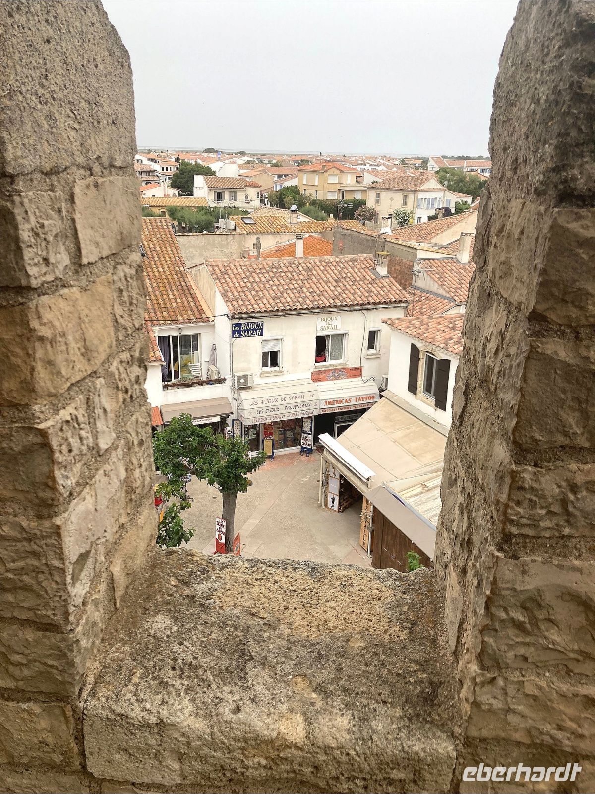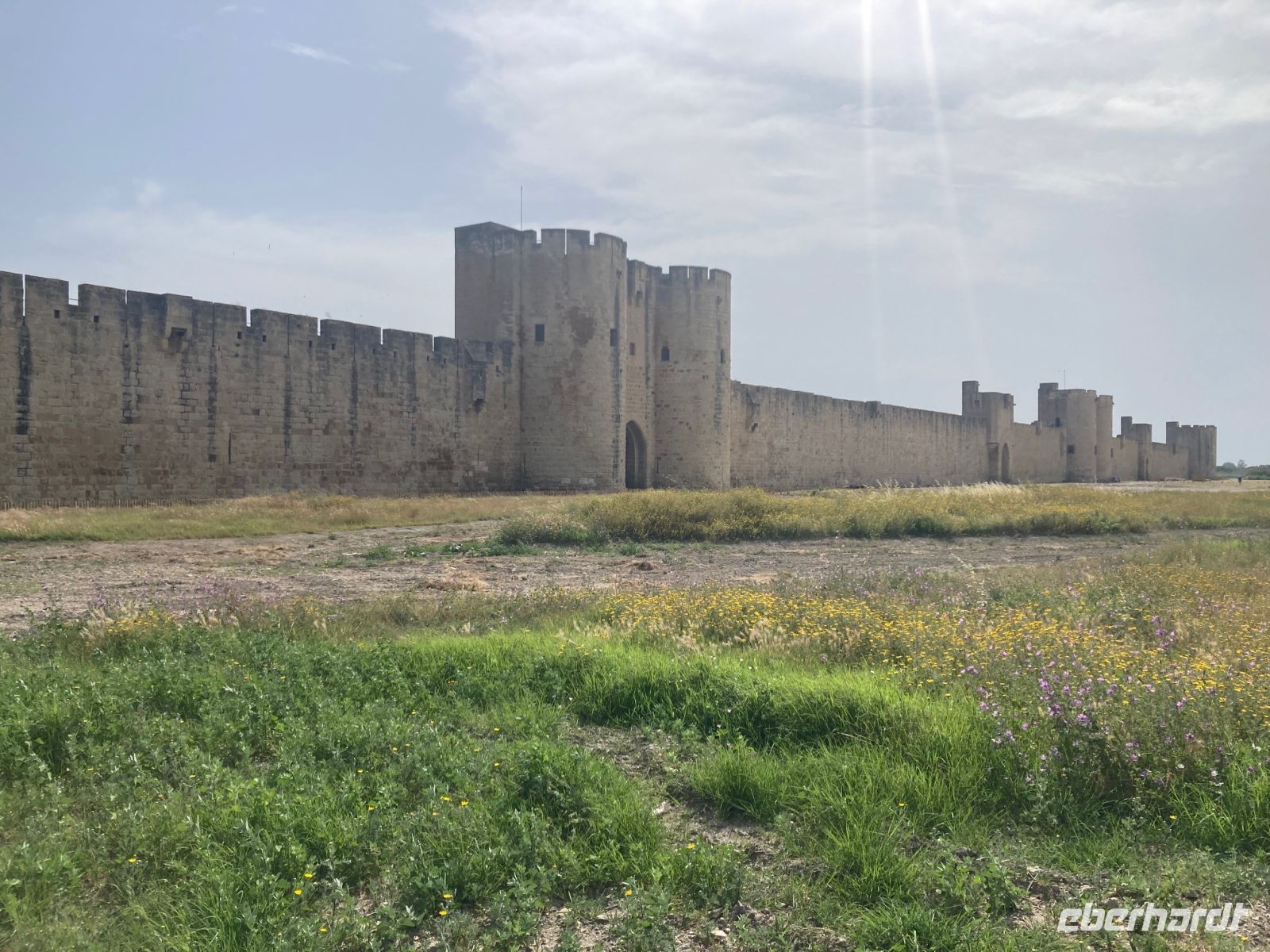 Nach so vielen Stadtbesichtigungen wollen wir heute in die Landschaft des Rhonedeltas, die Camargue, eintauchen. Zuerst lassen wir uns von David zu einem der Brackwasserseen in der Nähe von Le-Grau-du-Roi fahren, an dem fast immer rosarote Flamingos zu sehen sind, und werden auch dieses Mal nicht enttäuscht. Und dann ist es nicht weit nach Aigues Mortes, dem Inbegriff einer mittelalterlichen Stadt. Umgeben von einer vollständig intakten, trutzigen Stadtmauer diente sie einst dem französischen König Ludwig IX. als Ausgangspunkt für seine Kreuzzüge. Auf die obligatorische Stadtführung, die am zentralen Platz mit der Statue des Königs endet, lässt der Reiseleiter für die Wissbegierigen noch einen Rundgang durch den Tour Constance und über die komplette Stadtmauer folgen, was in der zur Verfügung stehenden Zeit nur knapp zu schaffen ist.