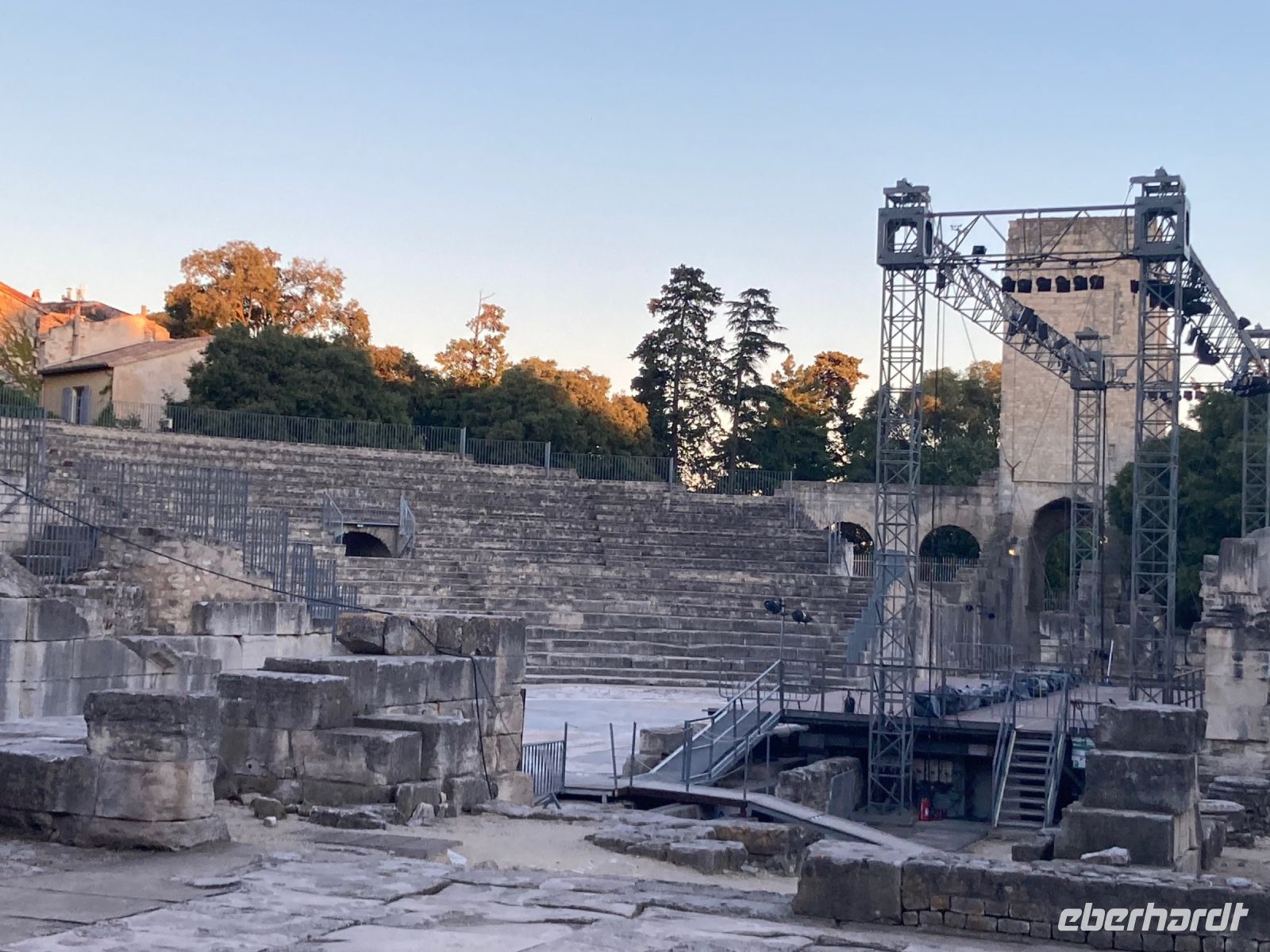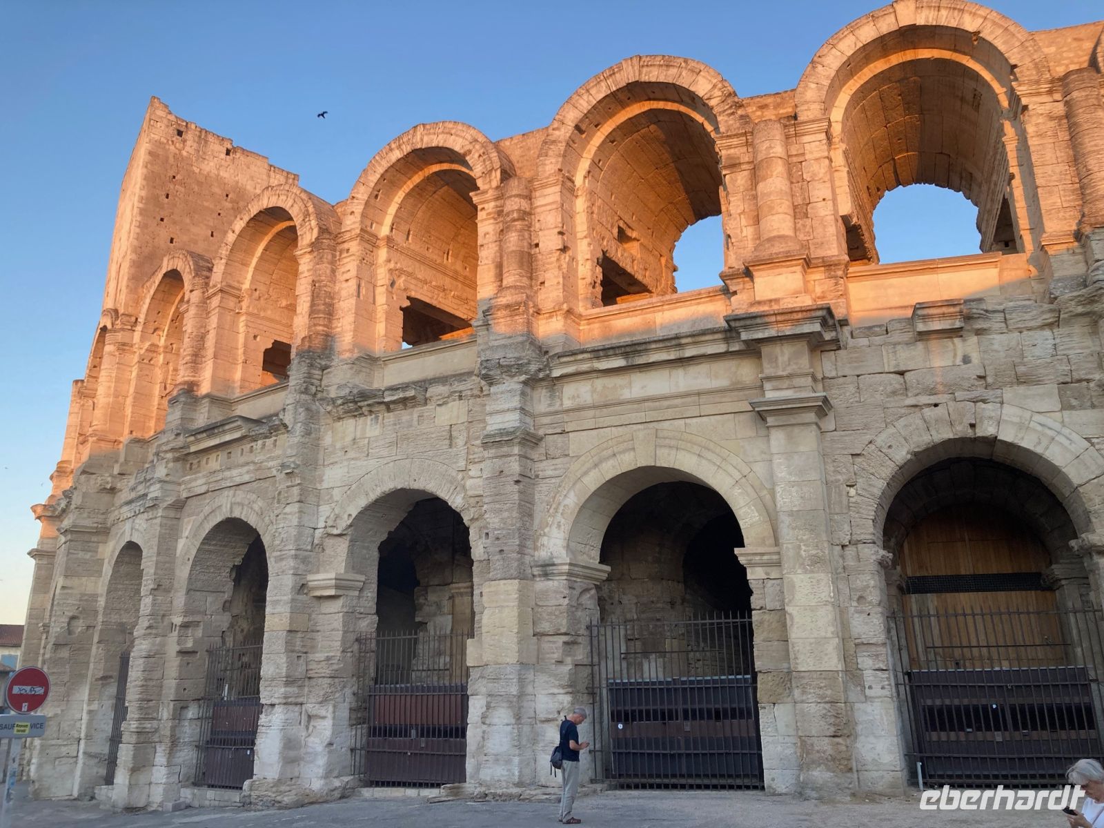 Als nächstes wenden wir uns der römischen Vergangenheit von Arelate zu, besuchen das Theater, von dem nicht mehr allzu viel erhalten ist, weil es über Jahrhunderte als Steinbruch für nachfolgende Gebäude missbraucht wurde. Durch die halbrunde Form herrscht aber immer noch eine gute Akustik vor, was der Reiseleiter durch die Rezitation eines Hölderlin-Gedichtes verdeutlicht. Und dann sind wir schon an der Arena mit ihren 60 großen Arkadenbogen, die in der Römerzeit als blutige Veranstaltungsstätte diente, im Mittelalter die gesamte Stadt beherbergte und heute der Ort zahlreicher Stierkämpfe unterschiedlicher Prägung ist. Dass bei so vielen Sightseeing-Momenten eine Teilnehmerin kurzfristig verloren geht, tut der guten Stimmung keinen Abbruch.