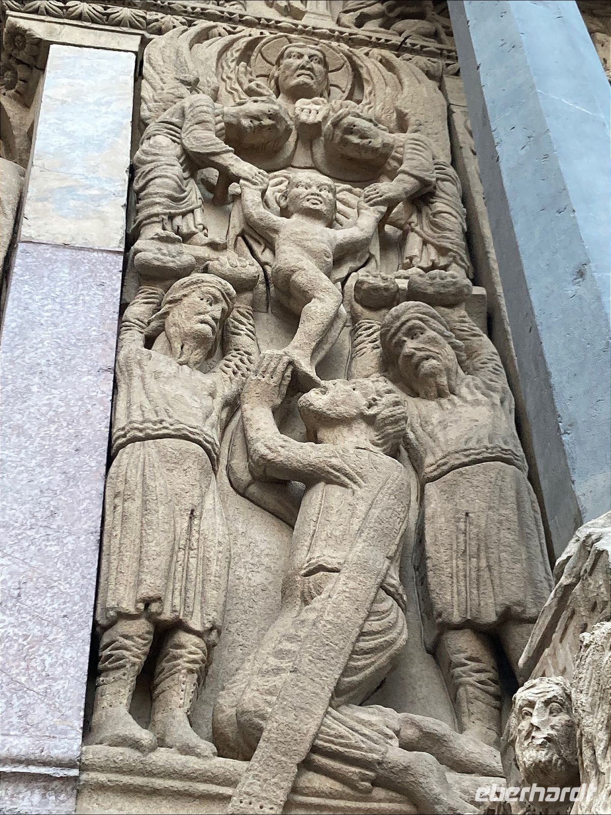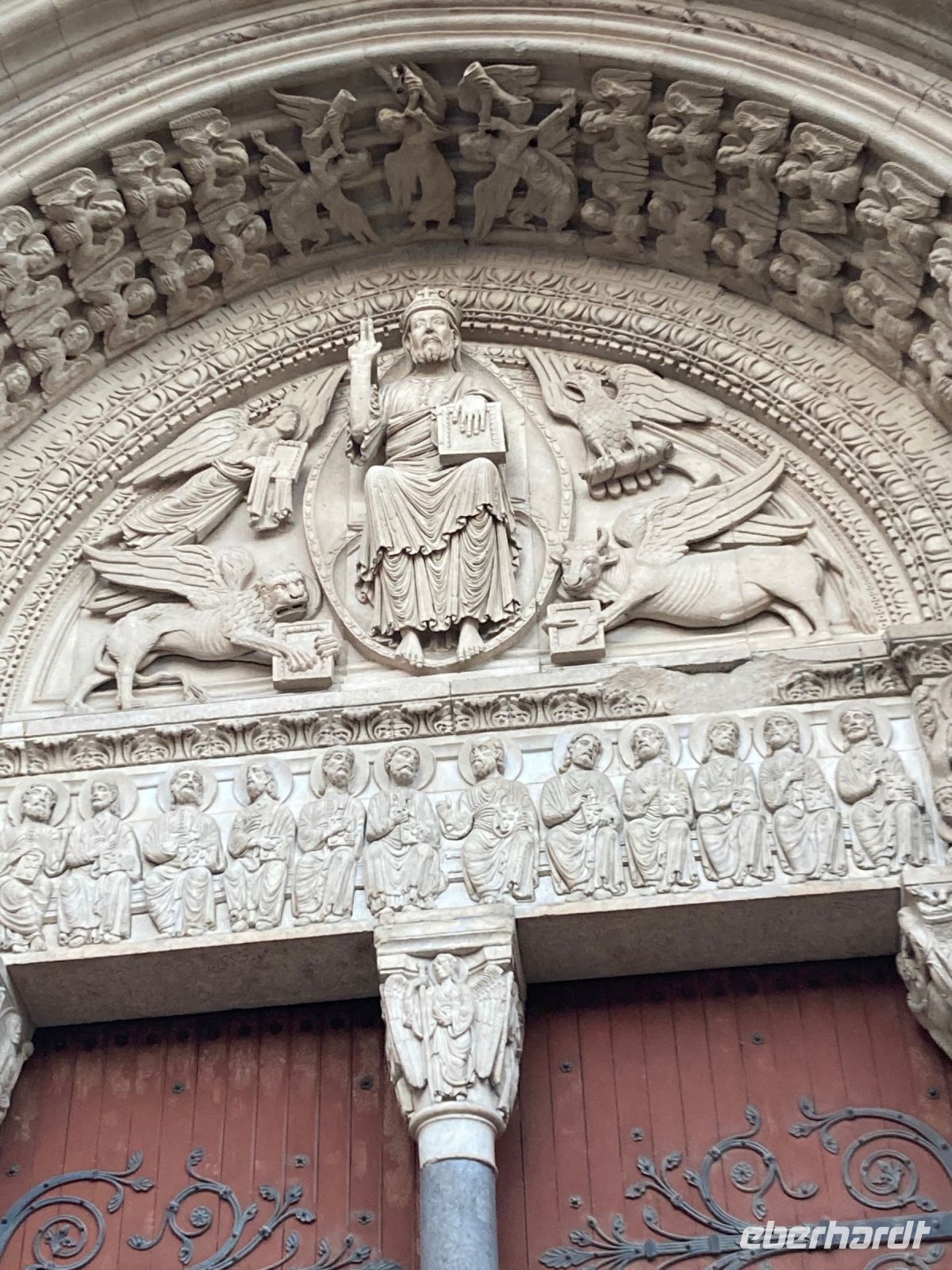 Durch enge, verwinkelte Gassen gelangt die Gruppe zum großen zentralen Platz, dem Place de la Republique, der Zugang zum Rathaus mit seiner kunstvollen Decke bietet und den Blick auf eines der schönsten Kirchenportale freigibt. Vor dem hoch oben thronenden Weltenrichter Christus können alle den Zug der Gerechten in Abrahams Schoß bewundern und sich beim Anblick der Verfluchten, der von den Teufeln Gehetzten Gedanken über die eigene Position am Jüngsten Tag machen.