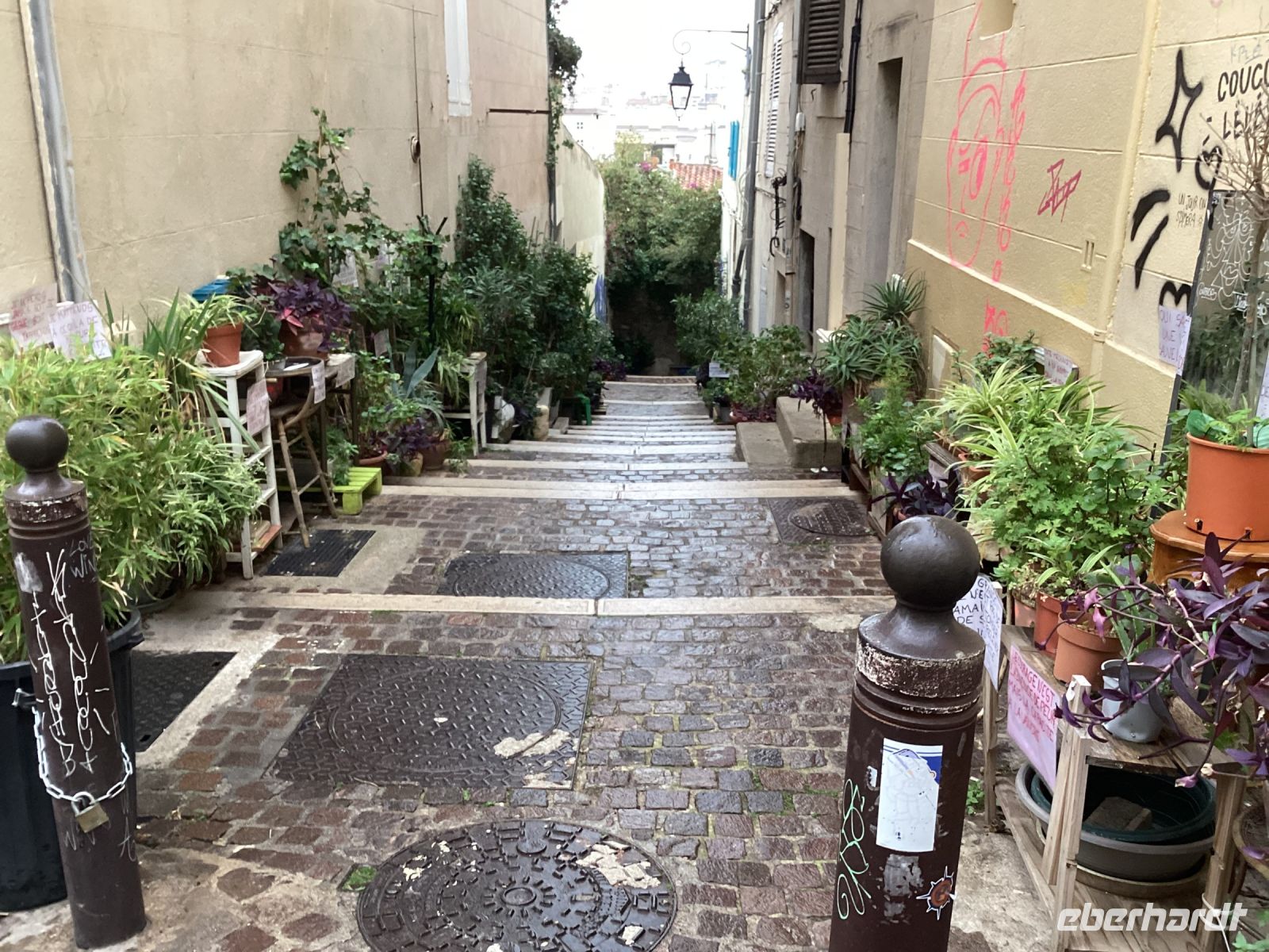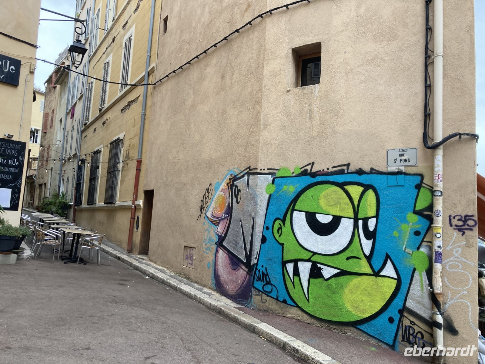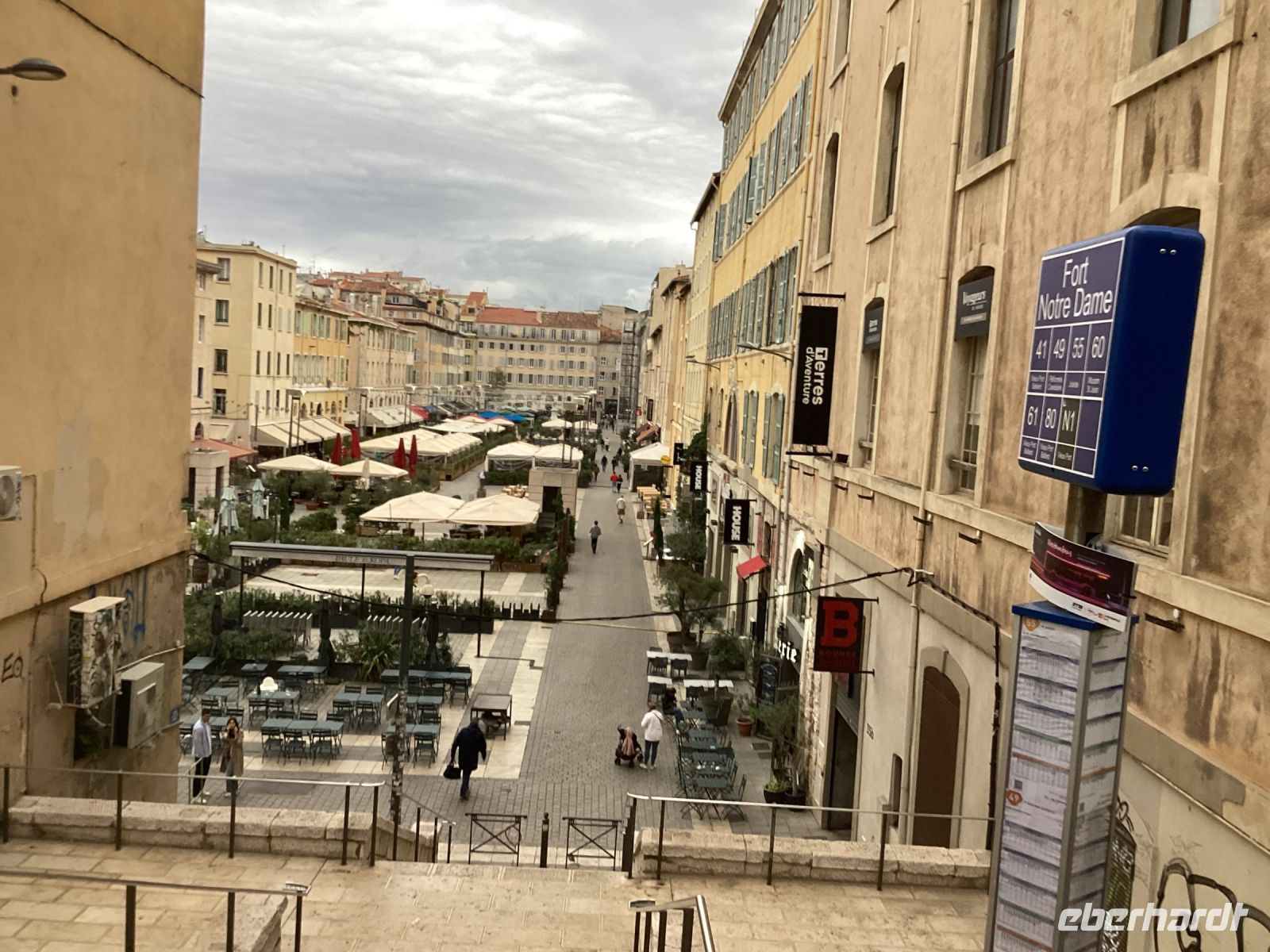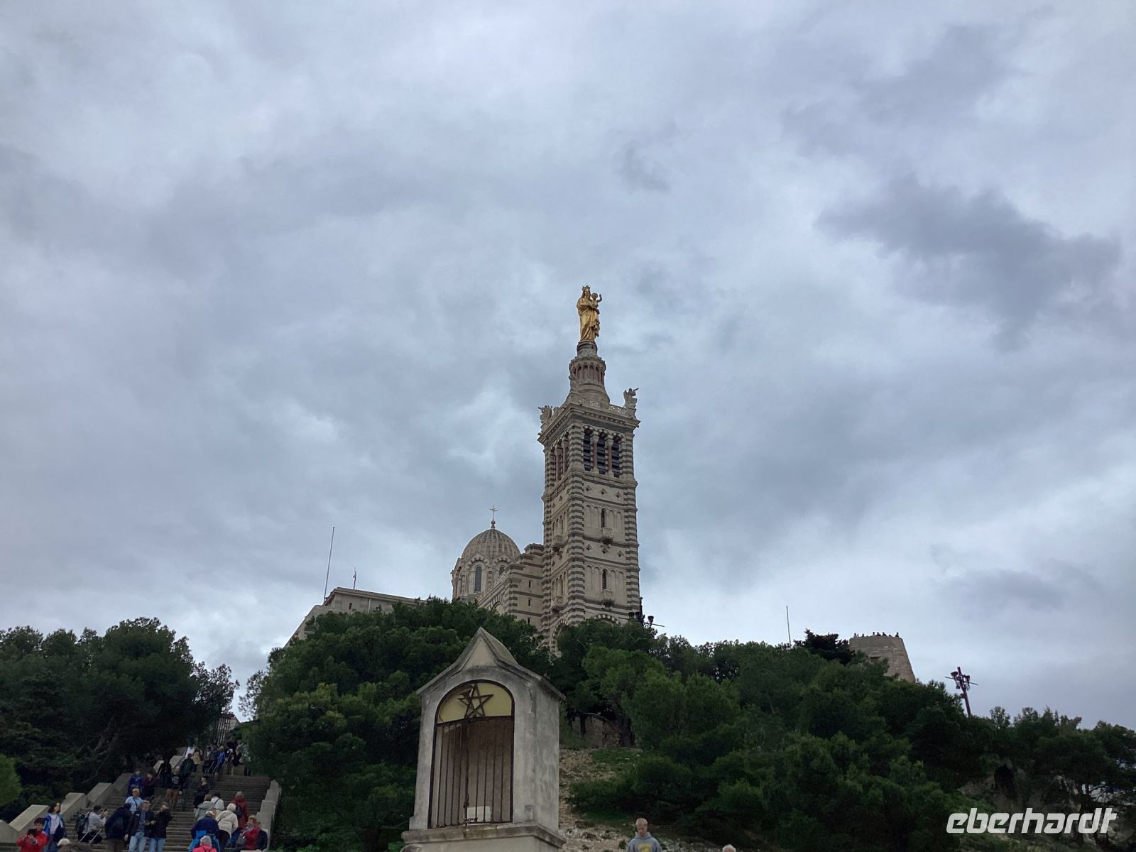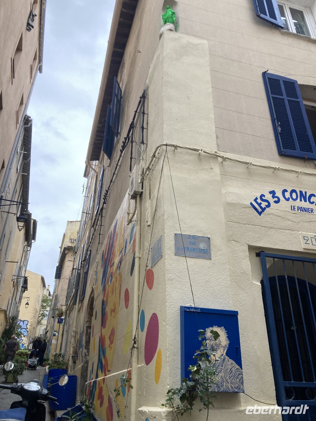 Ein bisschen wackelt unser Boot schon, aber der Kapitän hat alles im Griff. Wieder festen Boden unter den Füßen geht es mit der Bahn wieder zum Bus und dann nach Marseille. Wir fahren über die Küstenstraße und treffen dann auf Nathalie. Sie besteigt den Bus und wird uns nun Wissenswertes über diese besondere Stadt erzählen. Ihr Hafen ist einer der ältesten des Mittelmeeres und der neue Hafen ist ein begehrtes Ziel für Kreuzfahrten. So leider auch heute: Fünf Kreuzfahrtschiffe liegen im Hafen und auch wenn die Stadt gut mit vielen Menschen umgehen kann, für uns ist der Nahkontakt mit so vielen Menschen nach einer gemütlichen Woche doch gewöhnungsbedürftig. Bedauerlicherweise schließt auch die Basilika Nôtre Dame de la Garde auch früher ihre Tore um für die nötige Ruhe für den Gottesdienst zu sorgen. Auch wenn nun wieder Regen einsetzt, wollen wir doch noch einen schönen Teil der Stadt kennenlernen - le Panier. Kaum zu glauben, das dieses Quartier tatsächlich abgerissen werden sollte. Heute ist hier viel renoviert worden und es wird auch weiter erneuert. Heute Freiluftgalerie ist die Streetart, die hier überall bunt auf den Häuserwänden zu sehen ist. Nun sind wir aber doch etwas durchfeuchtet und fahren zu unserem Hotel, welches sich mitten im Zentrum befindet. Unsere Zimmer sind schnell bezogen und nun bleibt ein wenig Zeit zum Ausruhen, schließlich geht es zum Abendessen in ein Restaurant mit einem kleinen Fußweg.