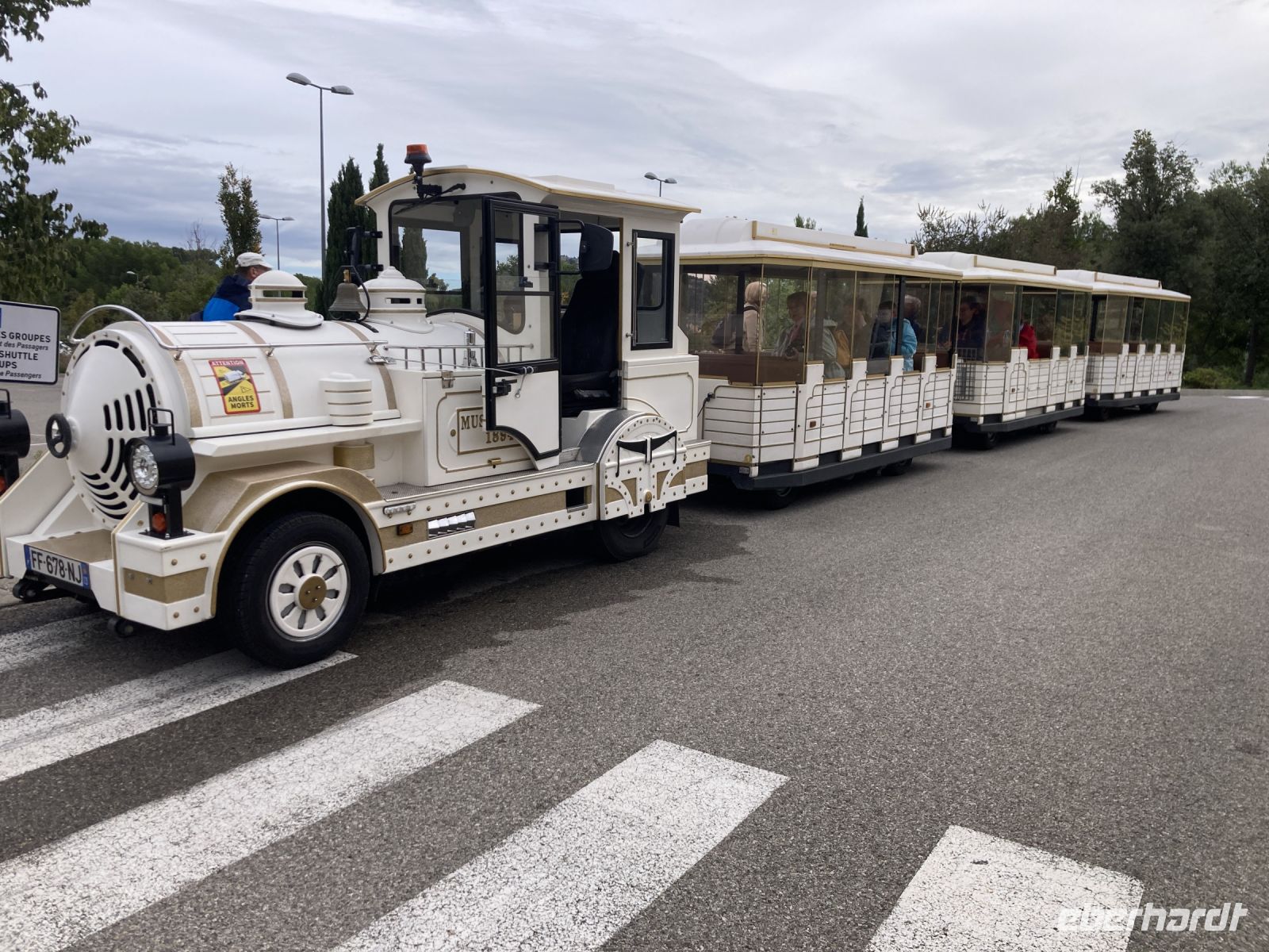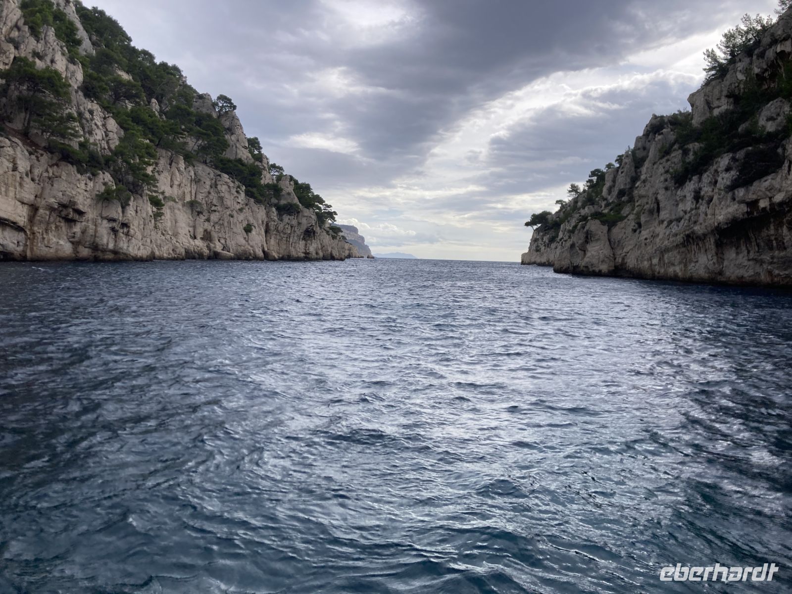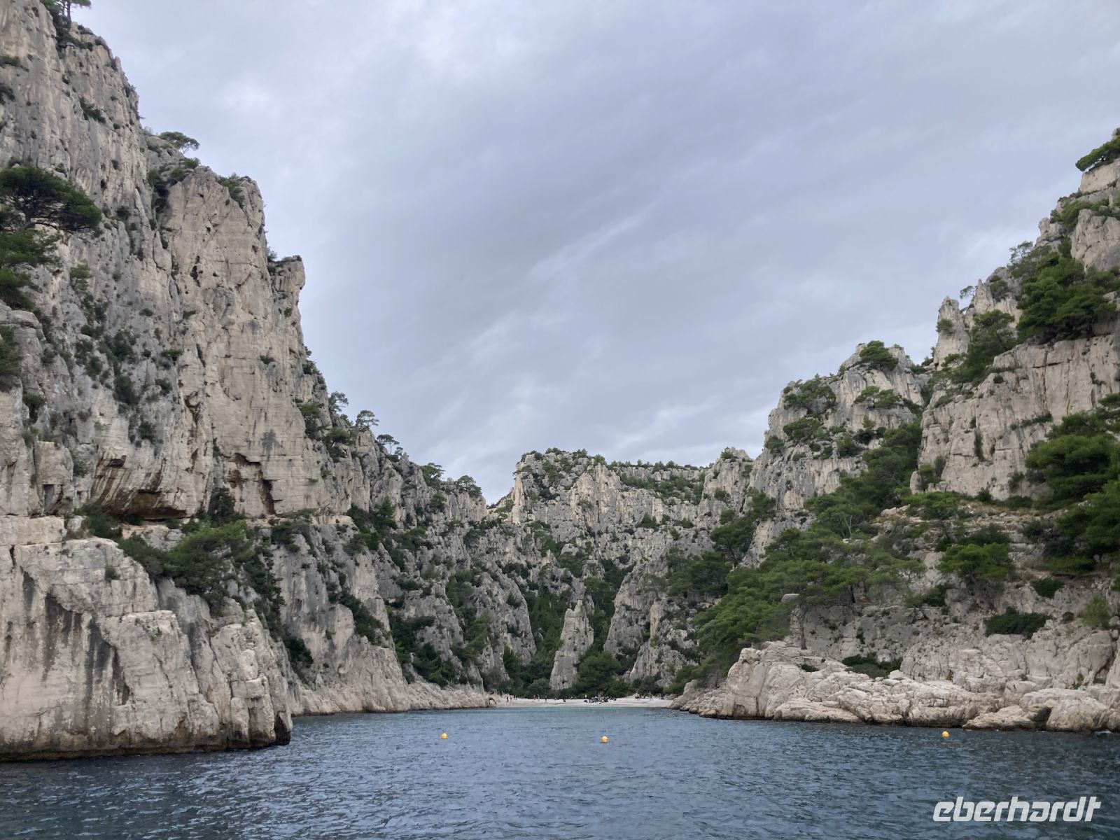 Da sich Cassis größter Beliebtheit erfreut, dürfen wir mit dem Bus nicht hinunterfahren. Oberhalb des Altstadtkern heißt es für uns umsteigen in eine kleine "Bimmelbahn". Zugegeben, eine Bahn ist es nicht, aber wir fahren gemütlich mit dem Fahrzeug nach unten und später auch wieder hinauf. Unten angekommen bleibt noch ein wenig Zeit für das eine oder andere Foto und dann besteigen wir unser Boot. Mit ein bisschen Wellen müssen wir rechnen, auch wenn es hier im Hafenbecken das Meer noch sehr ruhig wirkt. Wer die Schönheit dieser Küste mit eigenen Augen sehen möchte, hat nur zwei Möglichkeiten: per Boot oder zu Fuß. Und tatsächlich sehen wir in den Buchten große Gruppen, die Wanderungen vorgenommen haben und nun ihre wohlverdiente Pause einlegen.