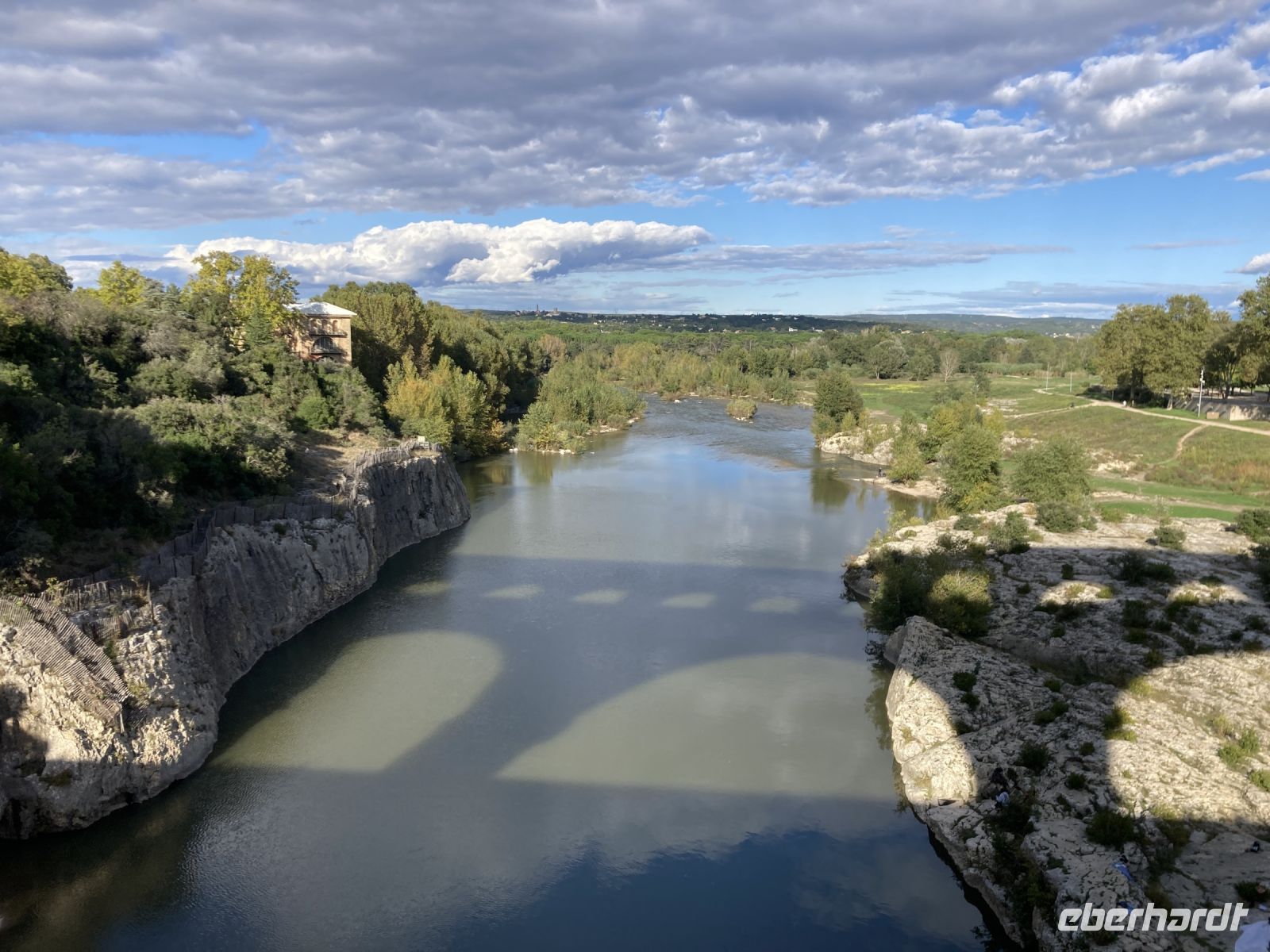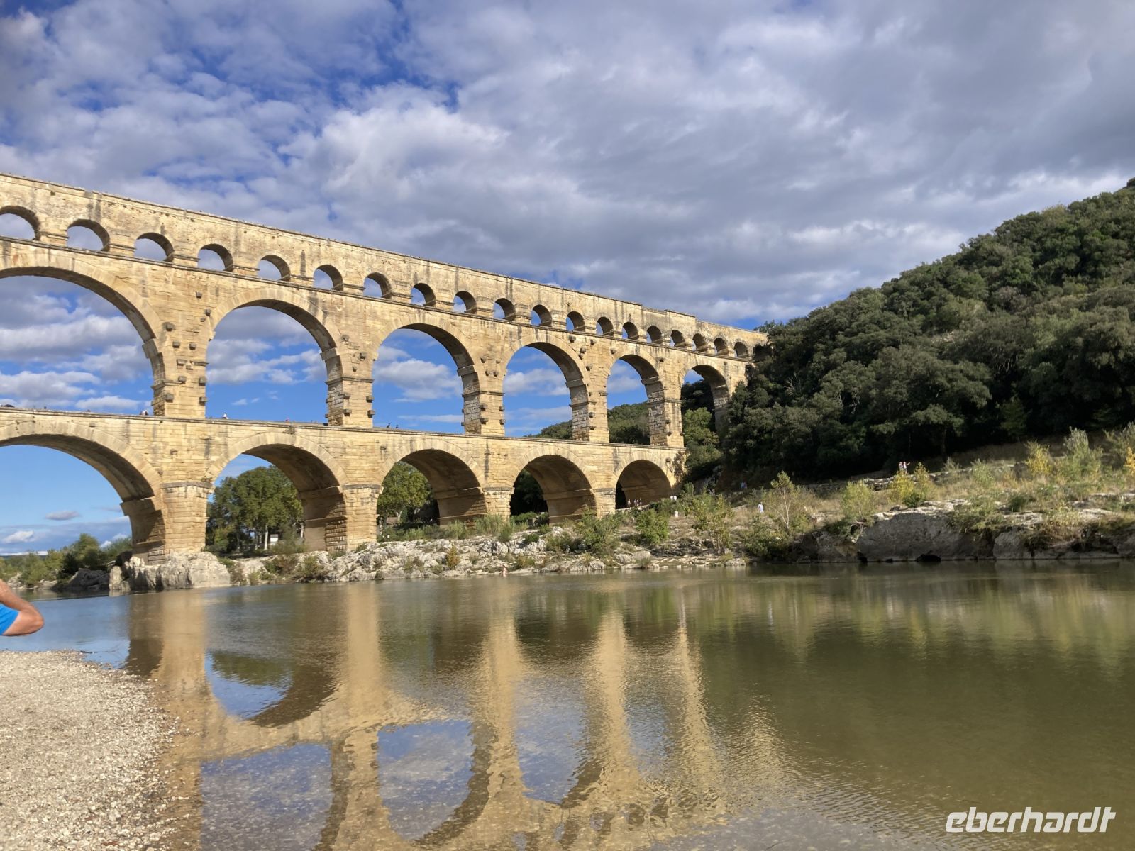 Auch wenn Avignon eigentlich schon ein Höhepunkt des Tages ist, setzen wir noch einen besonderen Schlusspunkt. Mit dem Pont du Gard besuchen wir eine Meisterleitung der antiken Baukunst. Auch dieses Aquädukt stand aus dem ersten Jahrhundert n. Chr. Mit der Höhe von 49 Meter ist der Pont du Gard der höchste Aquädukt auf der Welt. Erbaut wurde er zur Wasserversorgung der Stadt Nimes. Und heute hat uns die Sonne in ihr Herz geschlossen. Ein strahlend blauer Himmel hat uns heute schon den ganzen Tag begleitet und nun sorgt das Licht auch noch für wunderbaren Schattenspiele.