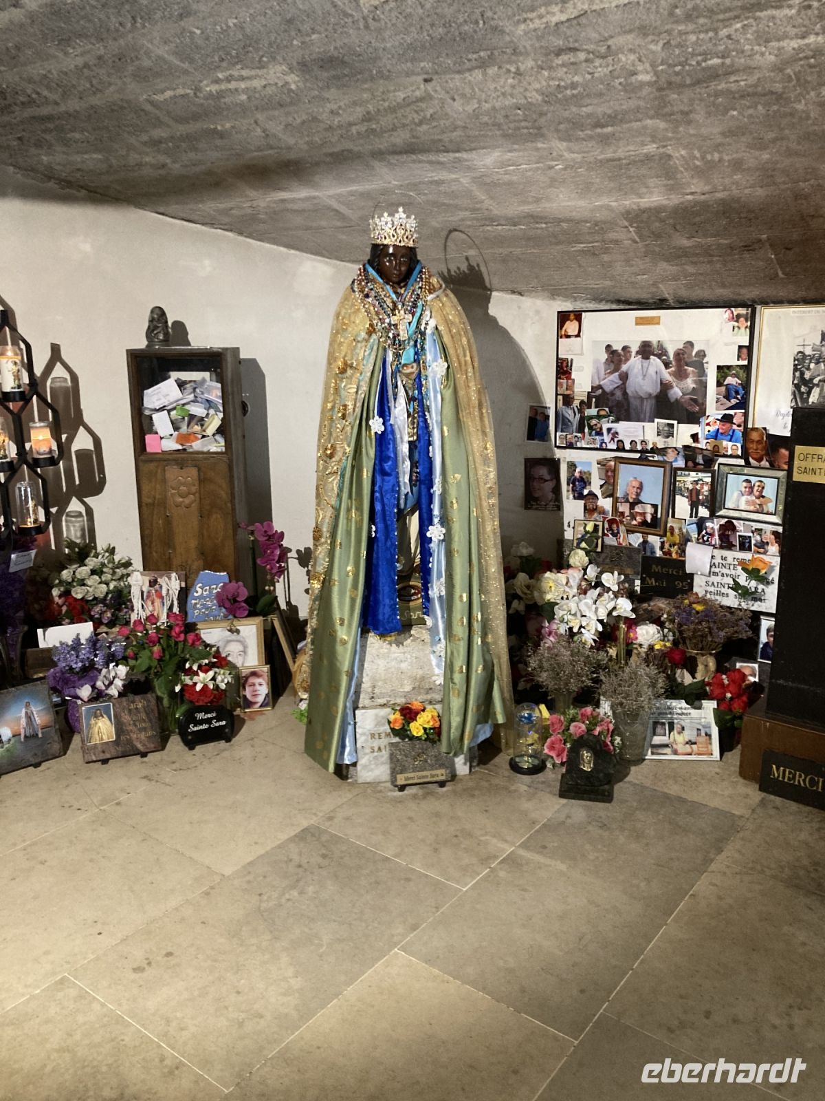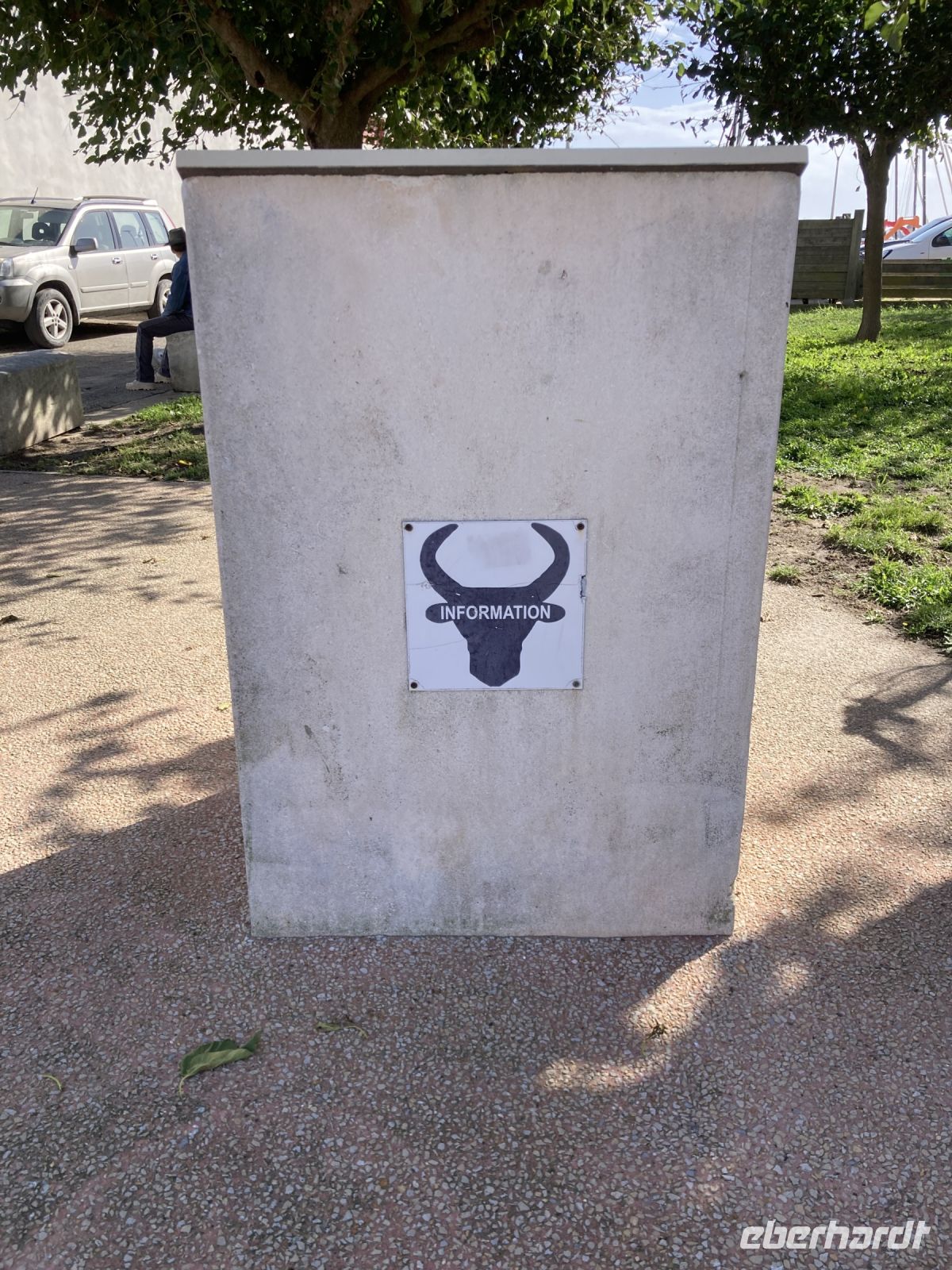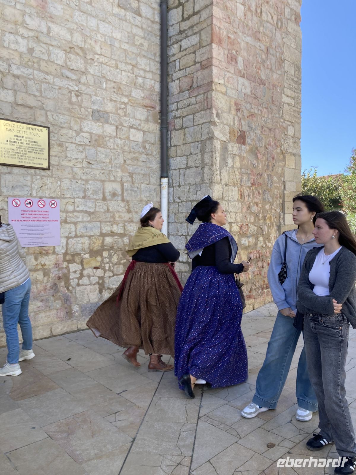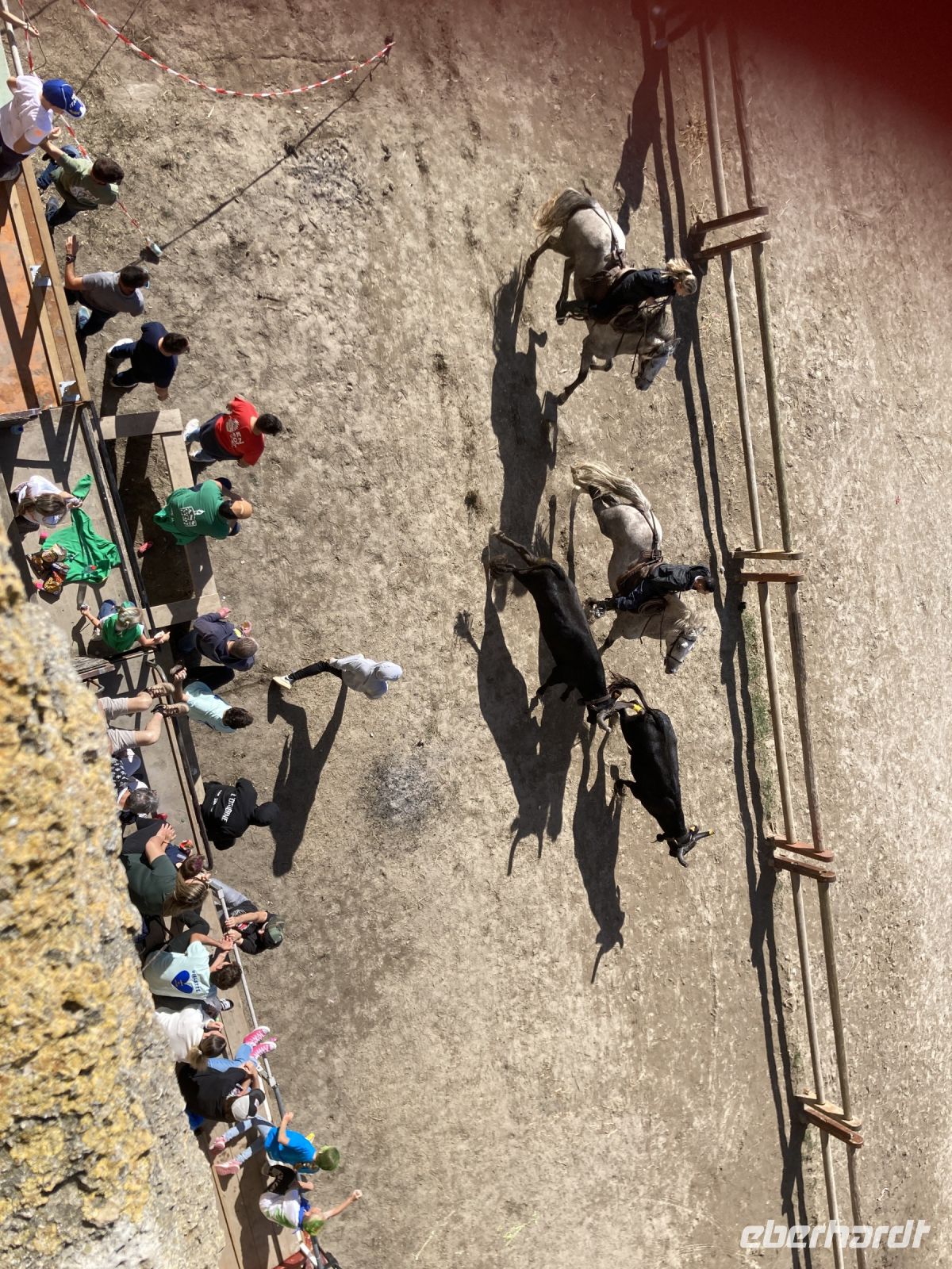 zu den Arenen gefahren zu werden. Schnell wird deutlich, der Stiefkampf ist hier fest verwurzelt in der Kultur der Region. Wir wollen unseren Tag in der Camargue fortsetzen. Eigentlich stünde Les-Saintes-Maries-de-la-Mer auf dem dem Programm. Da eine Reise in Frankreich ohne Besuch einer Weinkellerei zwar möglich, aber sinnlos ist (eine kleine Anlehnung an Loriot), folgt nun eine Stippvisite in einer Cave. Drei Weine werden uns präsentiert und wir erfahren auch, warum der Rosé hier Grauer Wein heißt. Mit diesem kleinen Aperitif geht nun an Meer. Doch in Saintes-Maries-de-la-Mer haben wir nicht nur Nahkontakt mit dem Mittelmeer, welches sich heute mit seinen Wellen als durchaus wild präsentiert, wir besuchen auch einen Wallfahrtsort. Auch wenn wir es uns heute nicht vorstellen können, wirkt der Ort trotz einiger Touristen eher beschaulich, jedes Jahr am 24. und 25. Mai verändert sich dieser Eindruck dramatisch. Immer Ende Mai treffen sich Roma um den beiden Marien und vor allem der Dienerin der Heiligen Sarah zu huldigen. Ihre Statue befindet sich in der Kirche und Danksagungen und Blumen zeugen davon, welche Bedeutung sie für die Roma hat. Heute ist keine Wallfahrt aber in der Arena tut sich etwas. Vielleicht ist ja einer der Stiere, die wir heute morgen in Aigues-Mortes in der Arena zu sehen. Bei den Stierkämpfen, die hier heute zu sehen sind, handelt es sich um die Courses camarguaises. Die Stiere messen sich mit der Geschicklichkeit der Razeteurs, diese versuchen eines der Attribute, also kleine Bändchen oder Blüten, die an den Hörnern befestigt sind, zu bekommen. Schnelligkeit, Geschicklichkeit und eine gute Portion Mut gehört schon dazu.