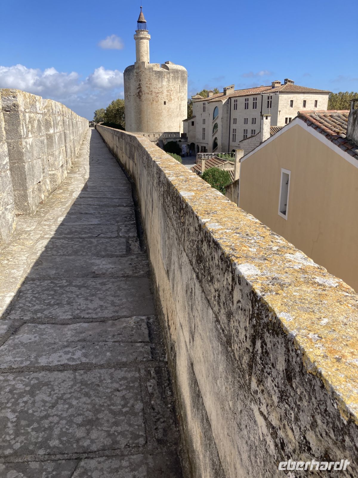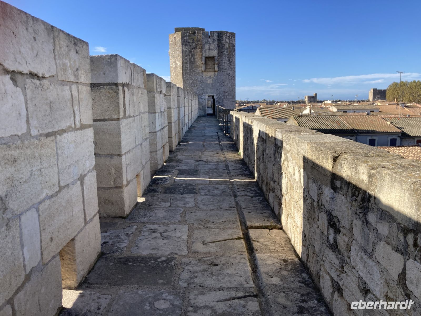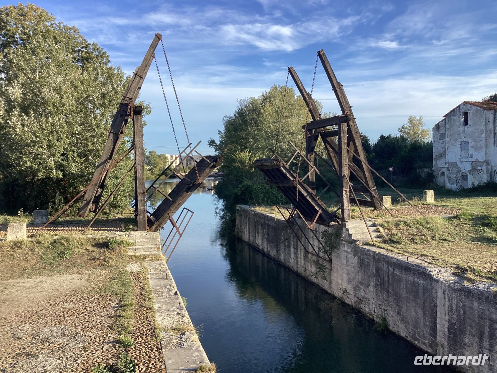 Nachdem wir nun schon an einigen Stellen auf unserer Reise auf Vincent gestoßen sind, wollen wir heute auch gleich den Tag mit einem besonderen Motiv des Malers beginnen. Die Brücke von Langlois hat Vincent gleich mehrfach im Bild festgehalten. Die alte Zugbrücke befindet sich etwas außerhalb des Zentrums von Arles. Vincent war jedoch nicht nur in Ares unterwegs, sondern erkundete die Umgebung und natürlich war er auch wie wir in der Camargue unterwegs. Wir setzen unseren Ausflug in Richtung Aigues-Mortes fort. Hier angekommen verstellen uns Lastwagen und Schaustellerbuden den Blick auf die Stadtmauer. Es ist die Woche der Stierkämpfe und es ist gute Tradition, dass diese mit einem Rummel verbunden wird. Um einen schönen Ausblick auf diese Stadt zu erhalten, die tatsächlich auf dem Reißbrett entstanden ist, gehen wir auf die Stadtmauer. Beeindruckend ist ihre Länge, immerhin misst sie 1634 Meter und hinterlässt somit schon einige Spuren auf unseren Schrittzählern. Aber nicht nur die Mauer, sondern auch ihre Türme beeindrucken. Sie dienten nicht nur der Verteidigung, sondern waren auch Rückzugsort und Arsenal. Von hier oben bietet sich jedoch nicht nur ein schöner Blick über die Dächer von Aigues-Mortes, sondern in Richtung Süden zeigt sich auch ein ganz besonderes Farbspiel. Vor uns breiten sich die Salzbecken aus, die je nach Lichteinstrahlung zwischen rosa und violett changieren. Als wäre dies nicht schon reizvoll genug, werden wir nun auf der Mauer noch Zeugen, wie die Stiere für die Stierkämpfe präsentiert werden, um dann in Lastwagen