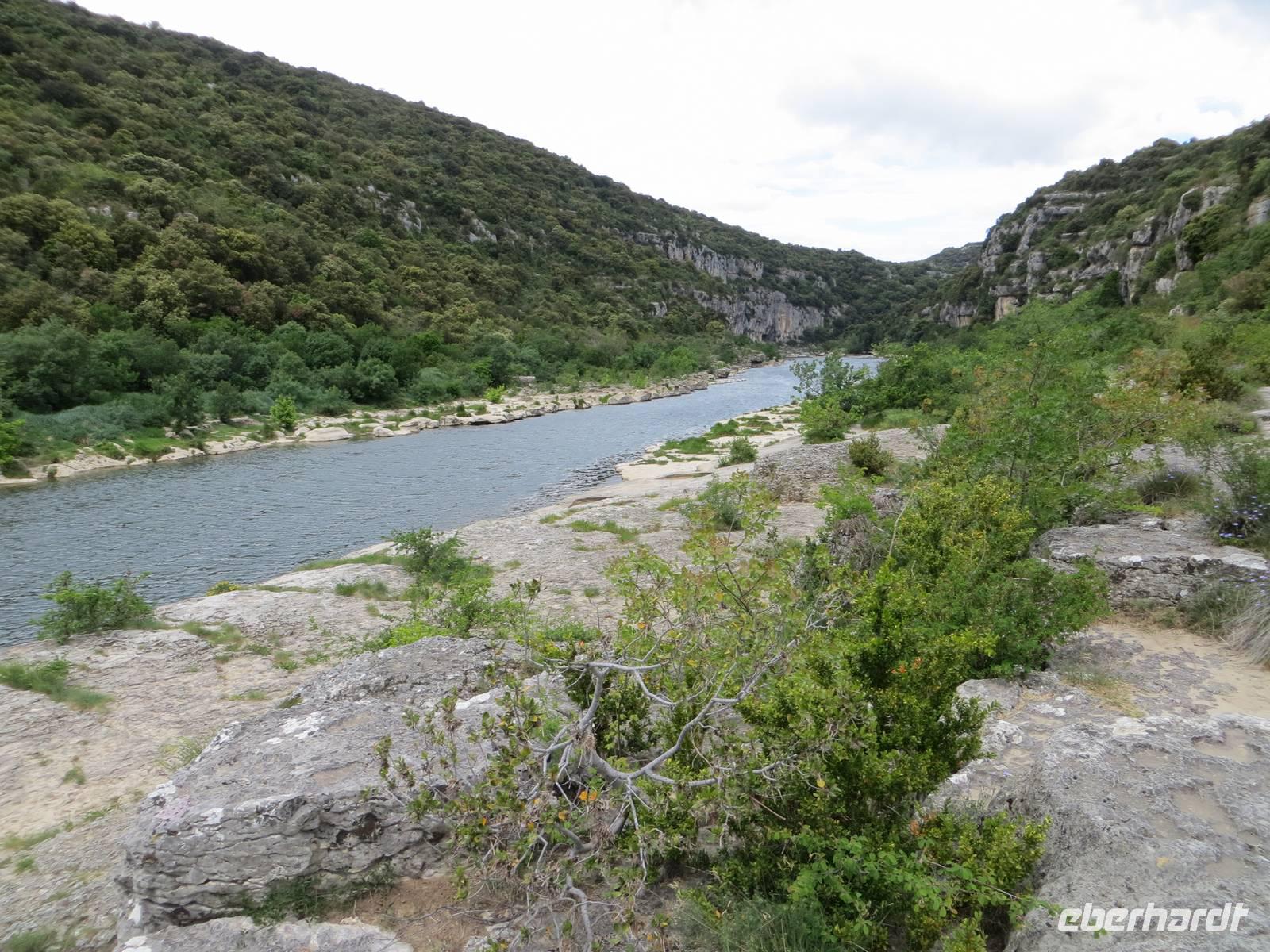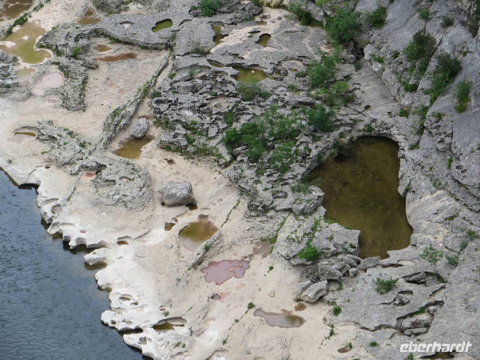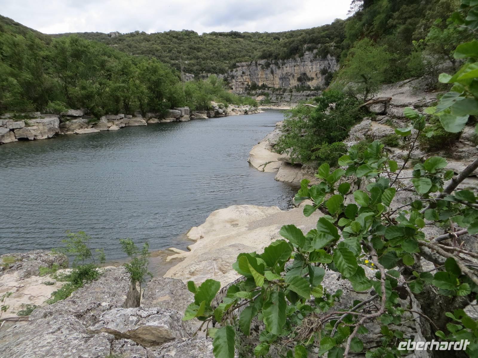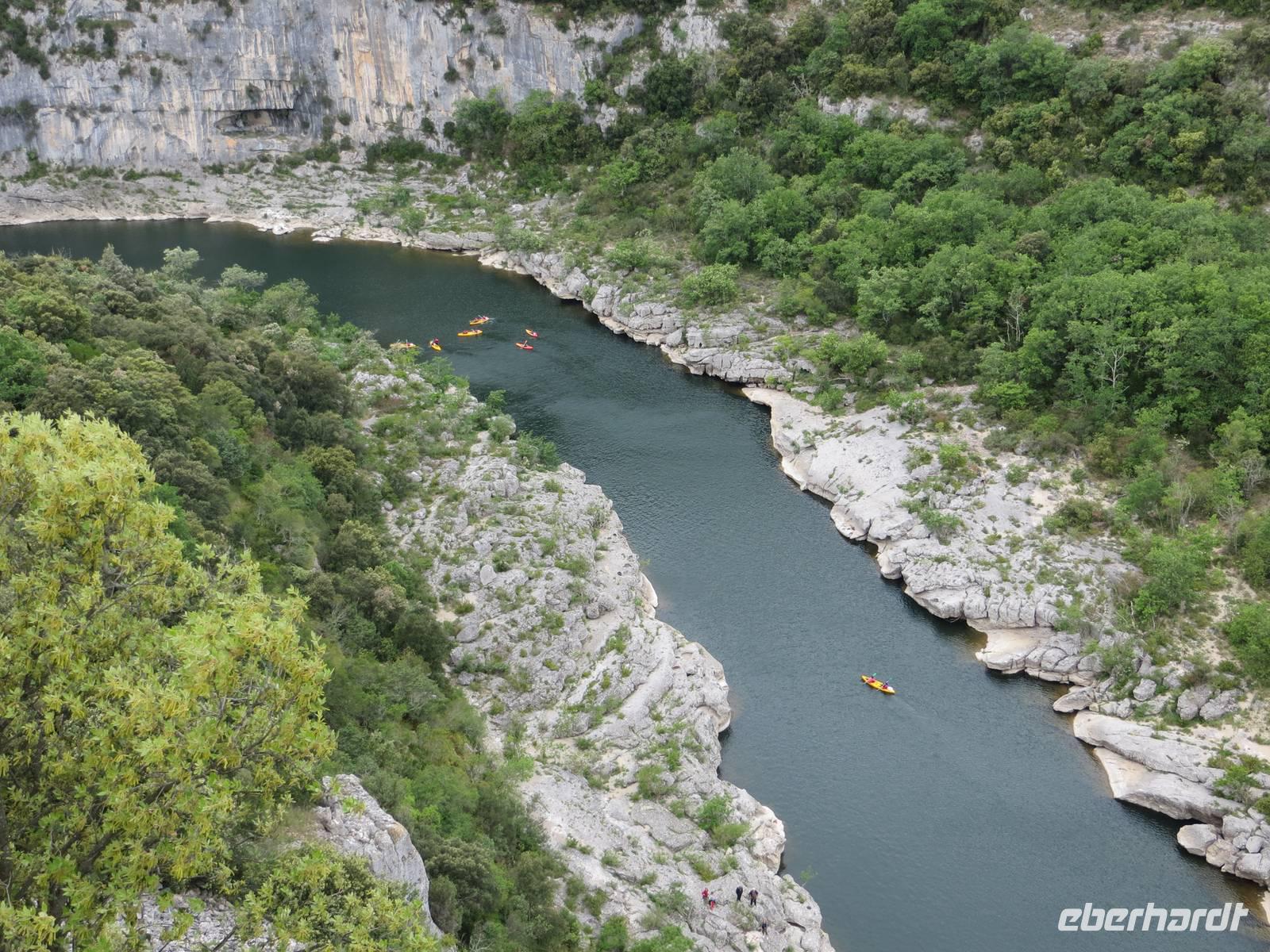 Von Chalon sur Saone ging es die Route Soleil Richtung Süden; in Lyon wählten wir den Weg durch die Stadt. Nach reichlich vier Stunden erreichten wir St. Martin. In Sauze an der der Ardeche starteten wir unsere kleine Kennenlerntour. Direkt am Ufer der Ardeche ging es in die Schlucht. Nach einem Kilometer wurde es zunehmend enger im Tal, aber auch anstrengender. Über uns stiegen die Felsen hundert Meter auf. Teils im niedrigen Gebüsch, teils frei stiegen wir über zunehmend rutschigen Fels auf schmalen Felsbändern, unter uns der Fluss. Nach einer Stunde hatten wir eine Flussbiegung erreicht, wo der Fluss in Jahrtausenden Auswaschungen vorgenommen hatte und Wasserlachen in Felslöchern hinterlassen hatte. Hier wendeten wir kurz bevor ein Regenschauer niederging. Dieser produzierte auf den Felsen unseres Rückweges einen schmierseifenartigen Belag. Mit gegenseitiger Hilfe erreichten wir trockene Flussniederungen und den Bus. Mit diesem ging es über die Panoramastraße entlang der Ardeche mit mehreren Fotostopps. Keine Chance am Pont d' Arc zu halten. In großer Runde fuhren wir über Vallon Pont d' Arc, Barjac, Bagnols nachAvignon, wo wir am Südring unser Hotel ibis erreichten.