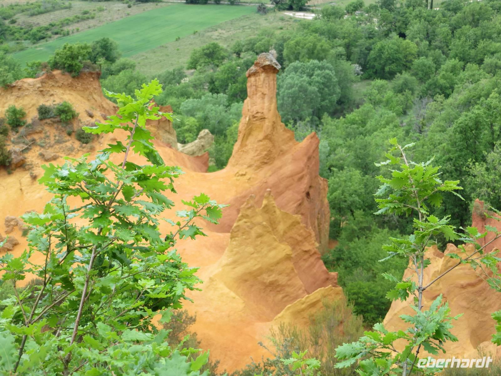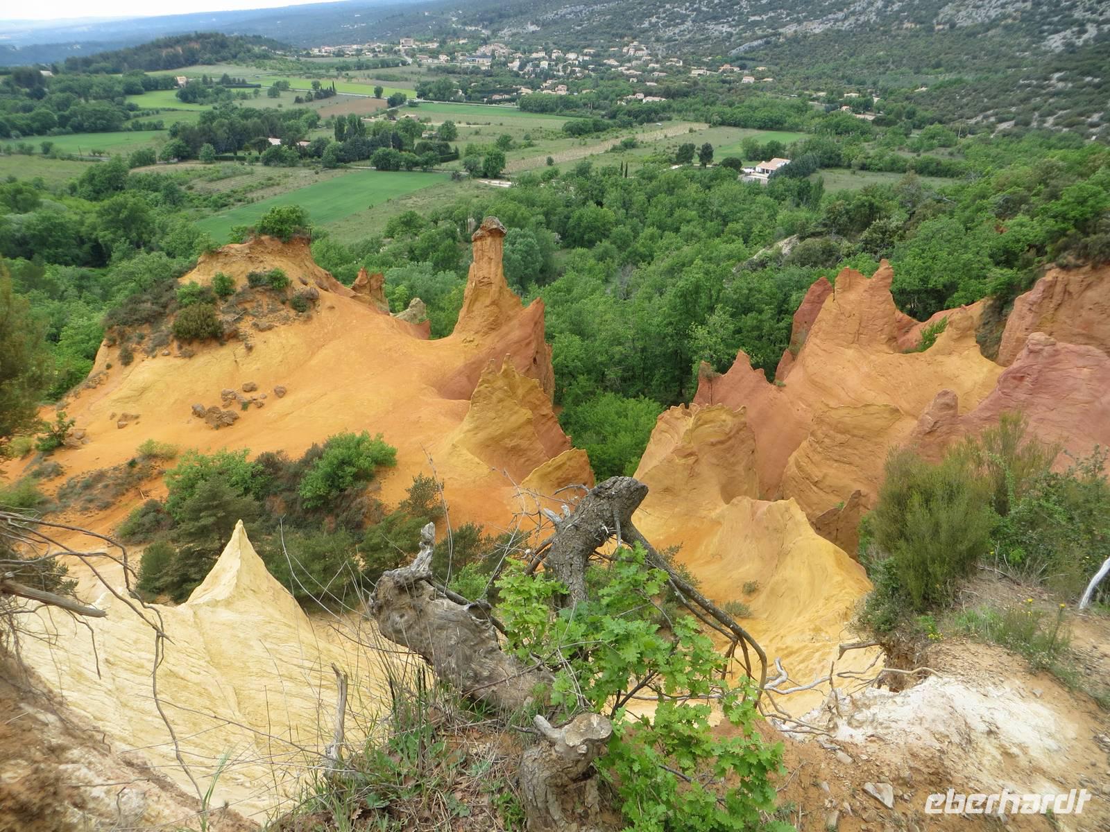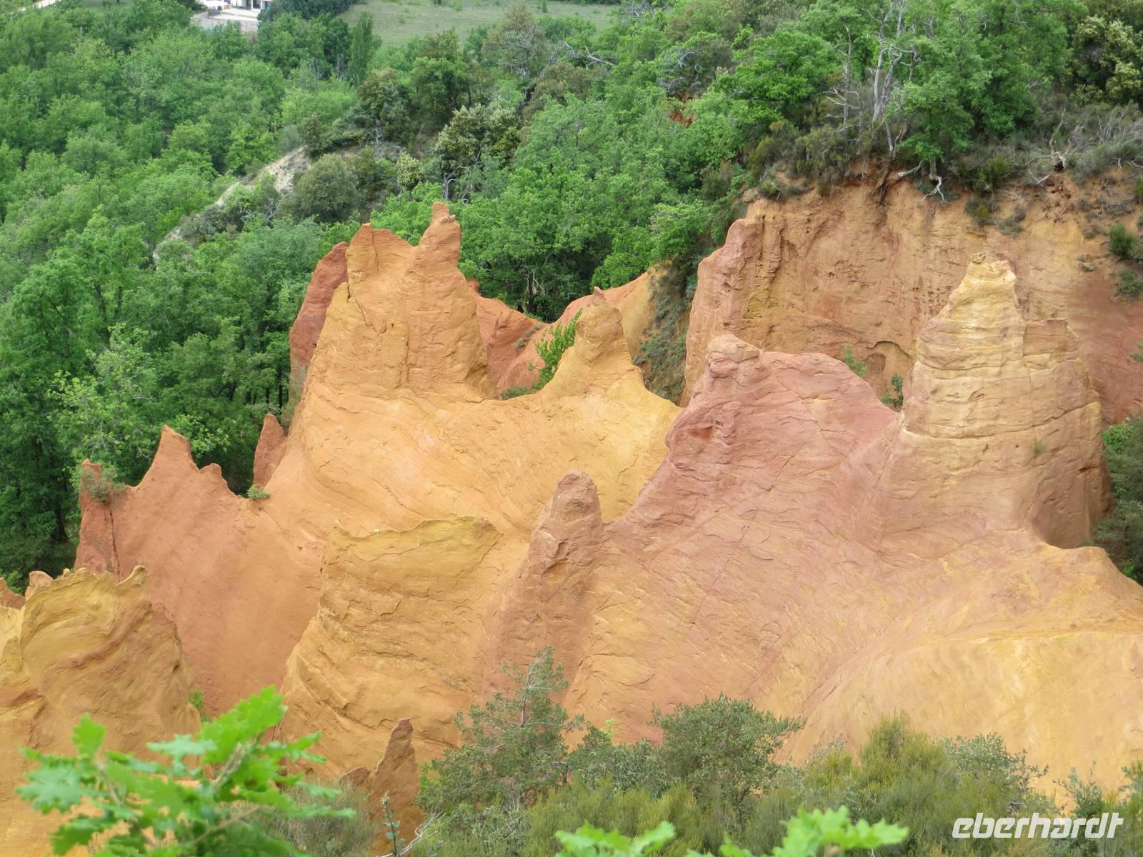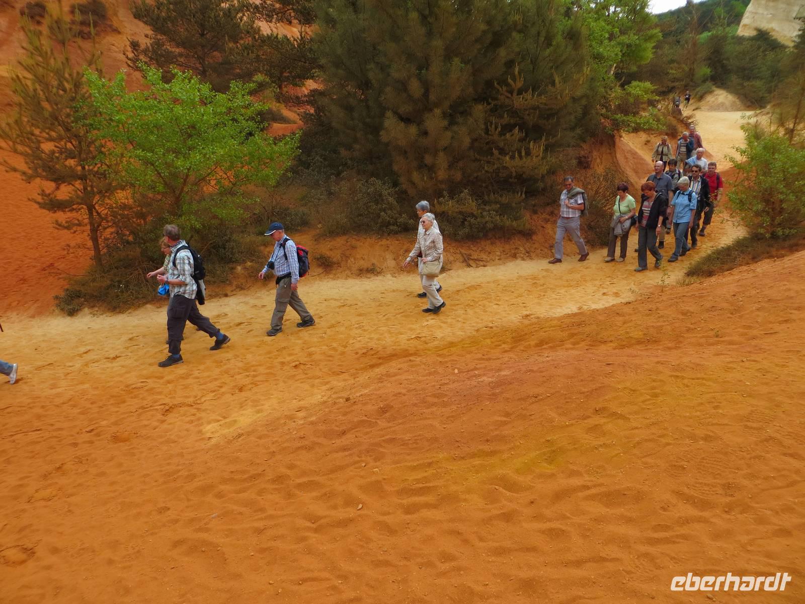 Nach reichlich einstündiger Fahrt über Apt erreichten wir das Dörfchen Rustrel mit seinem Parkplatz für die Besucher des Colorado provencial, einer Nachfolgelandschaft einstigen Ockerabbaus. Wir wählten den mittelgroßen Rundweg Nr. 2 und wanderten entlang des Weges der Feen in die Sahara. Der einstige Abbau des farbnuancenreichen Ockers und die natürliche Erosion haben eine farbenfrohe, erdige Landschaft mit interessanten Erdgebilden im grünen Wald hinterlassen.