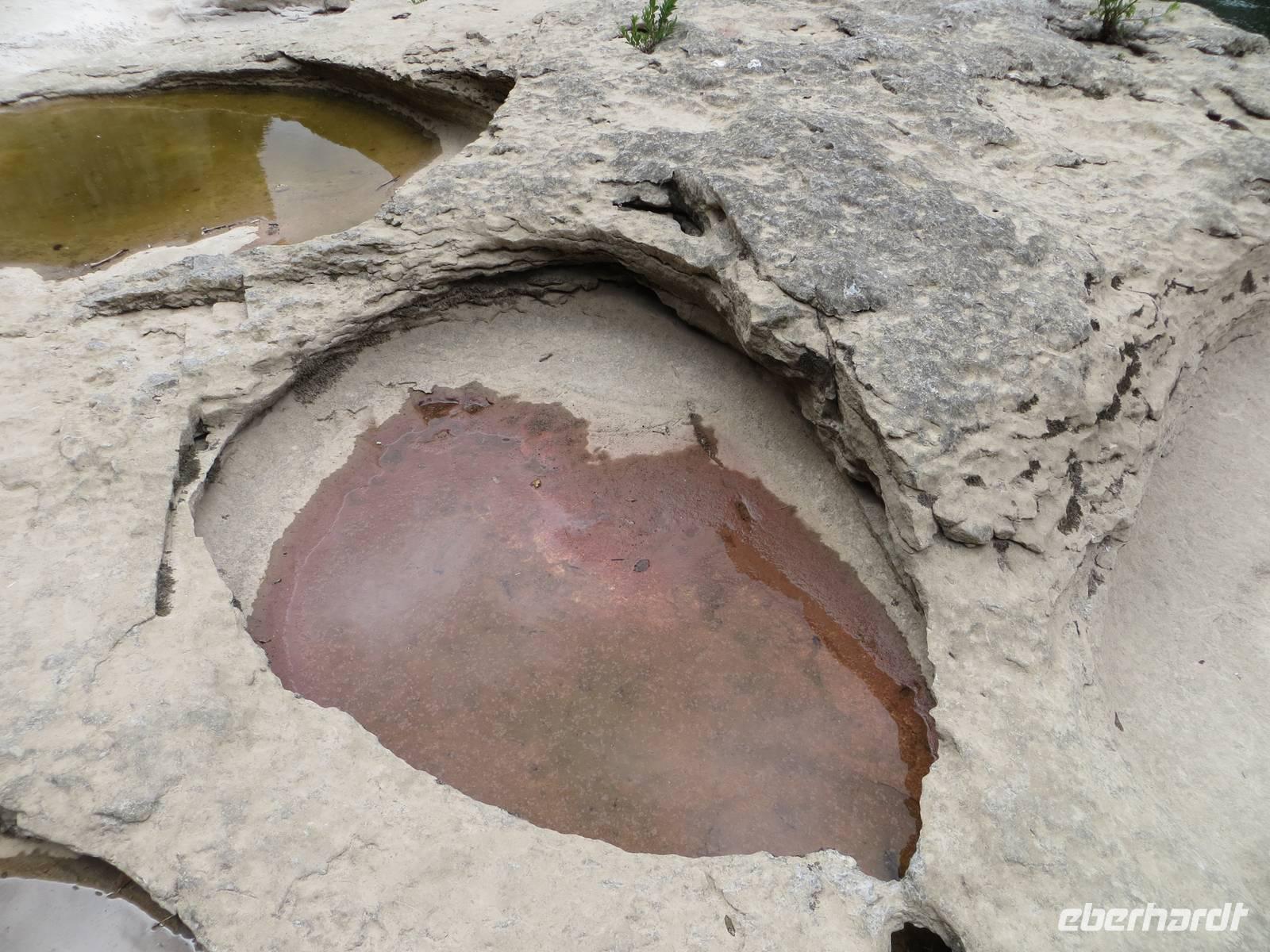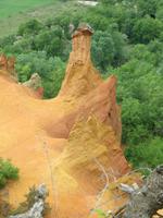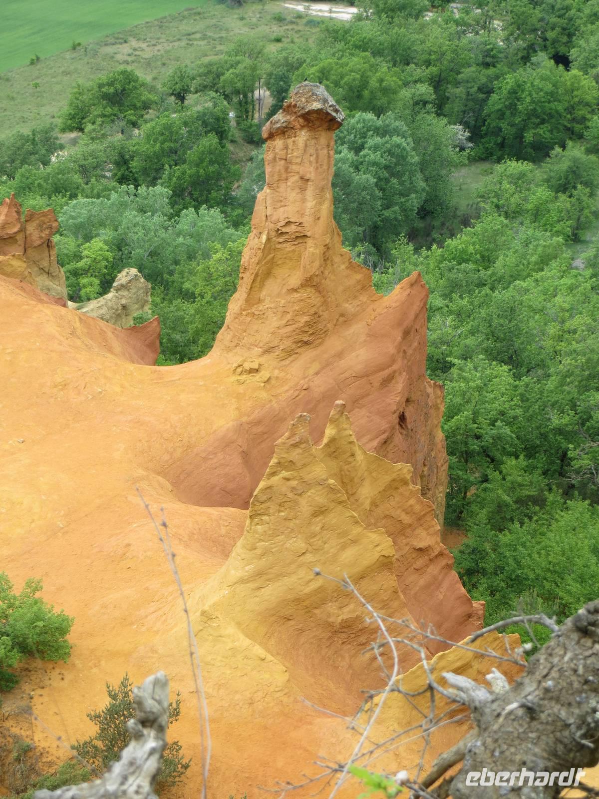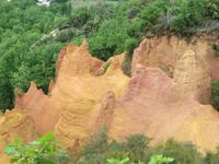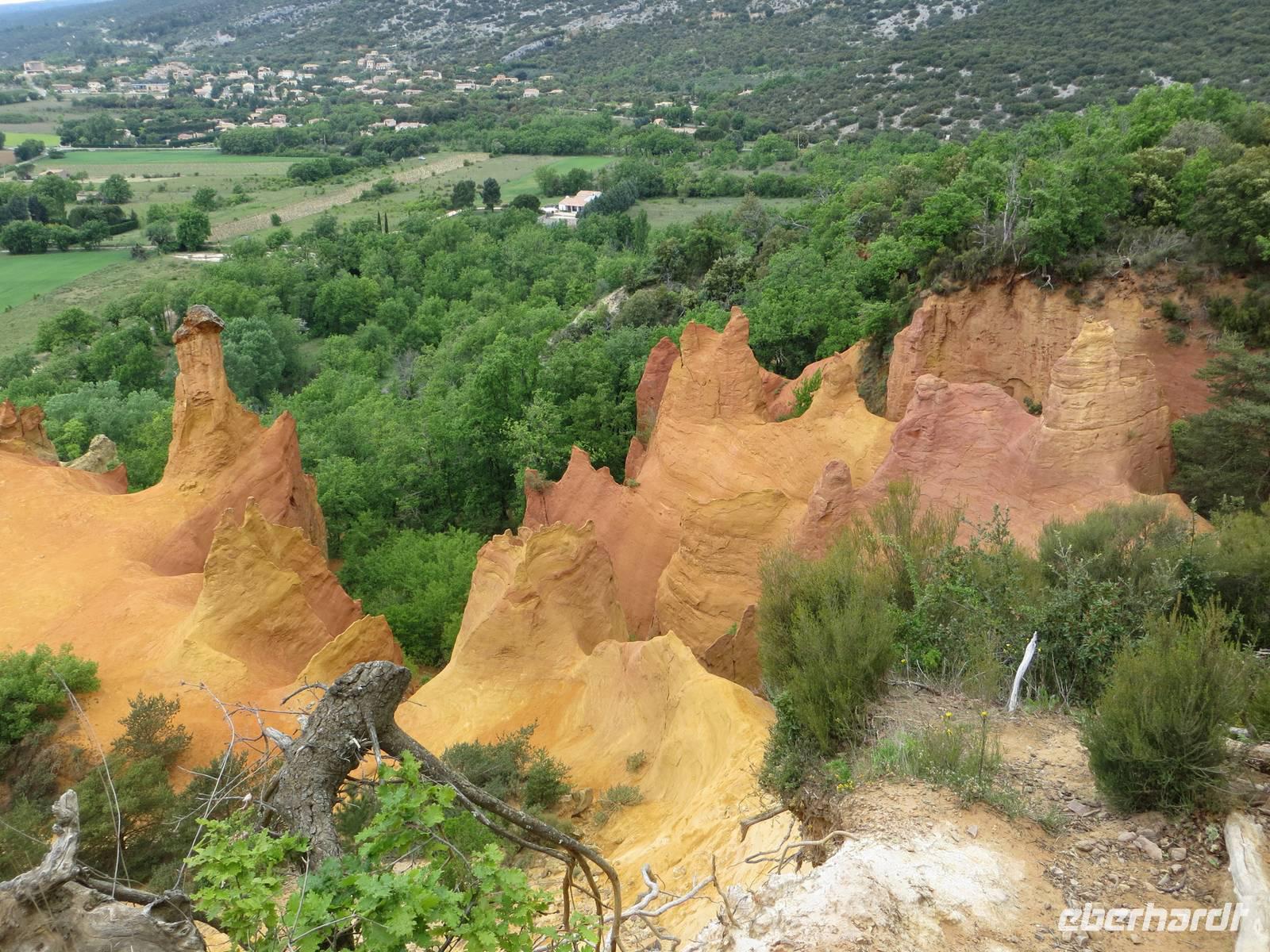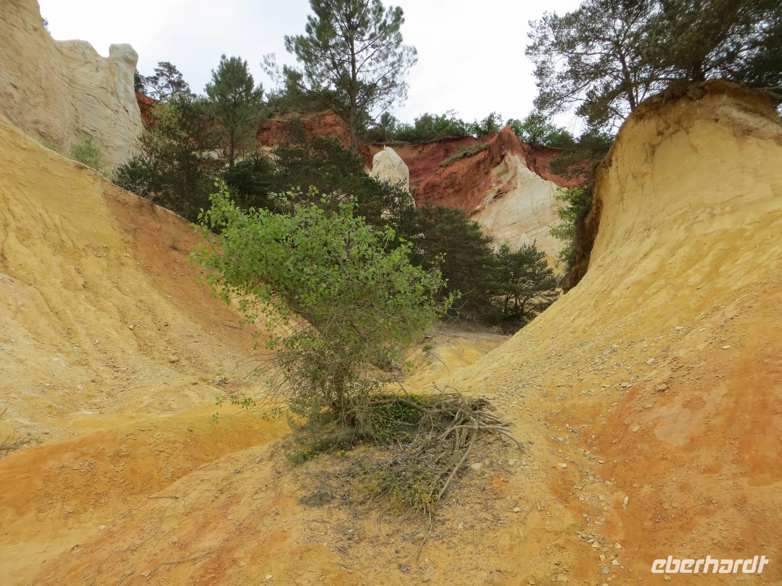 Nach reichlich einstündiger Fahrt über Apt erreichten wir das Dörfchen Rustrel mit seinem Parkplatz für die Besucher des Colorado provencial, einer Nachfolgelandschaft einstigen Ockerabbaus. Wir wählten den mittelgroßen Rundweg Nr. 2 und wanderten entlang des Weges der Feen in die Sahara. Der einstige Abbau des farbnuancenreichen Ockers und die natürliche Erosion haben eine farbenfrohe, erdige Landschaft mit interessanten Erdgebilden im grünen Wald hinterlassen.