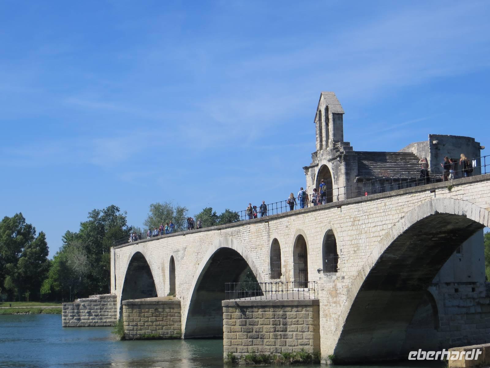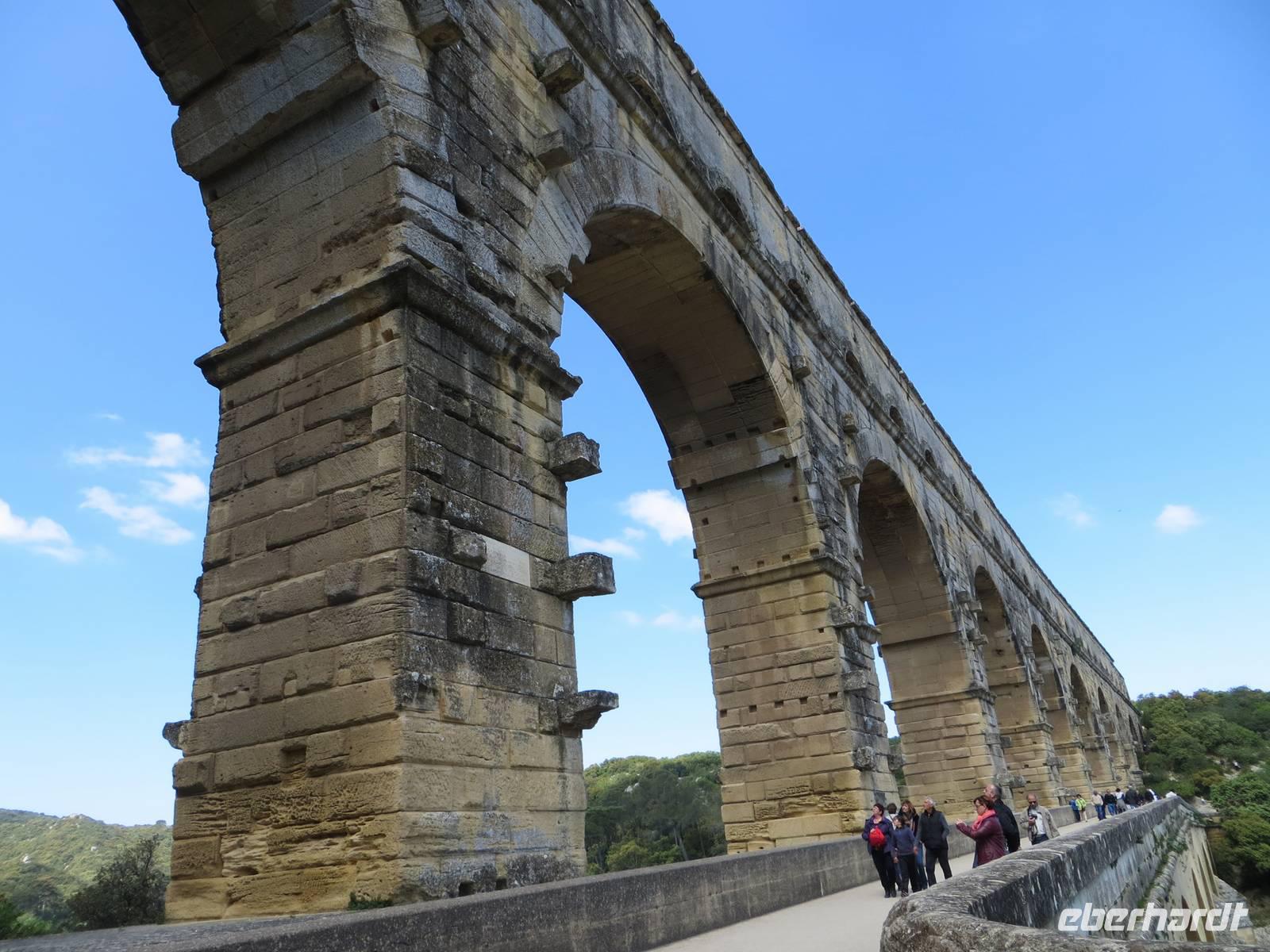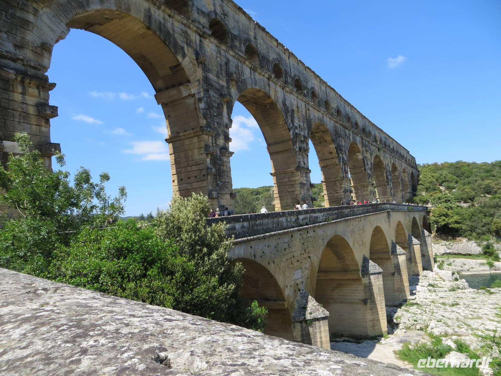 Vorbei an Weinflächen und einer Ölmühle ging es durch dörfliches Gebiet um St. Bonnet. Von einem kleinen Kalksteinhang konnten wir uns einen ersten Eindruck von typisch provencialischer Landschaft machen. Bald führte der leichte, etwas schottrige Weg durch Steineichen hinab zum Fluss Gard. Bereits im Wald hatten wir einen Rest des Wasserleitungsviaduktes gesehen. Bals schon standen wir in der Nähe der zweitausend Jahre alten Pont du Gard.Ist schon die Größe faszinierend, so wohl noch mehr die Tatsache, dass hier vor zweitausend Jahren über ein 50 Kilometer langes System Wasser geleitet wurde. Ein modernes und sehr informatives Museum am linken Flussufer berichtet anschaulich von der Zeit der Römer vor zweitausend Jahren. Den Nachmittag verbrachten wir in Nimes und konnten am Amphitheater - der Arena - ein wenig die Größe des Römischen Reiches nachvollziehen. Ein kleiner Stadtbummel führte uns durch die Innenstadt am römischen Tempel vorbei zum Park der Fontaines. Am Abend trafen wir dann in Avignon ein, wo wir für fünf Nächte im ibis-Hotel Süd Quartier bezogen.