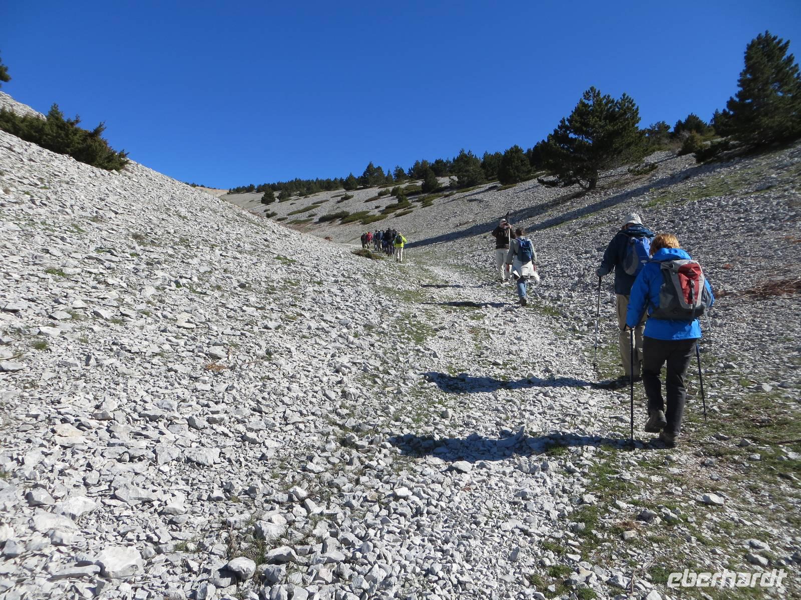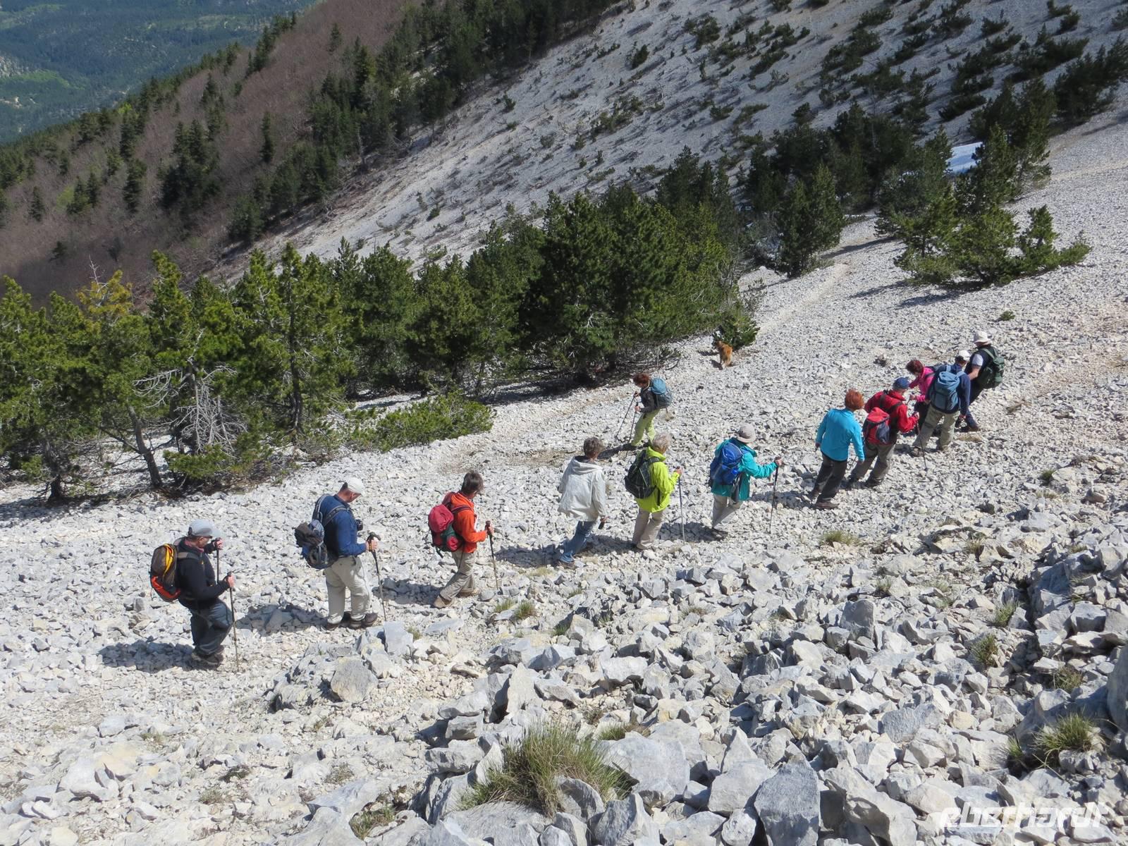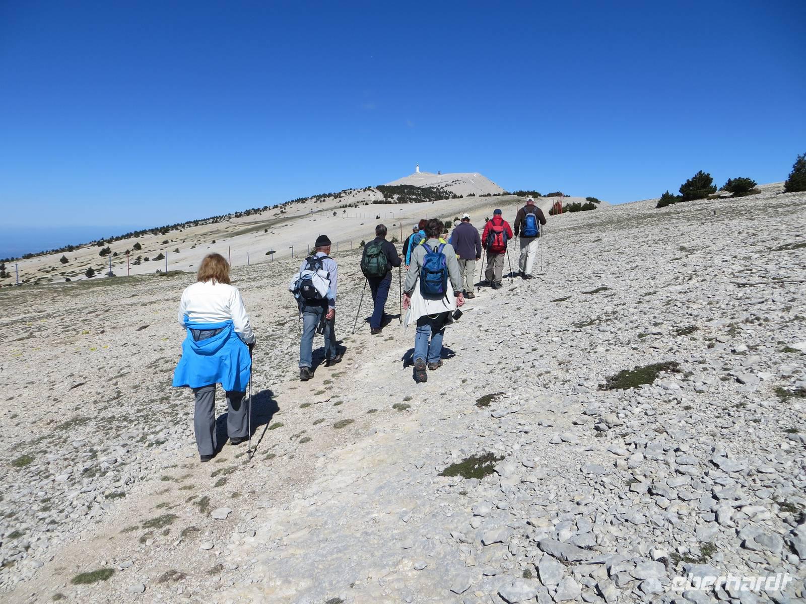 Der Berg der Provenc, der „Windberg" - Mont Ventoux - erwartete uns. Am Vortrag, ließ uns unsere örtliche Reiseleiterin Andrea wissen, sauste der Mistral mit einhundert Stundenkilometer und 4 Grad Minus über den Berg hinweg. Andrea hatte einen machbaren Wanderweg ausgekundschaftet. So trafen wir uns in über 1400 m Höhe am Chalet Reynard bei Sonnenschein. In steiler Rinne ging es auf den langgezogenen Ostrücken des Berges und bei prächtiger Sicht bis in die Seealpen an der italienischen Grenze hinauf auf einen Sattel in 1840 Meter Höhe. Um nicht folgend Straße gehen zu müssen und ohnehin nicht mehr zu sehen als von dem erreichten Platz hoch oben in der Provence, drehten wir hier um. So hatten wir die Chance, nach Interessenlage und Fitness uns zu teilen: auf bekanntem Weg zum Chalet zur besten sonntäglichen Kaffeezeit zurück oder über den Hang der Nordostseite auf schmalen, aussichtsreichen Wegen eine zehn Kilometer Zusatzrunde. Gegen siebzehn Uhr waren wir wieder vereint und alle hatten ein Bergerlebnis mit prächtigen Aussichten zum Luberon im Süden, zum Rhonetal im Westen und zu den Seealpen im Osten.