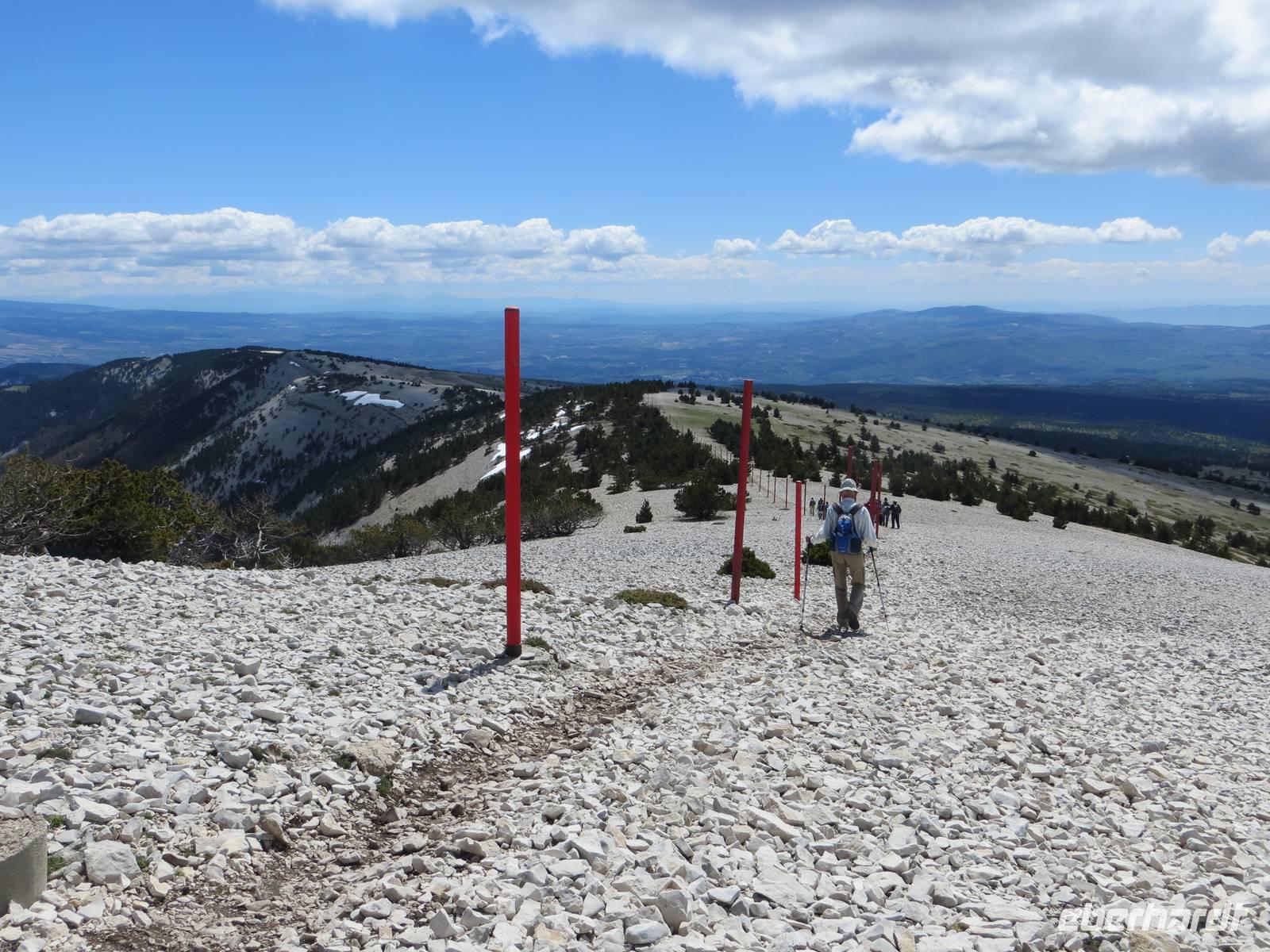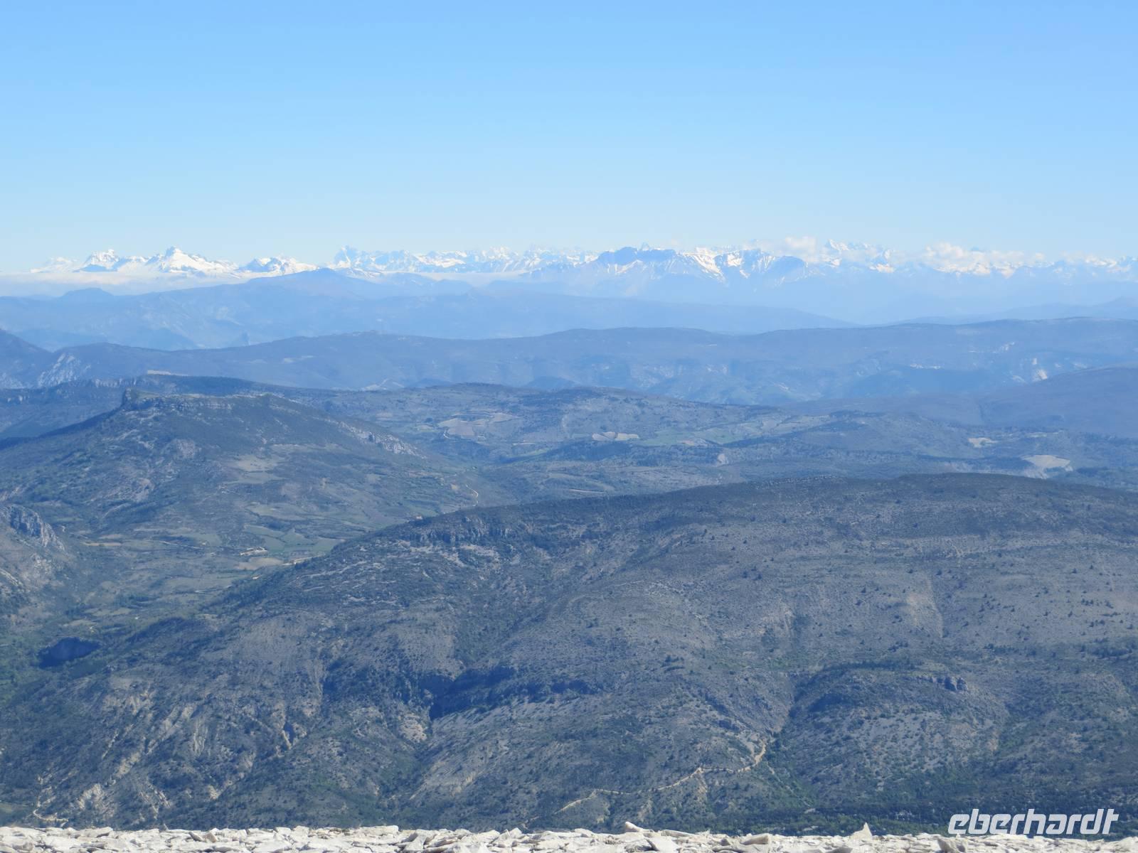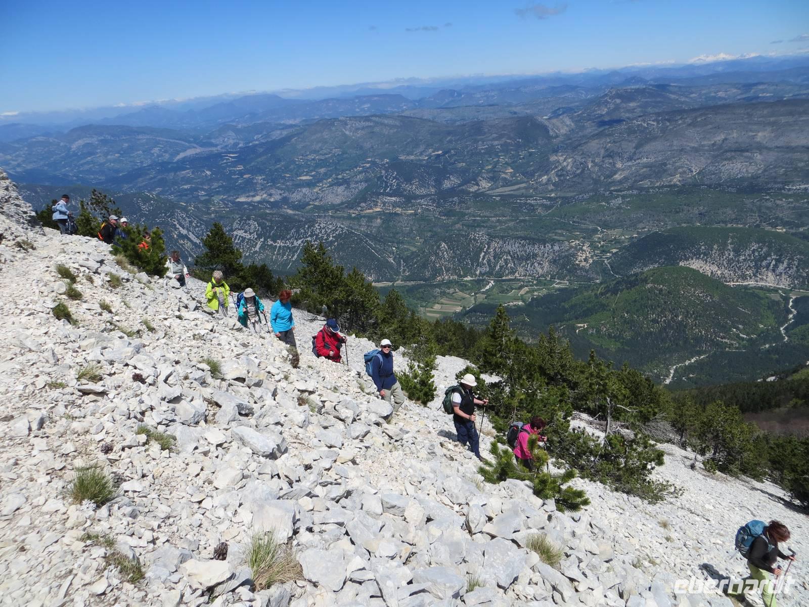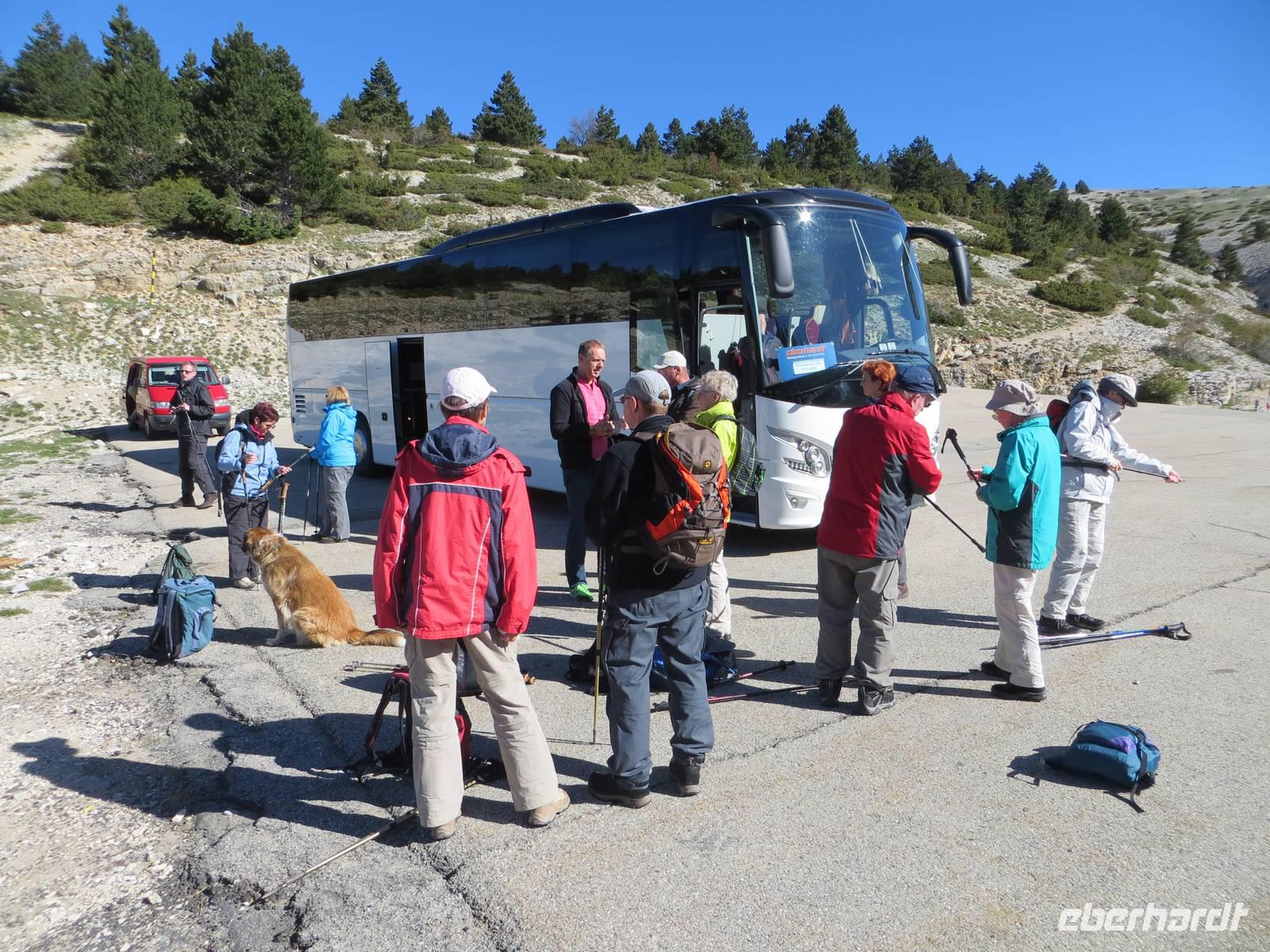 Der Berg der Provenc, der „Windberg" - Mont Ventoux - erwartete uns. Am Vortrag, ließ uns unsere örtliche Reiseleiterin Andrea wissen, sauste der Mistral mit einhundert Stundenkilometer und 4 Grad Minus über den Berg hinweg. Andrea hatte einen machbaren Wanderweg ausgekundschaftet. So trafen wir uns in über 1400 m Höhe am Chalet Reynard bei Sonnenschein. In steiler Rinne ging es auf den langgezogenen Ostrücken des Berges und bei prächtiger Sicht bis in die Seealpen an der italienischen Grenze hinauf auf einen Sattel in 1840 Meter Höhe. Um nicht folgend Straße gehen zu müssen und ohnehin nicht mehr zu sehen als von dem erreichten Platz hoch oben in der Provence, drehten wir hier um. So hatten wir die Chance, nach Interessenlage und Fitness uns zu teilen: auf bekanntem Weg zum Chalet zur besten sonntäglichen Kaffeezeit zurück oder über den Hang der Nordostseite auf schmalen, aussichtsreichen Wegen eine zehn Kilometer Zusatzrunde. Gegen siebzehn Uhr waren wir wieder vereint und alle hatten ein Bergerlebnis mit prächtigen Aussichten zum Luberon im Süden, zum Rhonetal im Westen und zu den Seealpen im Osten.