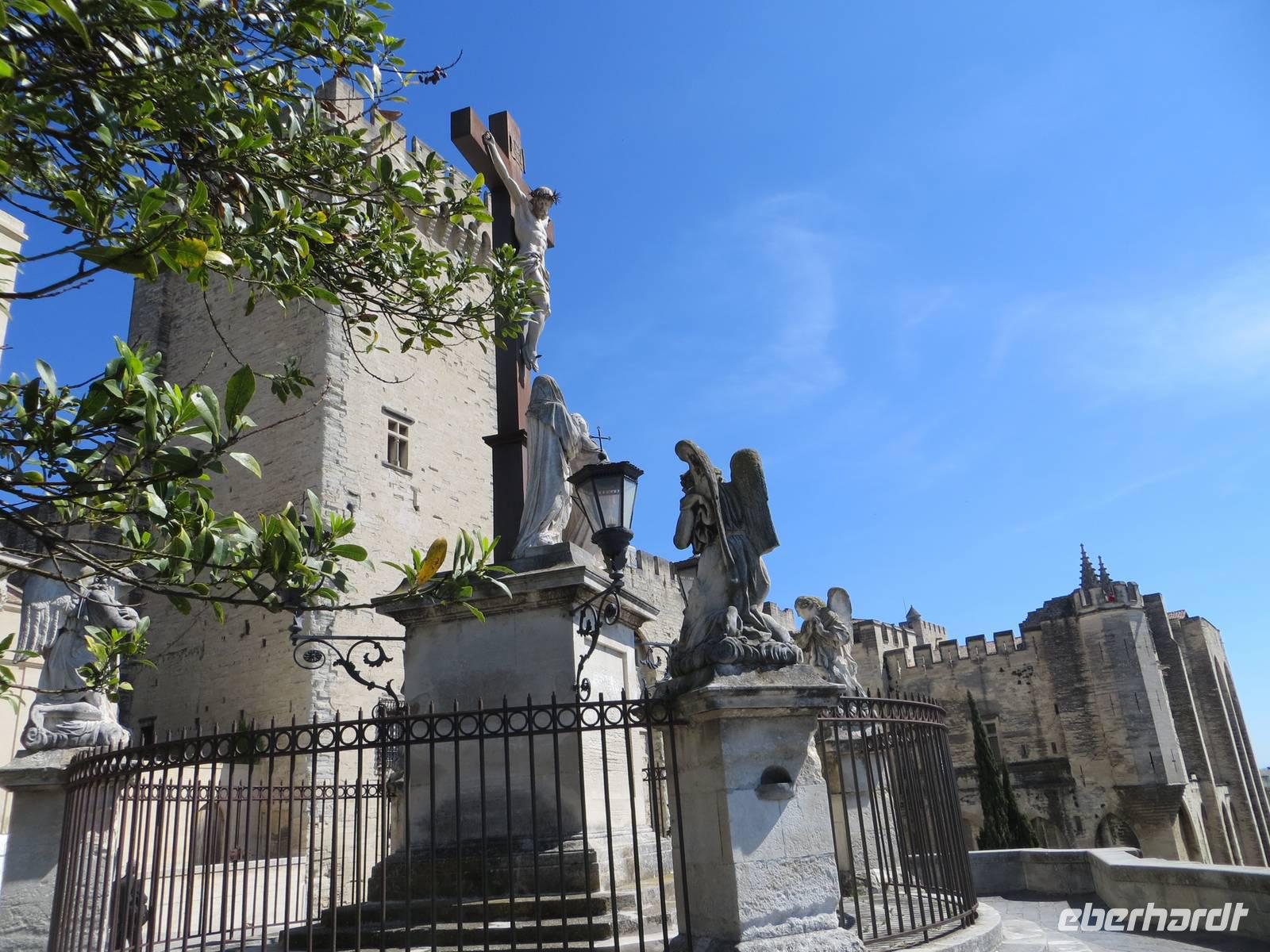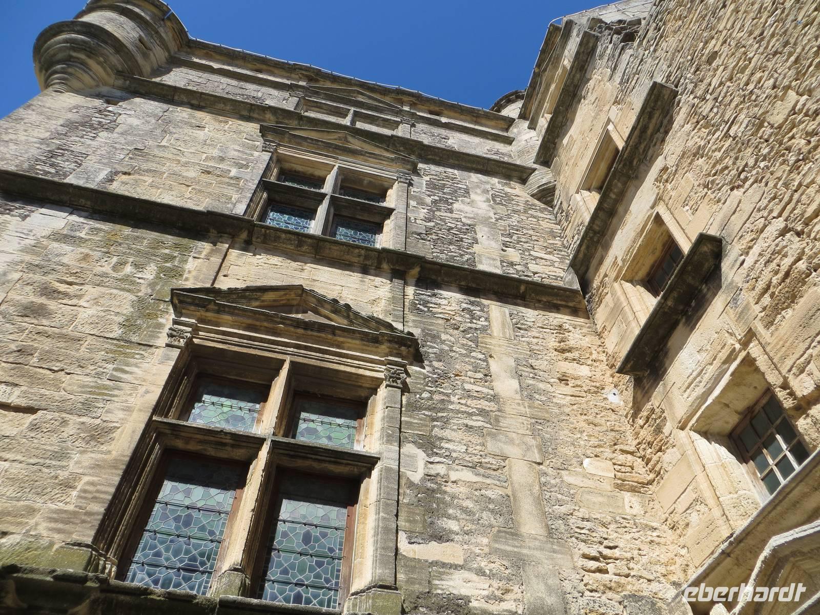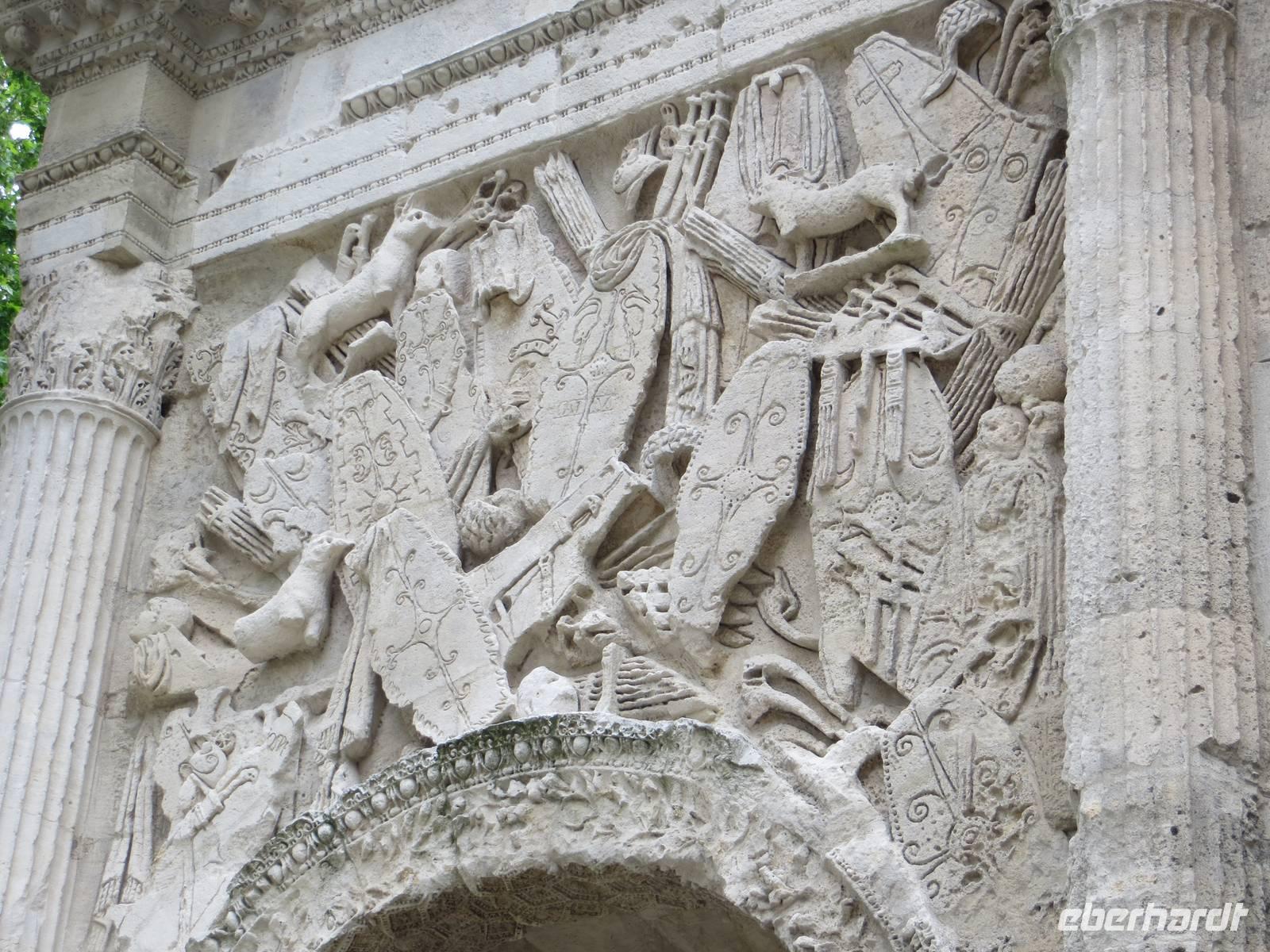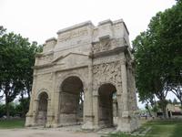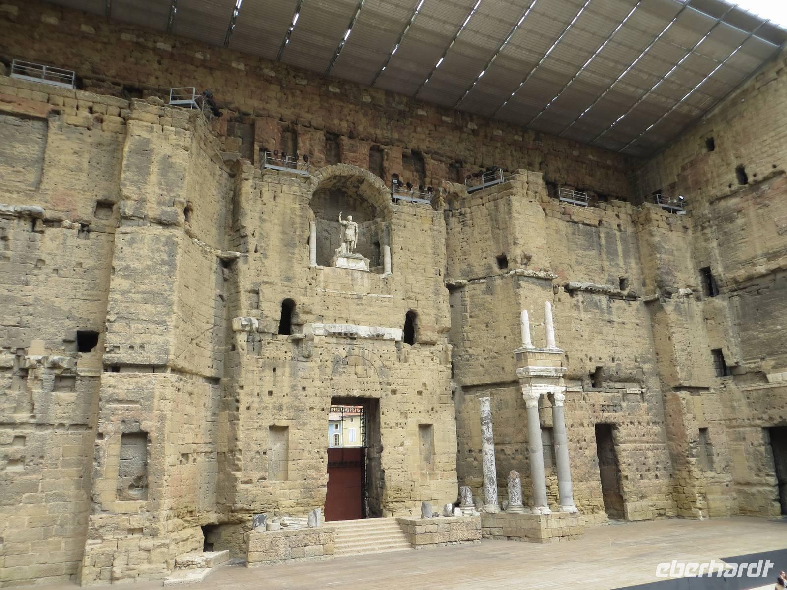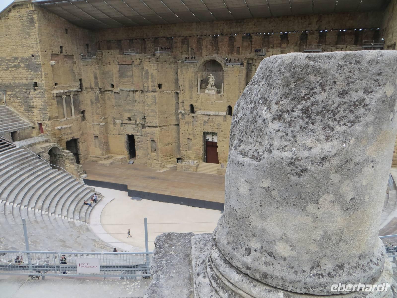 Wir entschieden uns die Tagesabfolge zu drehen. So stiegen wir am Vormittag zunächst zur alten Burganlage von Mornas auf und genossen von der Hügelkette neben der Burg einen Abschiedsblick auf die Rhone und über die Provence, zum Mont Ventoux, den Dentelles des Montmirailles, im Hintergrund das Luberon und ganz im Osten die schneebedeckten Berge der Alpen. Optischer Abschied von all unseren Reisezielen der vergangenen Tage. Gegen Mittag trafen wir in Orange ein; zunächst ein Fotostopp am zweitausend Jahre alten Triumphbogen und dann Halt direkt neben dem Amphietheater. Das wollten sich die meisten Gäste nicht entgehen lassen, zumal es wohl die besterhaltenste und größte Bühnenwand eines römischen Theaters in Europa sei - natürlich UNESCO-Welterbe. Anschließend blieb noch Zeit für ein Bummeln in den Gassen der Stadt und einem Besuch in der hiesigen Kathedrale Notre Dame, der man von außen durchaus die neunhundertjährige Geschichte ansieht, aber von innen etwas undefinierbar ist.
