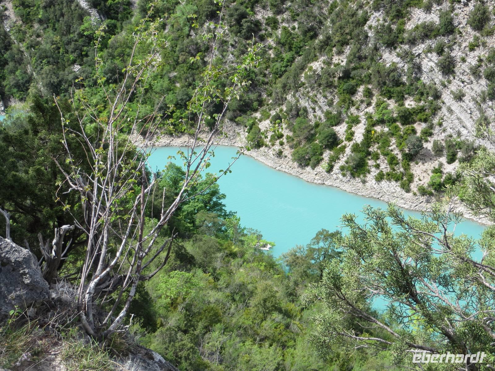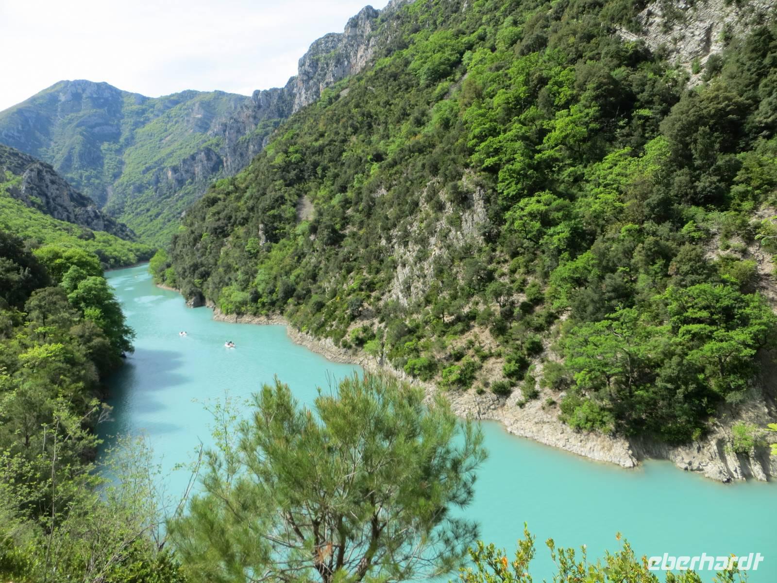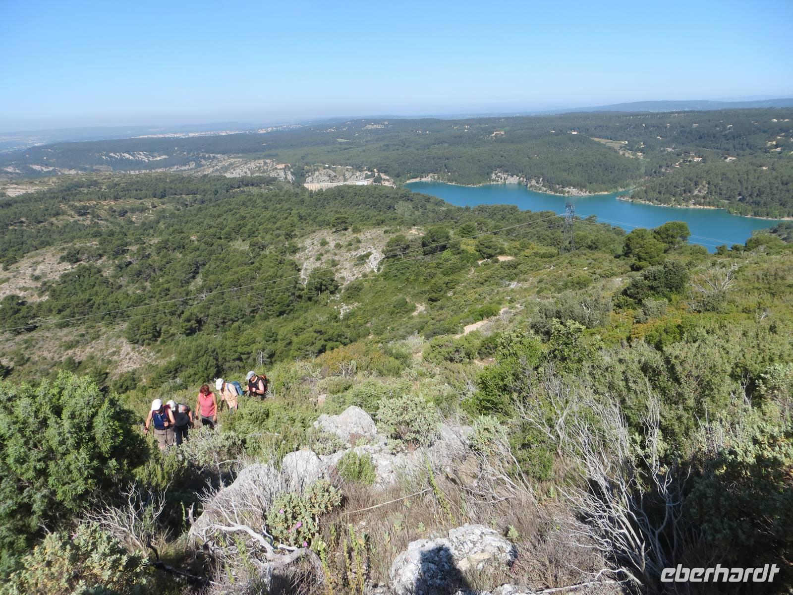 Eines der bedeutendsten Naturszenarien Europas erwartete uns heute: die Verdonschlucht. Mäandrierend fließt der Verdon durch ein Kalksteinplateau, mehr als dreihundert Meter sind es oftmals allein vom Schluchtgrund hinauf auf die Höhe der dem Flusslauf folgenden Straße; darüber weitere hunderte Meter Fels, aus deren Löchern und Höhlen Raubvögel aufsteigen. Der westliche Abschnitt der Gorges du Verdon, unweit des Stausees St. Croix war Ziel einer mittelschweren Wanderung auf dem "Anglerweg". Auch dieser Weg führte bis an das Wasser hinab und überwand mit einer kleinen via-ferrata-Stelle gut gesichert eine Felsnase. Auf einem der markantesten Wanderwege wanderte der andere Teil der Gruppe mit der örtlichen Wanderleiterin Andrea Bacher: 14 Kilometer durch die Engstellen der Schlucht. Am Nachmittag trafen sich beide Gruppe und jeder hatte sich wohl richtig enschieden : ein herausragendes Naturerlebnis.