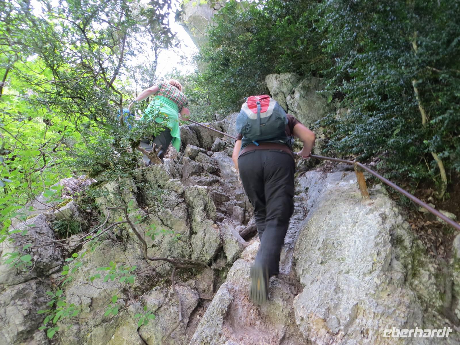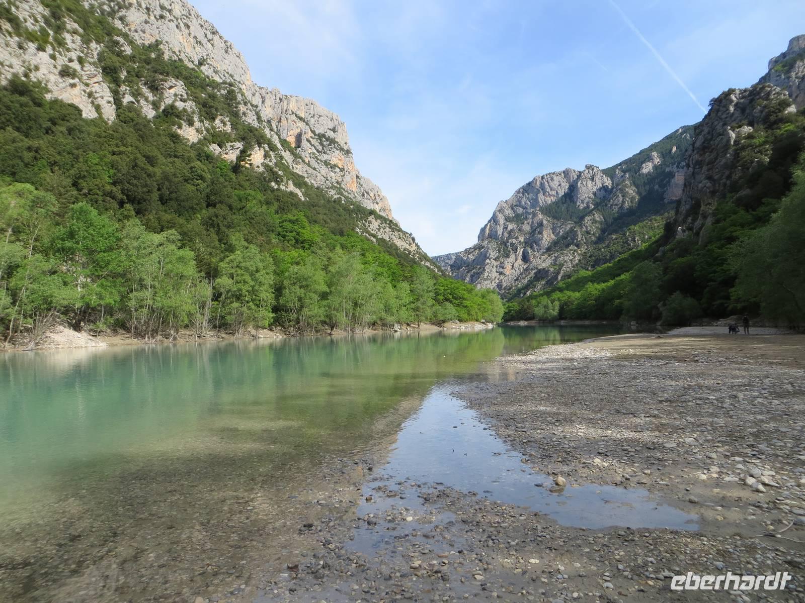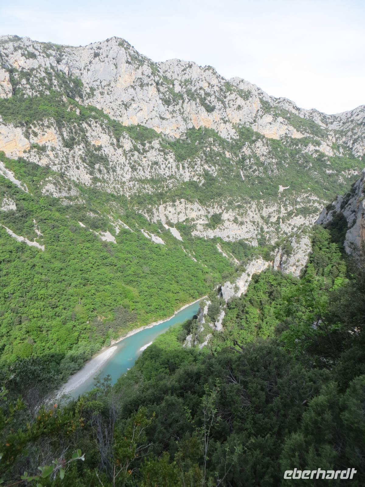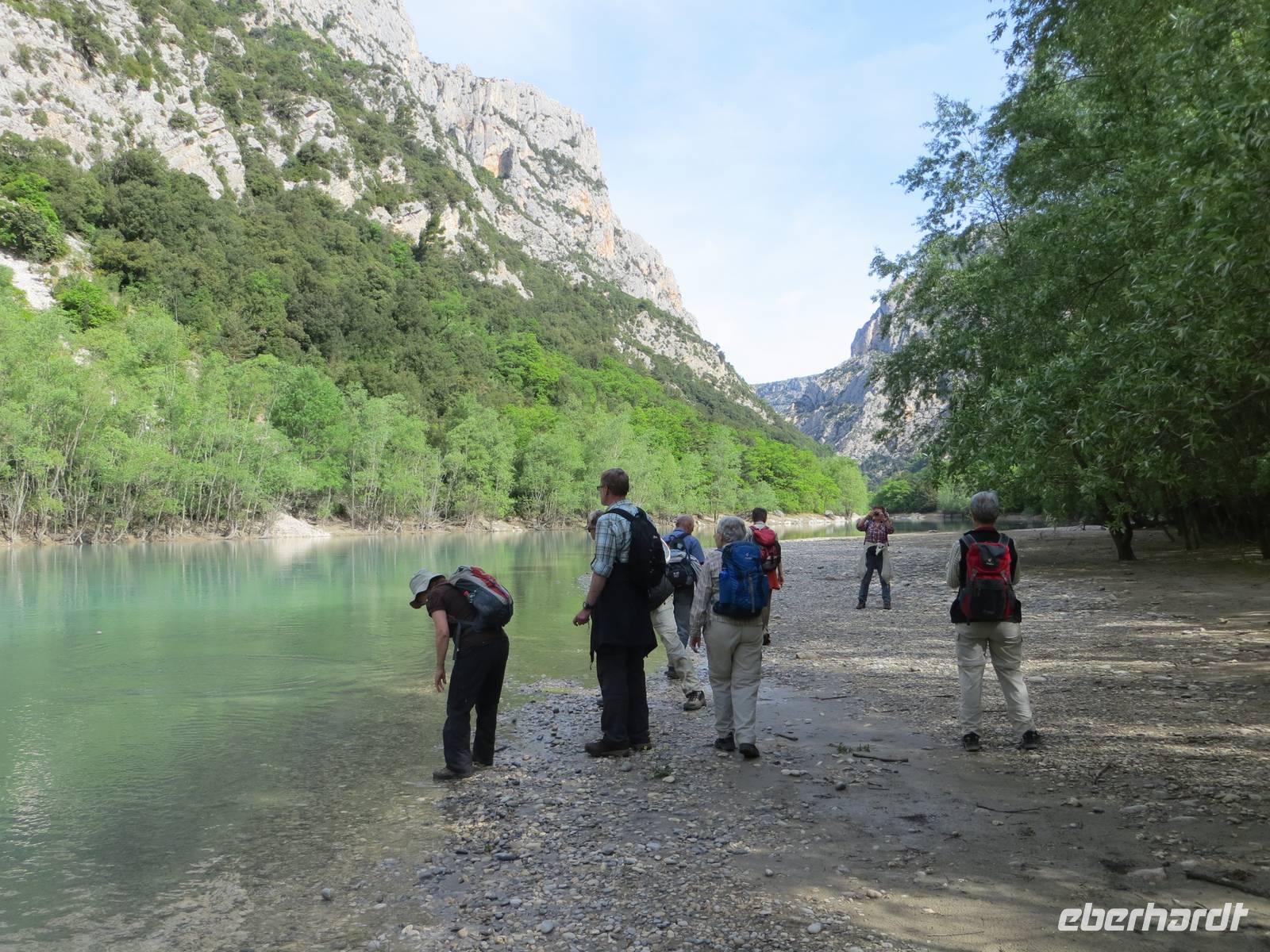 Eines der bedeutendsten Naturszenarien Europas erwartete uns heute: die Verdonschlucht. Mäandrierend fließt der Verdon durch ein Kalksteinplateau, mehr als dreihundert Meter sind es oftmals allein vom Schluchtgrund hinauf auf die Höhe der dem Flusslauf folgenden Straße; darüber weitere hunderte Meter Fels, aus deren Löchern und Höhlen Raubvögel aufsteigen. Der westliche Abschnitt der Gorges du Verdon, unweit des Stausees St. Croix war Ziel einer mittelschweren Wanderung auf dem "Anglerweg". Auch dieser Weg führte bis an das Wasser hinab und überwand mit einer kleinen via-ferrata-Stelle gut gesichert eine Felsnase. Auf einem der markantesten Wanderwege wanderte der andere Teil der Gruppe mit der örtlichen Wanderleiterin Andrea Bacher: 14 Kilometer durch die Engstellen der Schlucht. Am Nachmittag trafen sich beide Gruppe und jeder hatte sich wohl richtig enschieden : ein herausragendes Naturerlebnis.