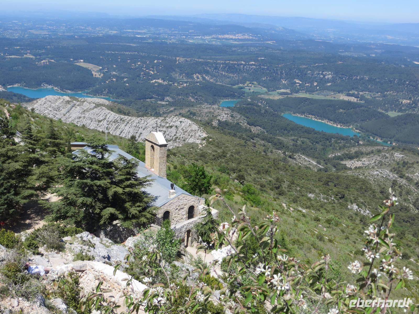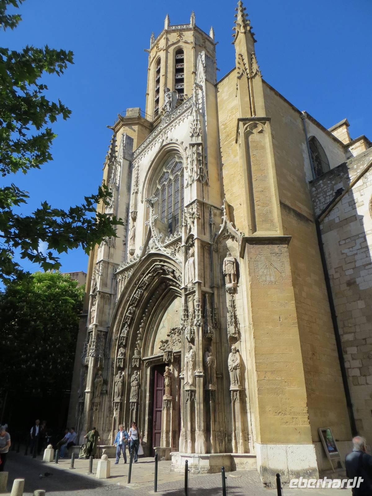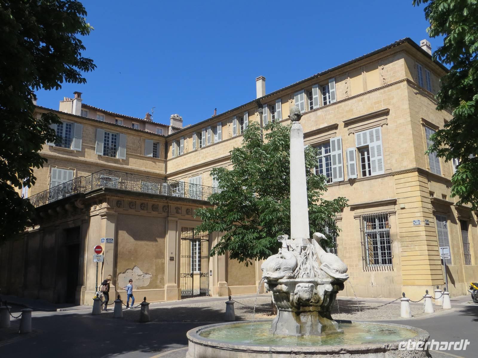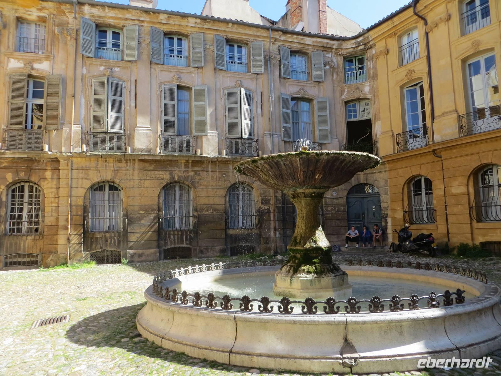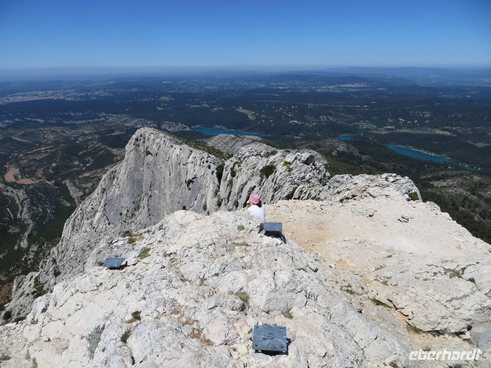 Fast vom Hotel aus konnten wir den Hausberg von AIx sehen. Neunhundert Meter erhebt er sich über der Ebene mit einem markanten Kreuz. Die Südseite des Berges sieht sehr alpin aus. Während sich sechs Gäste individuelle Tagesziele stellten, nahmen zwölf Gäste gemeinsam die Besteigung über den langen Westgrat in Angriff. Vom Stausee Bimont stiegen wir sechshundert Höhenmeter in knapp drei Stunden auf und erreichten fast Punkt 12 Uhr die kleine Kapelle. Nun waren es nur noch wenige Meter des Aufstiegs bis zum Gipfelkreuz. Leider war es in der Weite etwas trüb, aber die meisten Landschaftszüge der Provence konnten wir gut erkennen und unsere Reise nachvollziehen. Mit Sonne im Genick stiegen wir ab und hatten nach geschwinder Fahrt zum Hotel noch Zeit fürs Duschen, bevor wir zum Stadtbummel in Aix aufbrachen. Marie Daniele führte uns in zwei Stunden durch das Zentrum von Aix, vorbei an Adelspalästen aus dem 17. Jahrhundert, dem Ursprungsgebäude der Universität und durch die Gassen der Altstadt; natürlich auch vorbei an den Brunnen der Stadt, den es war das Wasser, was der Stadt den Namen einst gab. So war es zwar ein langer und anstrengender aber auch ein kurzweiliger und mannigfaltiger Reisetag.