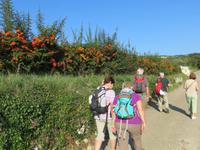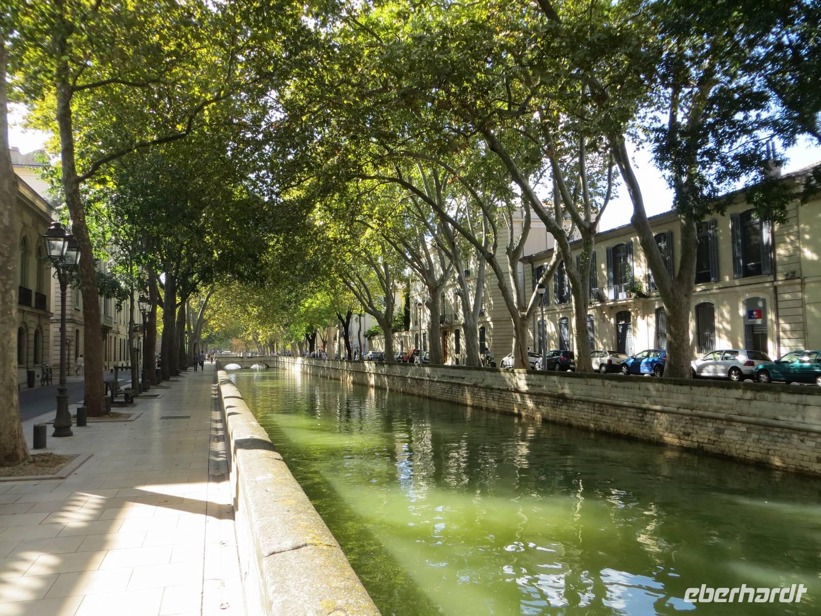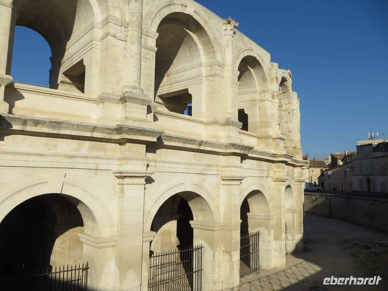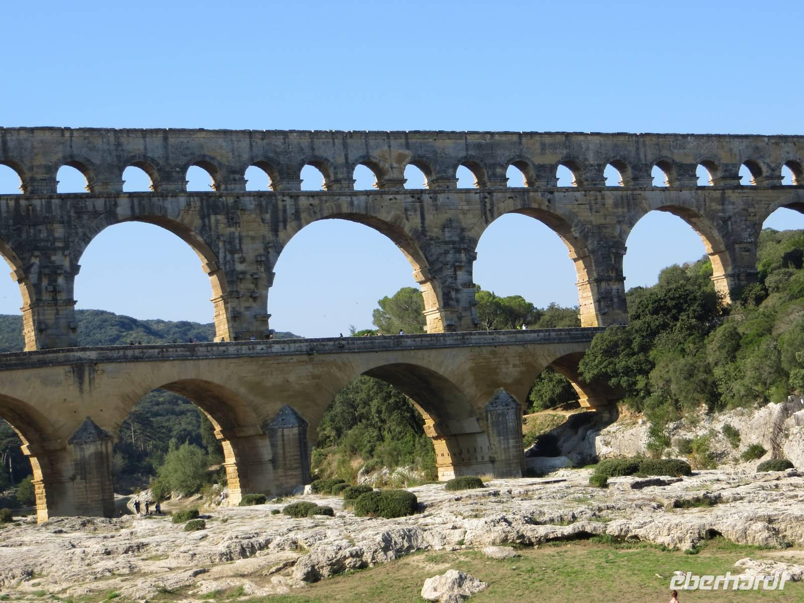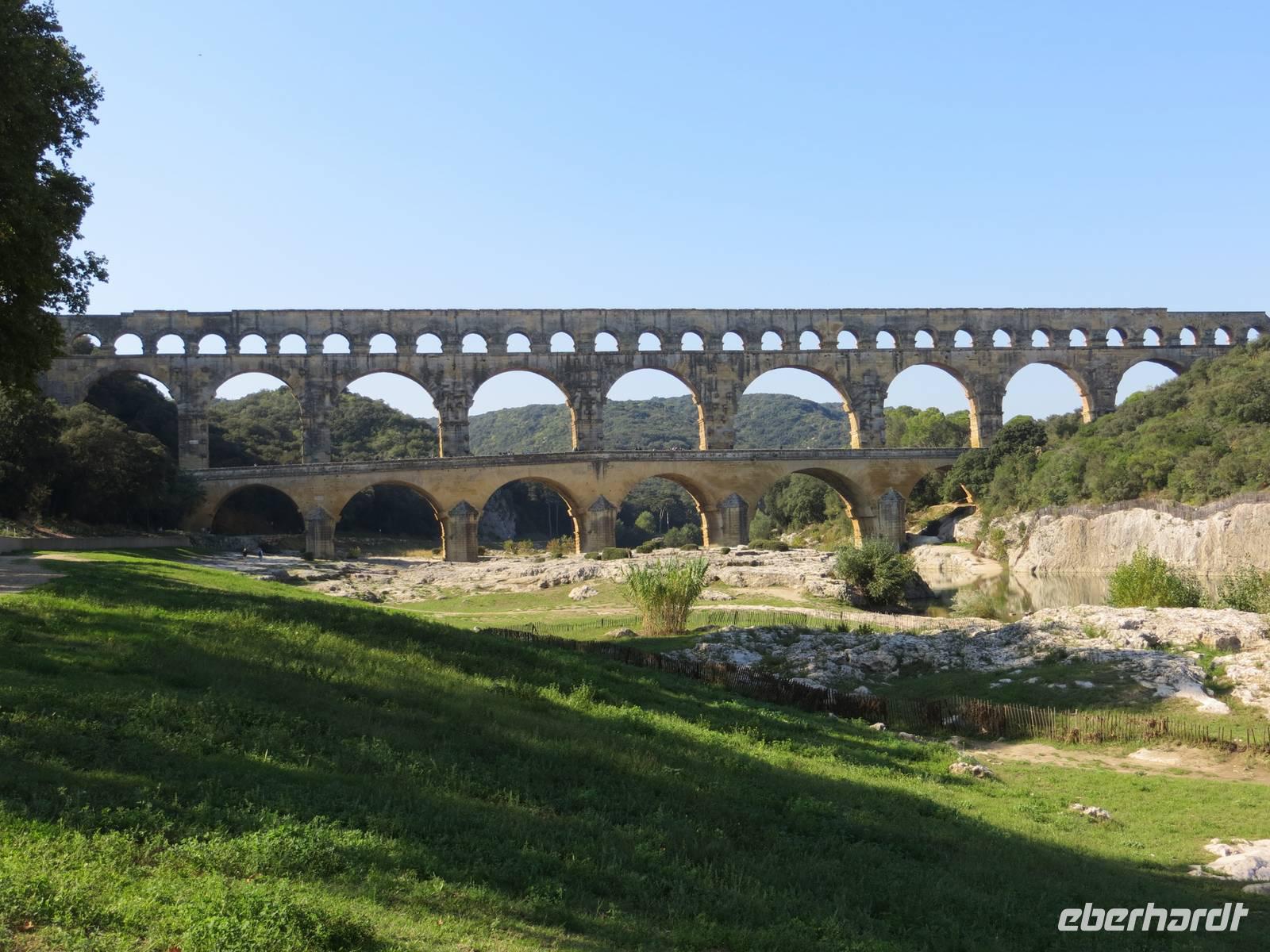 Vorbei an Weinflächen und mit einem Besuch in einer Ölmühle ging es durch dörfliches Gebiet um St. Bonnet. Von einem kleinen Kalksteinhang konnten wir uns einen ersten Eindruck von typisch provencialischer Landschaft machen. Bald führte der leichte, etwas schottrige Weg, eher wie ein ausgewaschenes Bachbett, durch Steineichen hinab zum Fluss Gard. Bereits im Wald hatten wir einen Rest des Wasserleitungsviaduktes gesehen. Nach ein und einer halben Stunde standen wir in der Nähe der zweitausend Jahre alten Pont du Gard. Ist schon die Größe faszinierend, so wohl noch mehr die Tatsache, dass hier vor zweitausend Jahren über ein 50 Kilometer langes System Wasser geleitet wurde. Ein modernes und sehr informatives Museum am linken Flussufer berichtet anschaulich von der Zeit der Römer vor zweitausend Jahren. Den Nachmittag verbrachten wir in Nimes und konnten am Amphitheater - der Arena - ein wenig die Größe des Römischen Reiches nachvollziehen. Ein kleiner Stadtbummel führte uns durch die Innenstadt über den Boulevard Victor Hugo zur Kirche St. Jean aus dem 11. Jahrhundert, dann etwas abwegig zum französischen Tor. Als wir wieder Orientierung gefunden hatten, erreichten wir den römischen Tempel und weiter ging es am Kanal unter Platzanten entlang zum Park der Fontaines. Nach römischen Wasserleitungen fanden wir ein Beispile barocker Parkgestaltung unter Ludwig XV. Am Abend trafen wir dann wieder in Arles ein. (Wanderung 5 km, leicht)