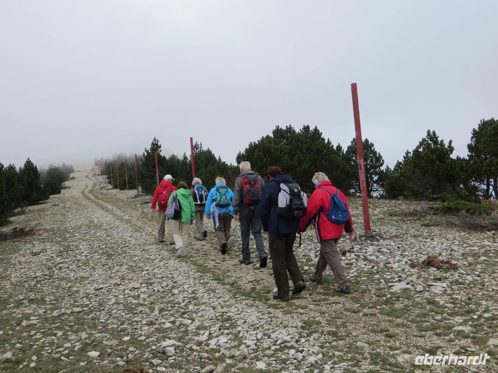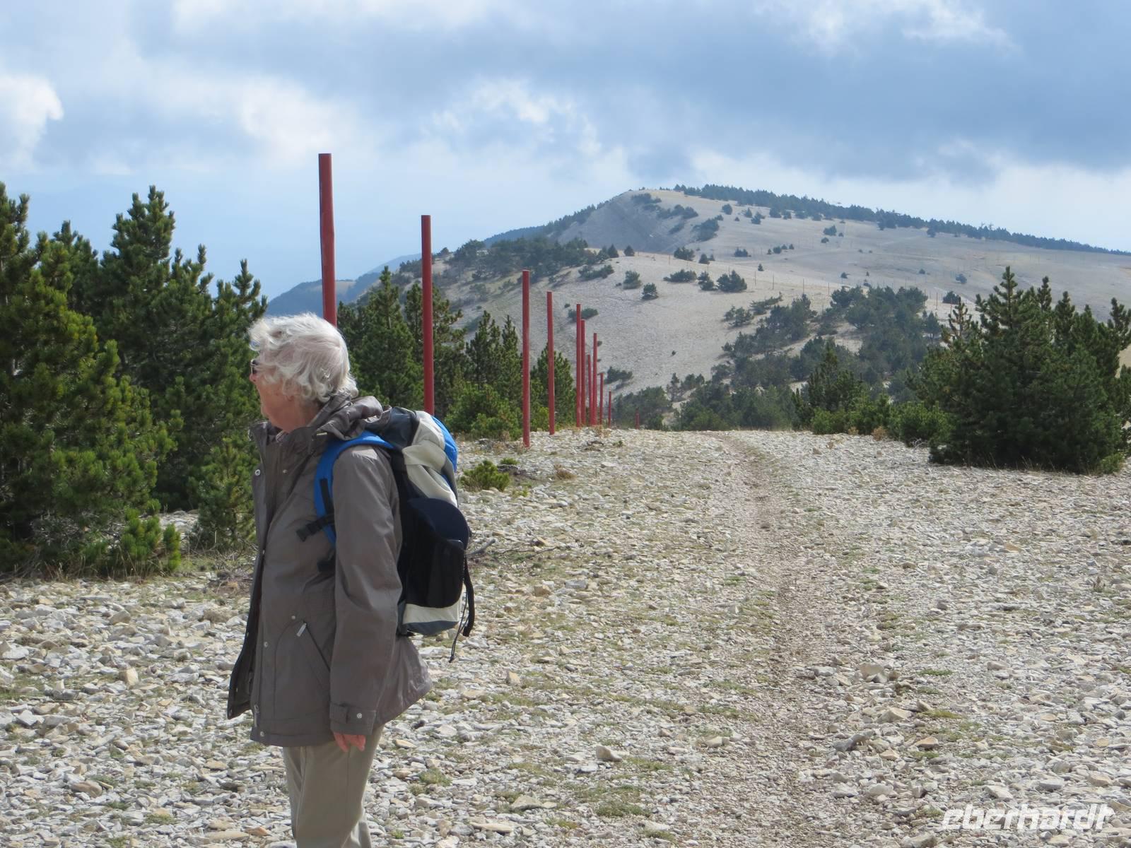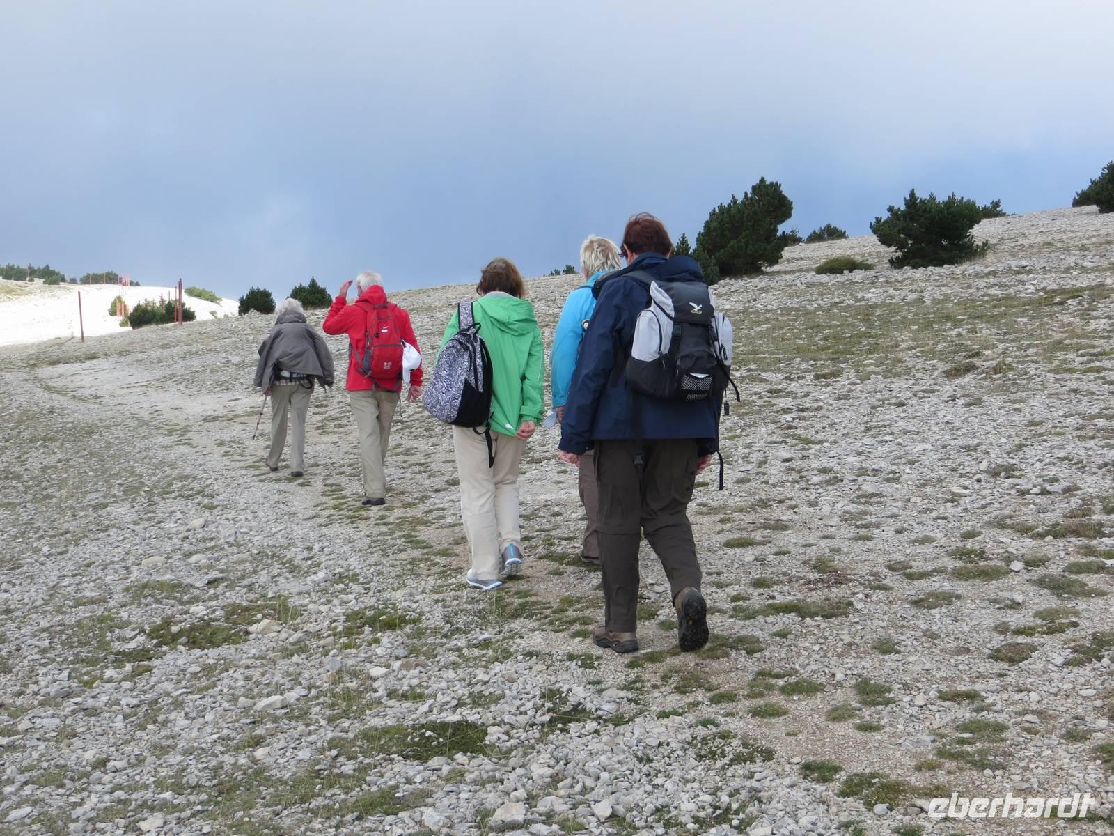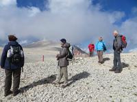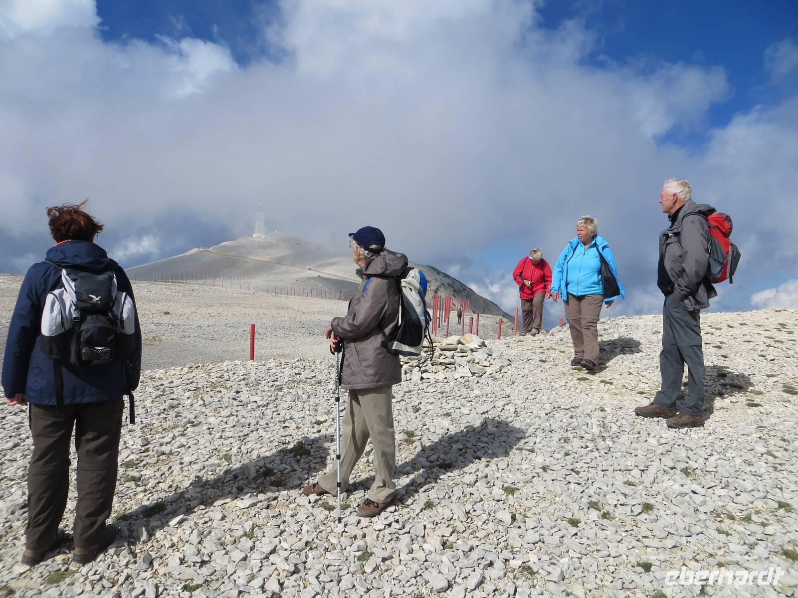 Der Berg der Provenc, der „Windberg" - Mont Ventoux - erwartete uns. Von Arles fuhren wir über Avignon, Carpentras durch das Weinbaugebiet am Ventoux bis zum Chalet Reynard in 1450 Meter Höhe. In einer steilen Rinne ging es auf den langgezogenen Ostrücken des Berges. Die Sicht war mitelprächtig: von Südwesten zogen Wolken auf und hinter dem Kamm in den Tälern der Nordseite wabbelte der Nebel. Aber immer mal wieder war ein Blick frei, wenn auch nicht bis in die Seealpen an der italienischen Grenze. In knapp zwei Stunden stiegen wir hinauf auf den Col de Trompete in 1840 Meter Höhe. Um nicht Straße gehen zu müssen und ohnehin nicht mehr zu sehen als von dem erreichten Platz hoch oben in der Provence, drehten wir hier um. So hatten wir die Chance kurz nach 14 Uhr auf bekanntem Weg zum Chalet zu gelangen und zur besten Kaffeezeit noch in Arles anzukommen. Durch einem geplanten Hotelwechsel von Avignon nach Arles wurde so noch ein individuelles Kennenlernen dieser Stadt, mit Amphitheater, Arena, römischen Bädern und alten Kirchen an der Rhone möglich. (Wanderung 10 km, 400 Höhenmeter, moderat)