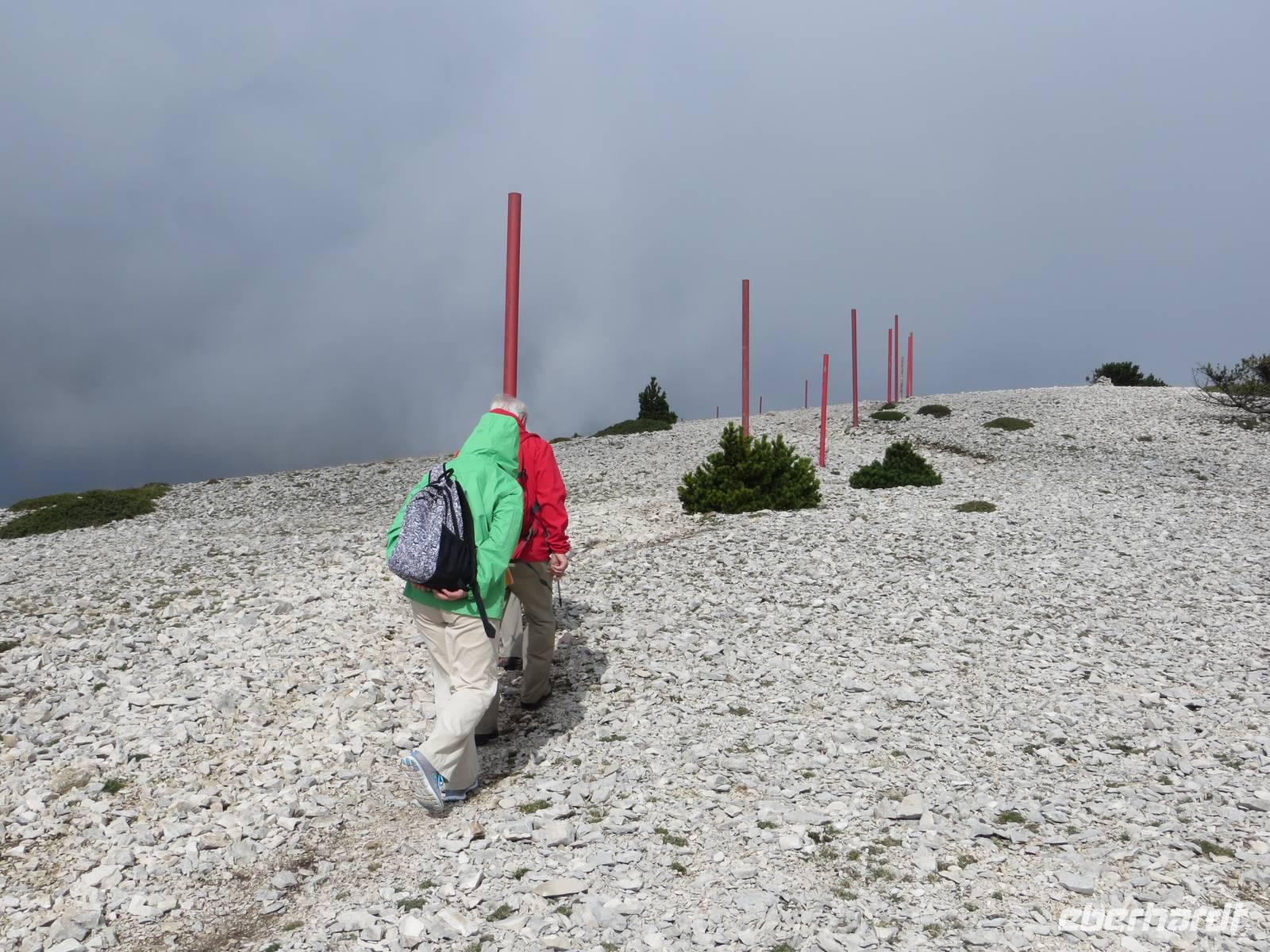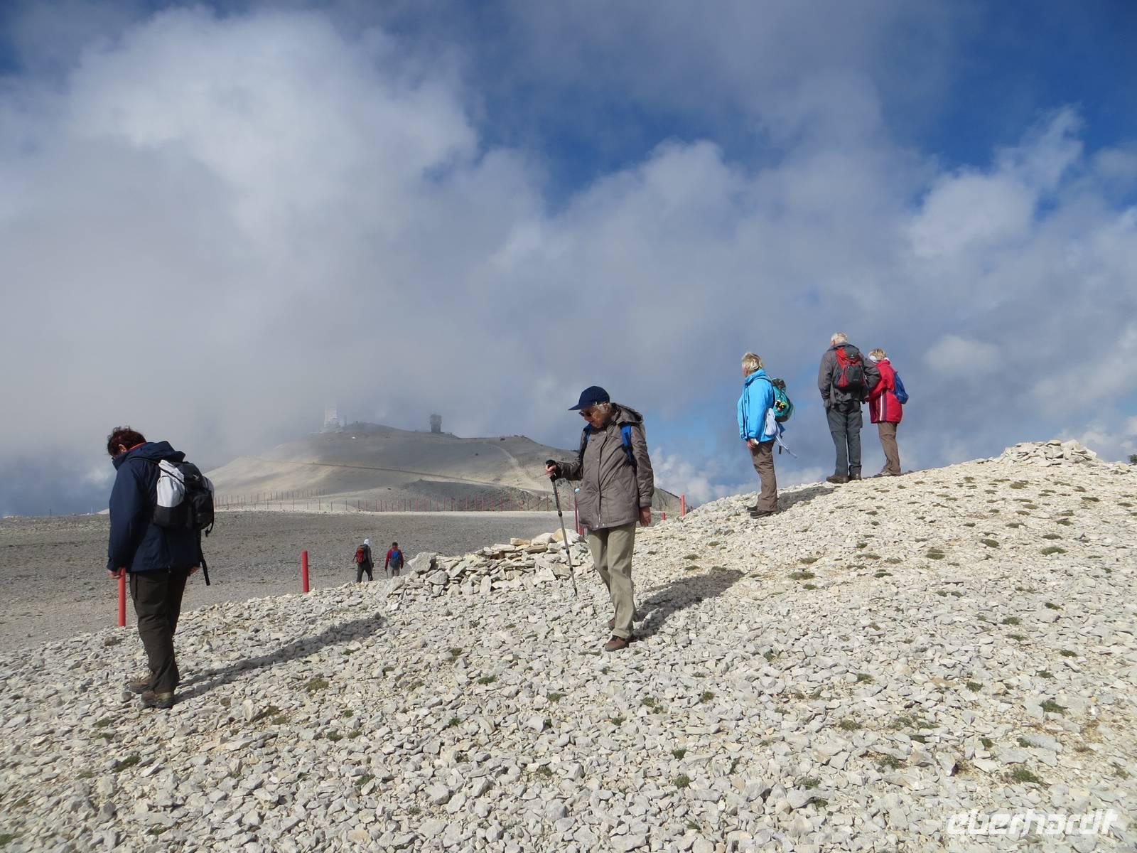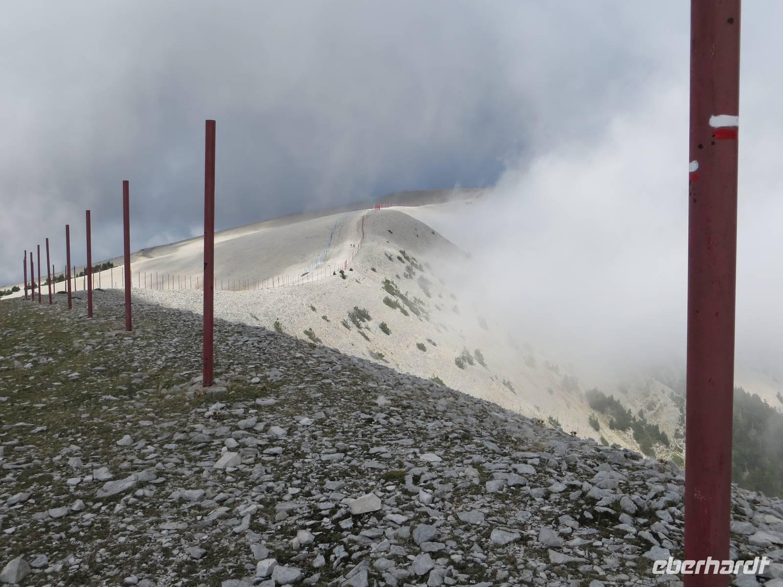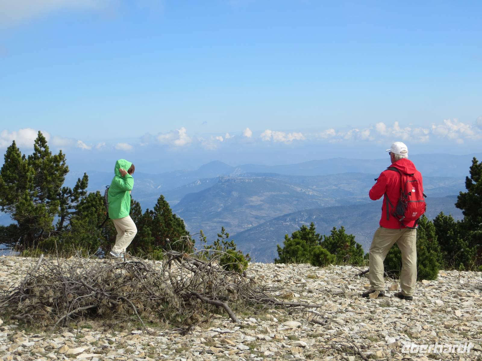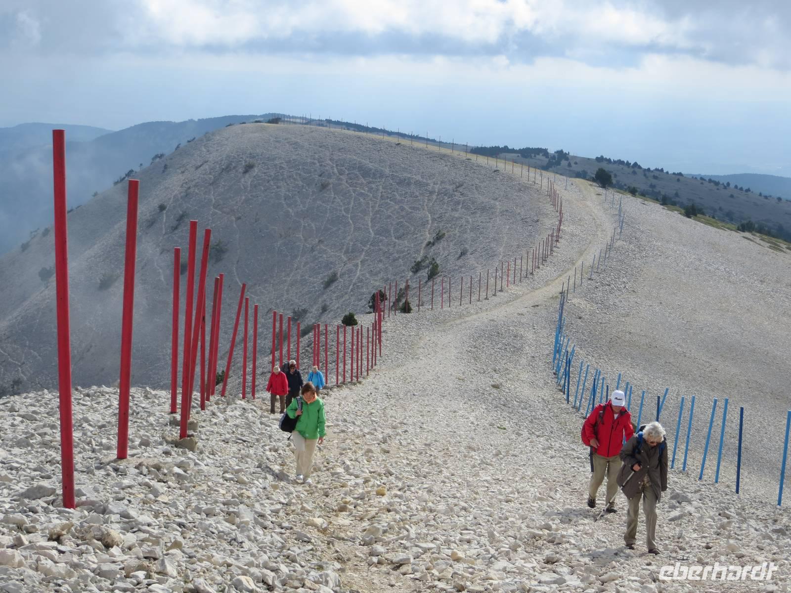 Der Berg der Provenc, der „Windberg" - Mont Ventoux - erwartete uns. Von Arles fuhren wir über Avignon, Carpentras durch das Weinbaugebiet am Ventoux bis zum Chalet Reynard in 1450 Meter Höhe. In einer steilen Rinne ging es auf den langgezogenen Ostrücken des Berges. Die Sicht war mitelprächtig: von Südwesten zogen Wolken auf und hinter dem Kamm in den Tälern der Nordseite wabbelte der Nebel. Aber immer mal wieder war ein Blick frei, wenn auch nicht bis in die Seealpen an der italienischen Grenze. In knapp zwei Stunden stiegen wir hinauf auf den Col de Trompete in 1840 Meter Höhe. Um nicht Straße gehen zu müssen und ohnehin nicht mehr zu sehen als von dem erreichten Platz hoch oben in der Provence, drehten wir hier um. So hatten wir die Chance kurz nach 14 Uhr auf bekanntem Weg zum Chalet zu gelangen und zur besten Kaffeezeit noch in Arles anzukommen. Durch einem geplanten Hotelwechsel von Avignon nach Arles wurde so noch ein individuelles Kennenlernen dieser Stadt, mit Amphitheater, Arena, römischen Bädern und alten Kirchen an der Rhone möglich. (Wanderung 10 km, 400 Höhenmeter, moderat)