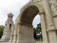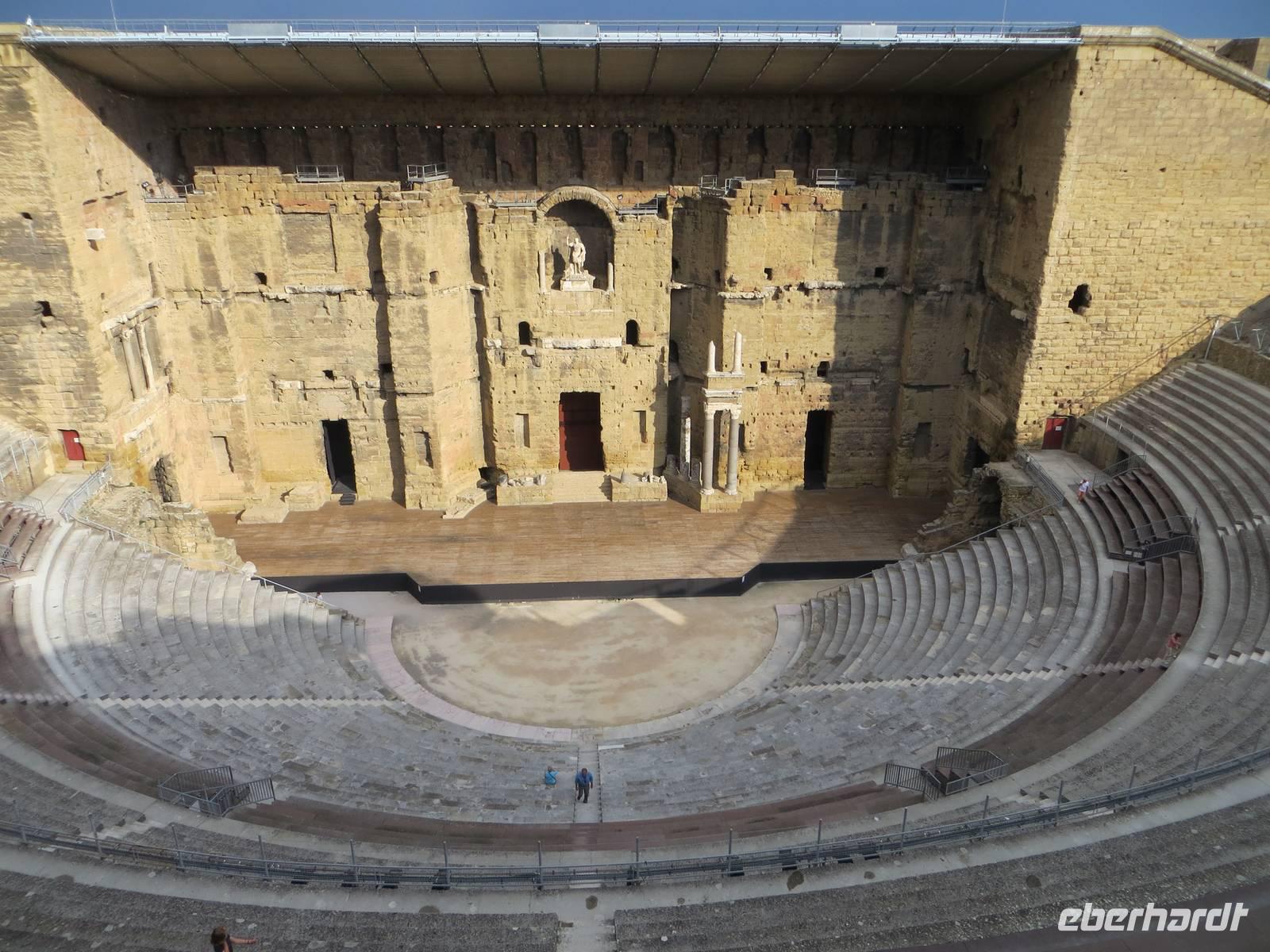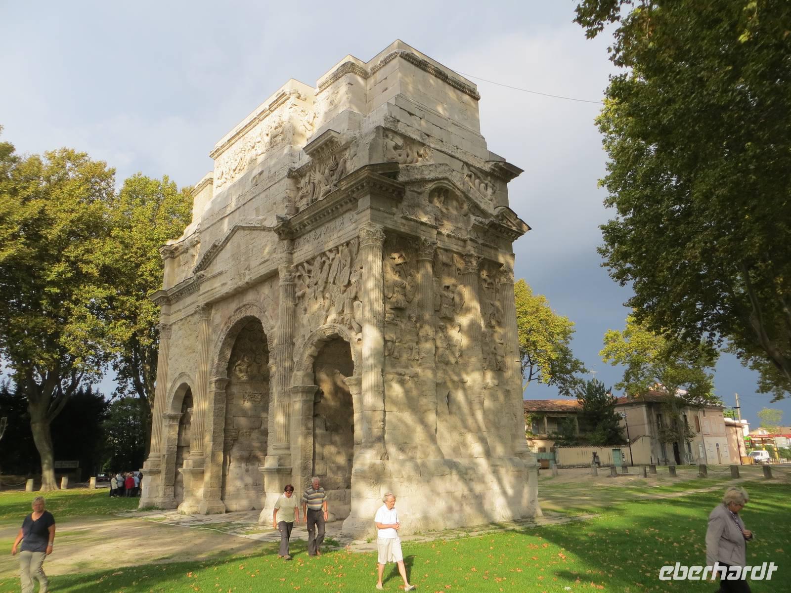 Wir entschieden uns in Anbetracht einer mächtigen Gewitterfront zunächst für den Besuch von Oranges. Zunächst ein Fotostopp am zweitausend Jahre alten Triumphbogen und dann Halt direkt neben dem Amphitheater. Das wollten sich die meisten Gäste nicht entgehen lassen, zumal es wohl die besterhaltene und größte Bühnenwand eines römischen Theaters in Europa sei - natürlich UNESCO-Welterbe. Anschließend blieb noch Zeit für ein Bummeln in den Gassen der Stadt und einem Besuch in der hiesigen Kathedrale Notre Dame, der man von außen durchaus die neunhundertjährige Geschichte ansieht. Das konnten wir bei durchaus prächtiger Sonne und dem Grollen von Gewitter in der Ferne erleben. Als wir gegen Mittag in Mornas eintrafen, sahen wir, was das mächtige Gewitter hier angerichtet hatte: riesige Pfützen und heruntergeschwemmter Kies. Über uns drohte bereitzs die nächste Gewitterfront. Denoch stiegen wir zur Festung Mornas hinauf und schauten ganz schnell in die Runde; mancher von einer eher sicheren Postion, mancher auch von einer verwegeneren. Bei guter Sicht sieht man von hier all die Berge und Hügel der vergangenen Reisetage: Mont Ventoux und Luberon, gar bis in die Alpen. AN diesem Tage war dies aber eher ein Erahnen.