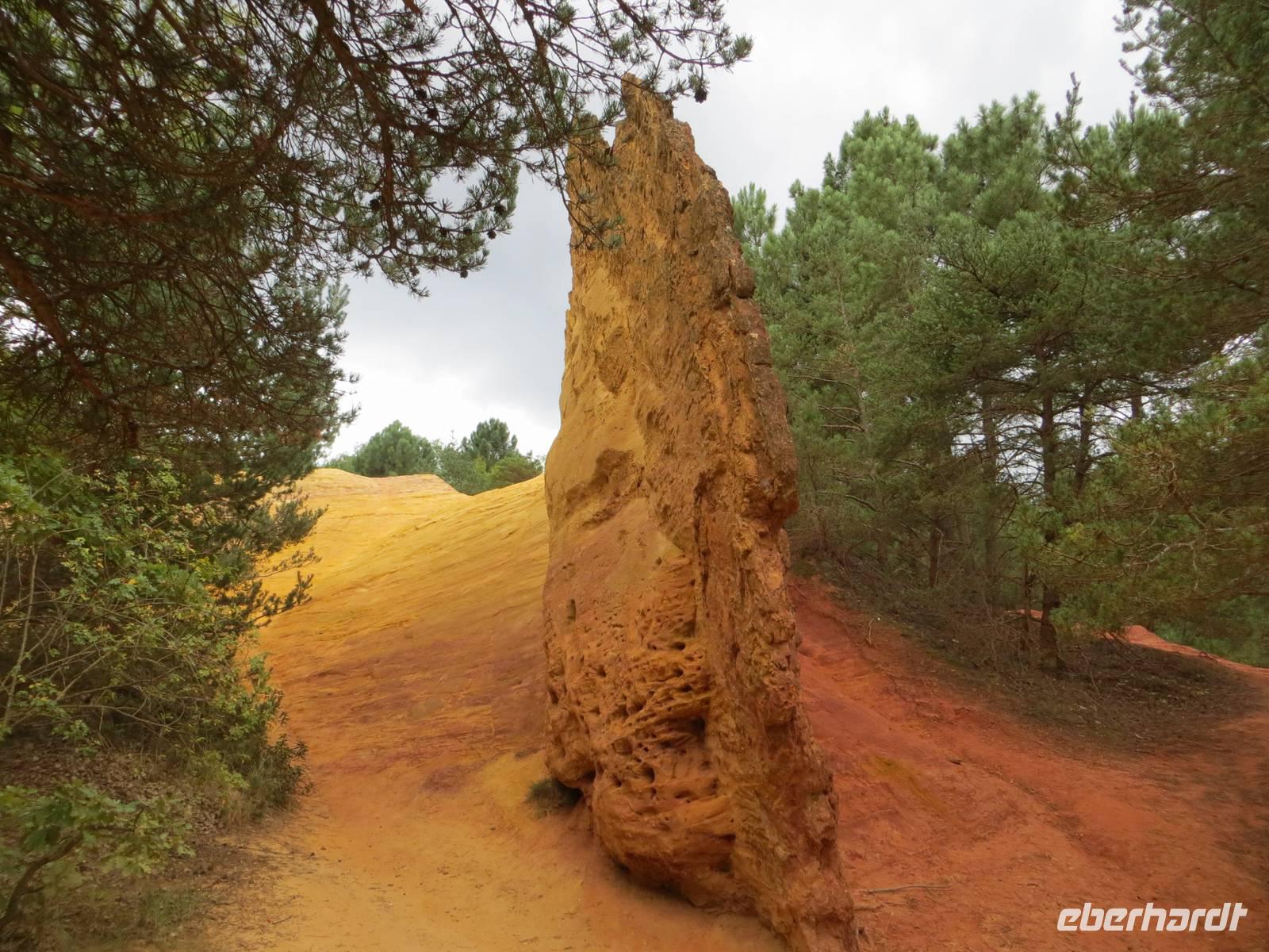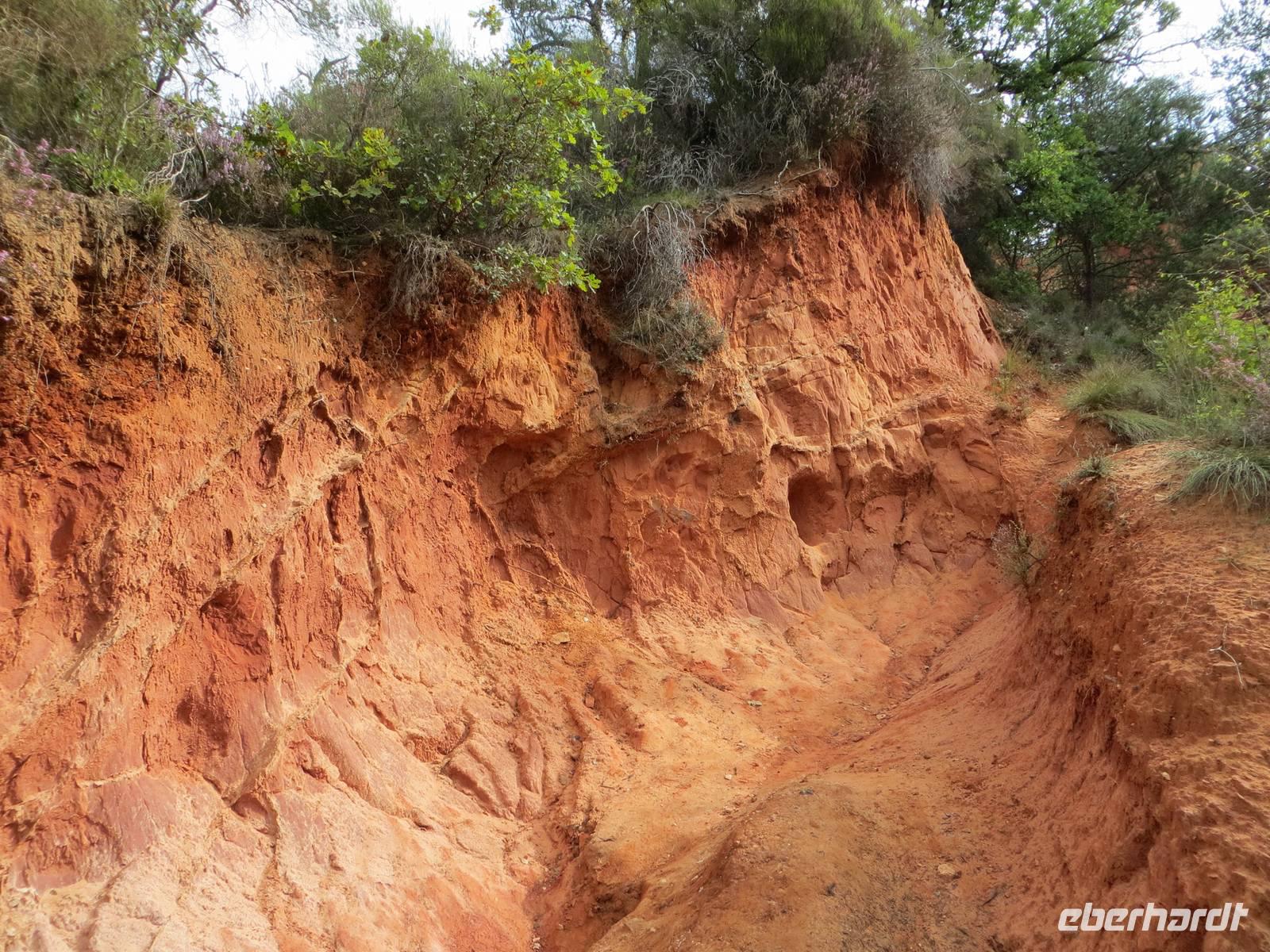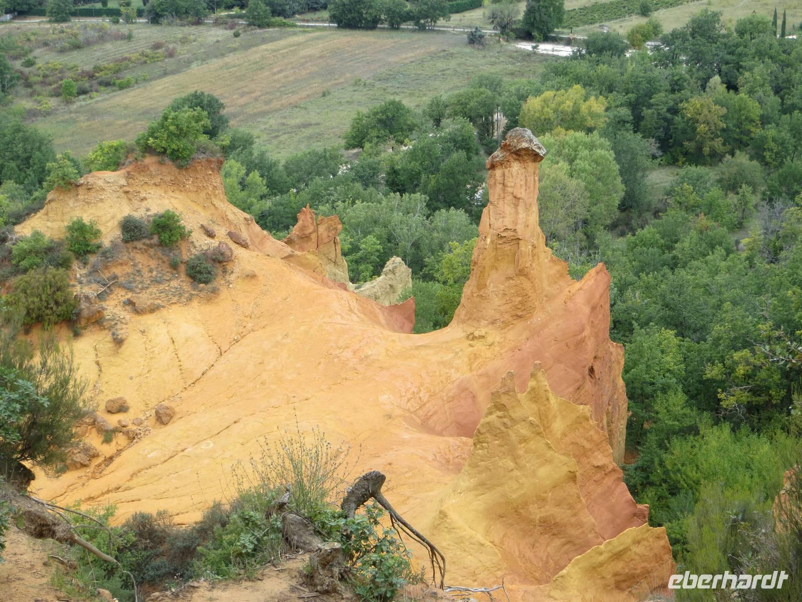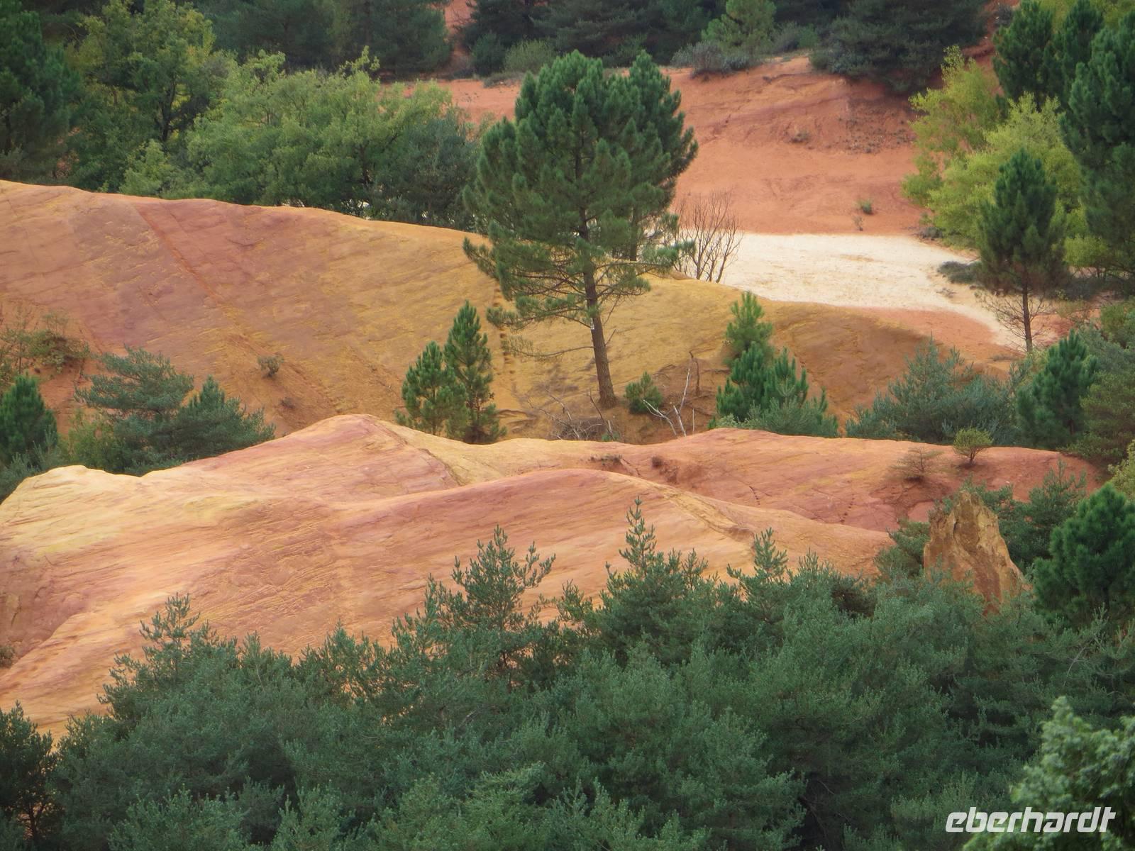 Nach fast zweistündiger Fahrt von Arles über den Luberon-Höhenzug und durch Apt erreichten wir das Dörfchen Rustrel mit seinem Parkplatz für die Besucher des Colorado provencial, einer Nachfolgelandschaft einstigen Ockerabbaus. Wir wählten den mittelgroßen Rundweg Nr. 2 und wanderten entlang des Weges der Feen in die Sahara. Der einstige Abbau des farbnuancenreichen Ockers und die natürliche Erosion haben eine farbenfrohe, erdige Landschaft mit interessanten Erdgebilden im grünen Wald hinterlassen.
