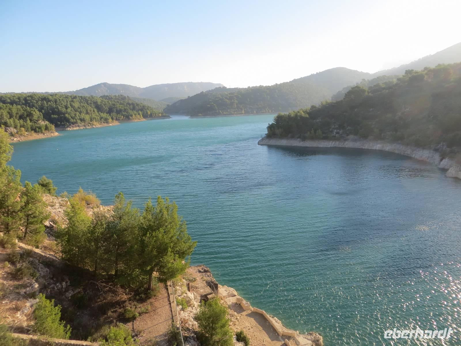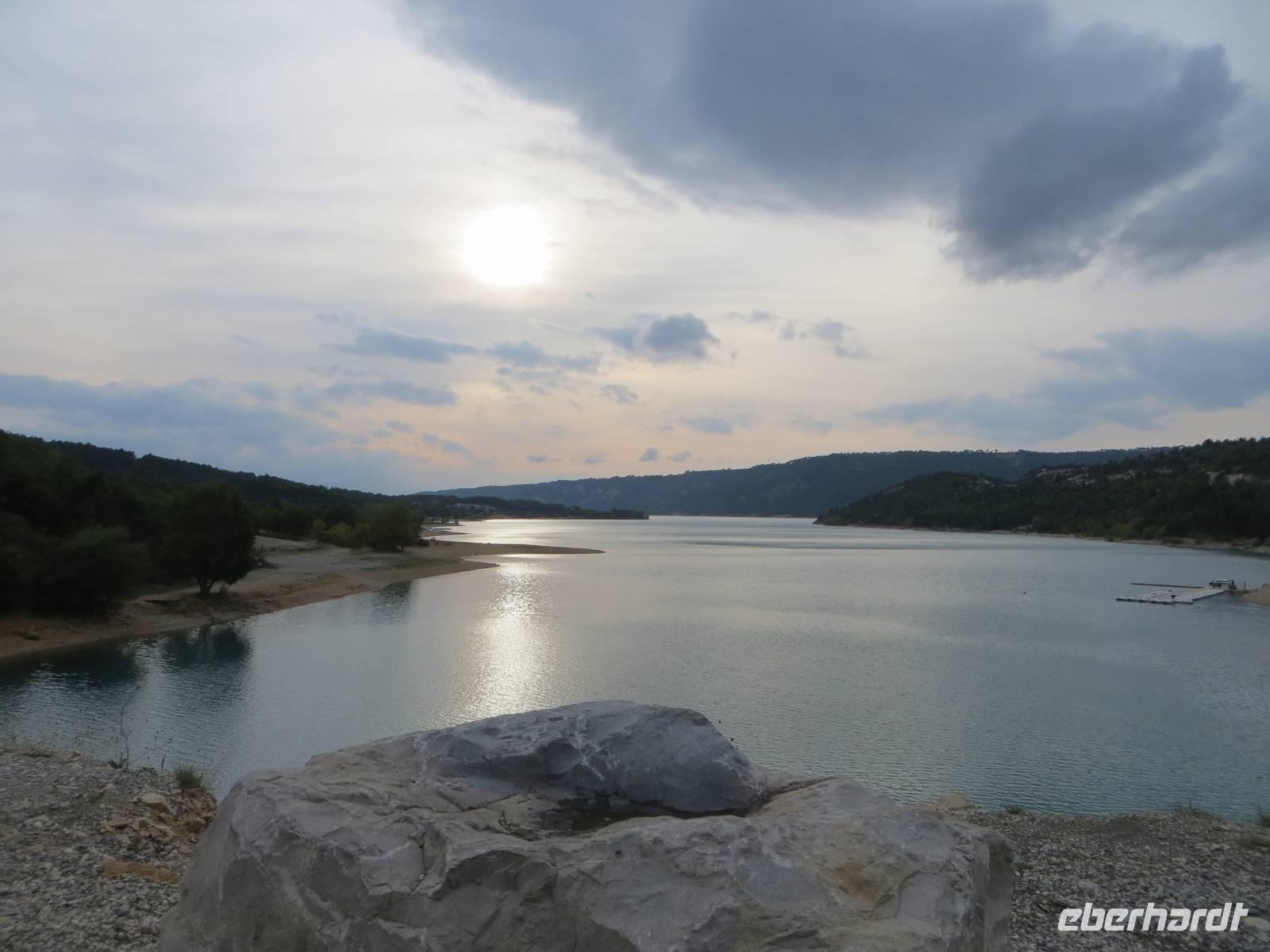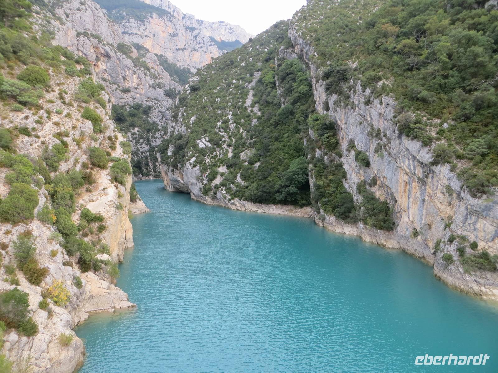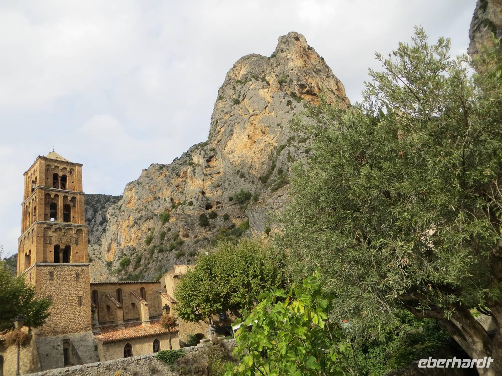 Wir lagen bei unserer Fahrt in den Osten der Provence gut in der Zeit und konnten einen zusätzlichen Stopp in Moustier St. Marie einlegen. Bereits aus der Ebene fasziniert dieses kleine Dörfchen am Felsenrand mit seiner Kapelle hoch oben in den Felsen. Zeit für einen Aufstieg an der Grotte der Magdalena vorbei, für ein Eis oder ein Glas Wein im Ort oder die Suche nach einem Souvenir, hier in Moustier natürlich Fayencen. Bei etwas milchigem Spätnachmittagslicht machten wir dann noch einen Fotostopp an der Einmündung des Verdon in den Stausee Lac Croix. Im Hotel Ermitage erwartete uns ein großzügiges und leckeres Abendessen, Vorspeise und Hauptgericht aus Kalbfleisch, dazu ein Schluck (oder mehr) vom Roten oder Angerötetem. (Wanderung 4 km, leicht)