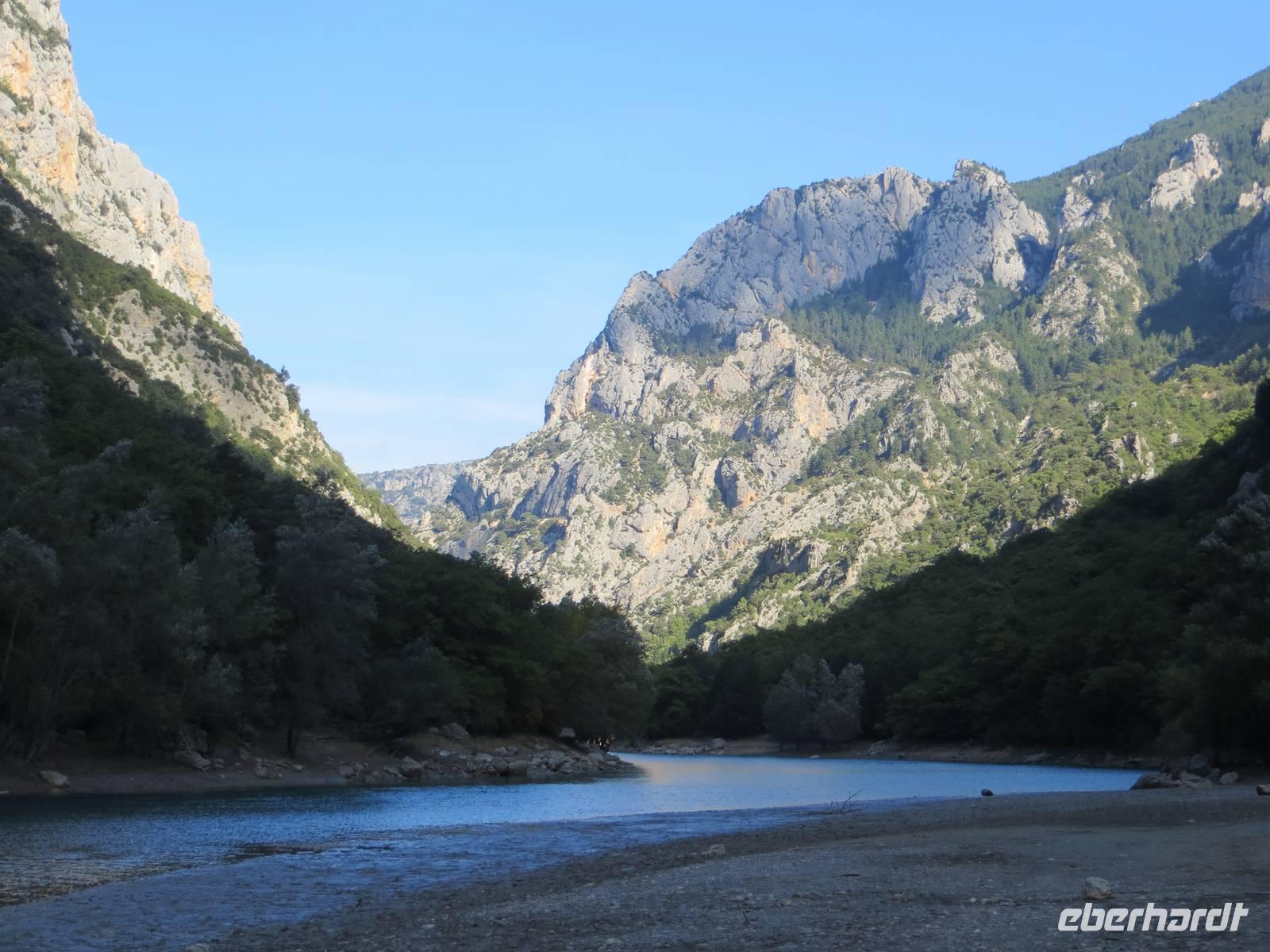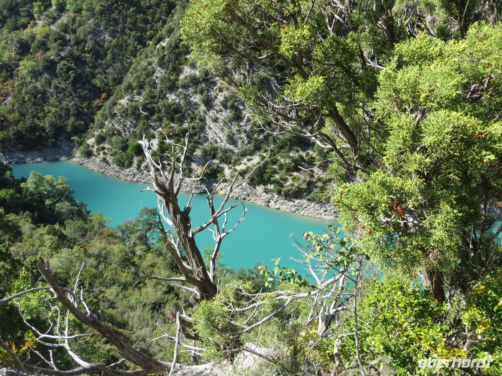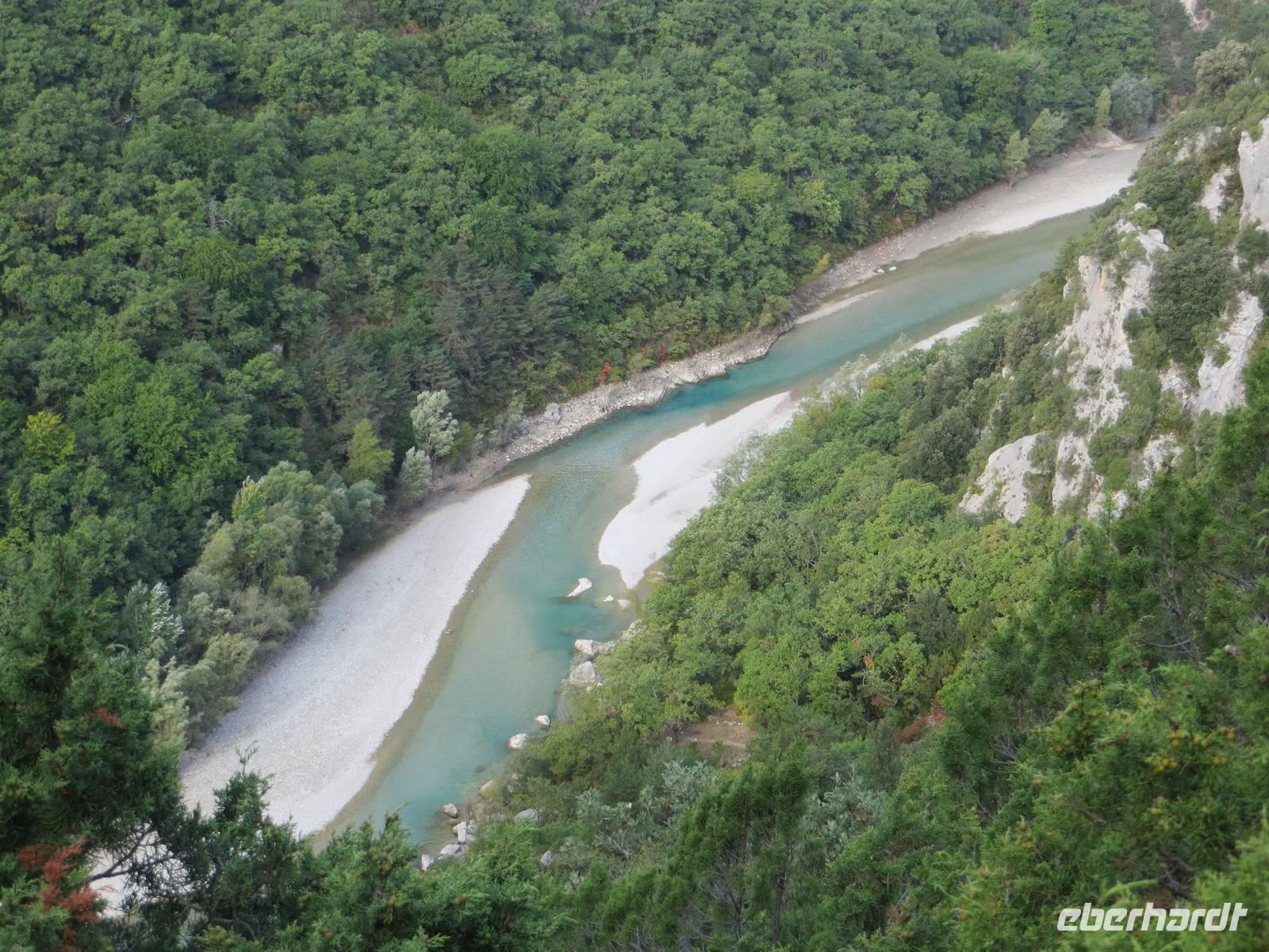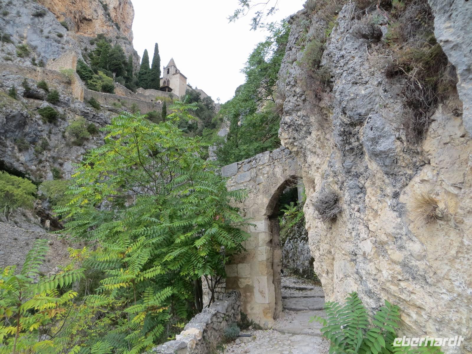 Wir lagen bei unserer Fahrt in den Osten der Provence gut in der Zeit und konnten einen zusätzlichen Stopp in Moustier St. Marie einlegen. Bereits aus der Ebene fasziniert dieses kleine Dörfchen am Felsenrand mit seiner Kapelle hoch oben in den Felsen. Zeit für einen Aufstieg an der Grotte der Magdalena vorbei, für ein Eis oder ein Glas Wein im Ort oder die Suche nach einem Souvenir, hier in Moustier natürlich Fayencen. Bei etwas milchigem Spätnachmittagslicht machten wir dann noch einen Fotostopp an der Einmündung des Verdon in den Stausee Lac Croix. Im Hotel Ermitage erwartete uns ein großzügiges und leckeres Abendessen, Vorspeise und Hauptgericht aus Kalbfleisch, dazu ein Schluck (oder mehr) vom Roten oder Angerötetem. (Wanderung 4 km, leicht)
