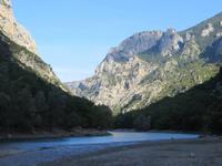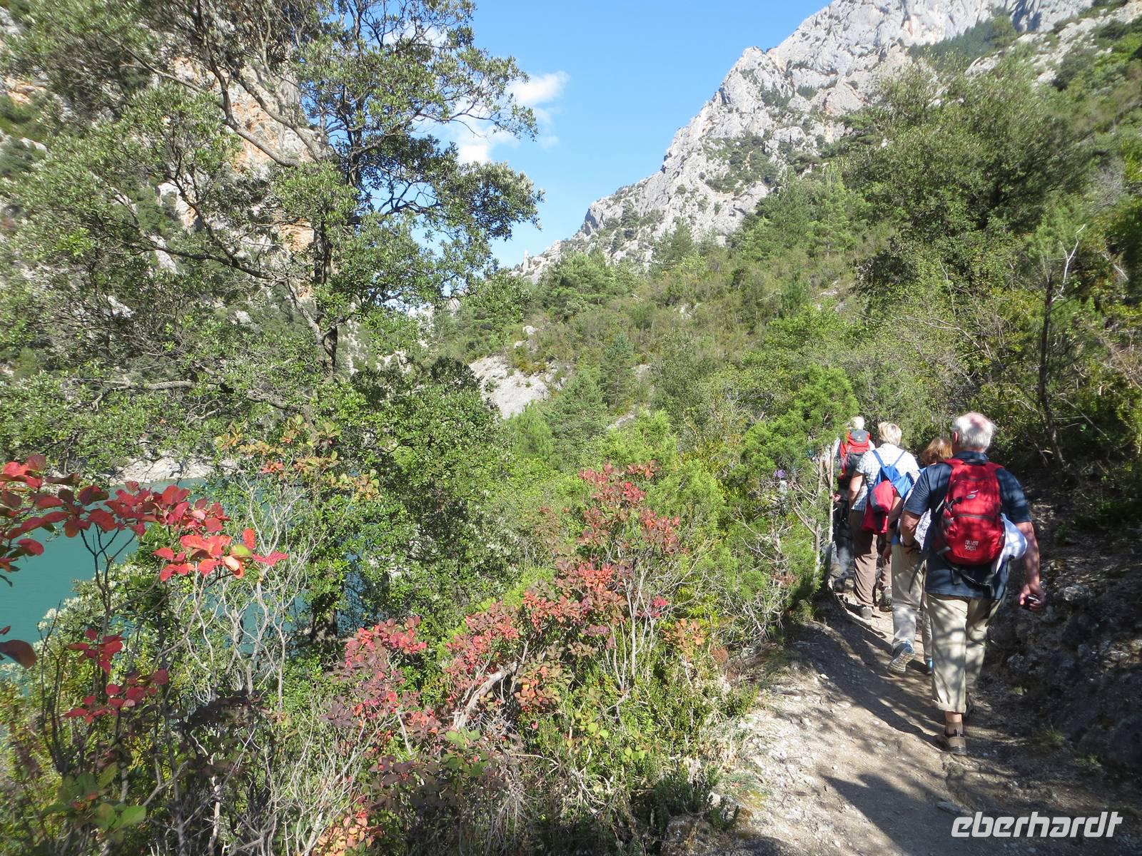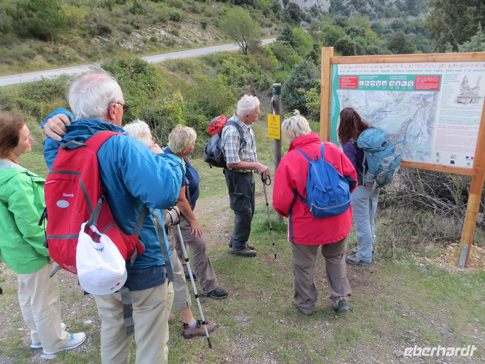 Eines der bedeutendsten Naturszenarien Europas erwartete uns heute: die Verdonschlucht. Mäandrierend fließt der Verdon durch ein Kalksteinplateau, mehr als dreihundert Meter sind es oftmals allein vom Schluchtgrund hinauf auf die Höhe der dem Flusslauf folgenden Straße; darüber weitere hunderte Meter Fels, aus deren Löchern und Höhlen Raubvögel aufsteigen. Der westliche Abschnitt der Gorges du Verdon, unweit des Stausees St. Croix, war Ziel der ganzen Gruppe, um eine mittelschwere Wanderung auf dem "Anglerweg" zu absolvieren. Geleitet von der örtlichen Wanderführerin Andrea führte der Weg bis an das Wasser des Verdon hinab und überwand mit einer kleinen via-ferrata-Stelle gut gesichert eine Felsnase. Nach drei Wanderstunden pausierten wir in warmer Herbstsonne, bevor einige noch weiter bis zu einer Grotte aufstiegen. Am Nachmittag ging es dann mit dem Bus zu weiteren Aussichten in die Verdonschlucht. Nach beeindruckenden Naturerlebnissen ging es über Castellane und Draguinagne nach Ais en Provence, unserem Übernachtungsziel und Ausflugsort des kommenden Tages. (Wanderung 7 km, moderat)
