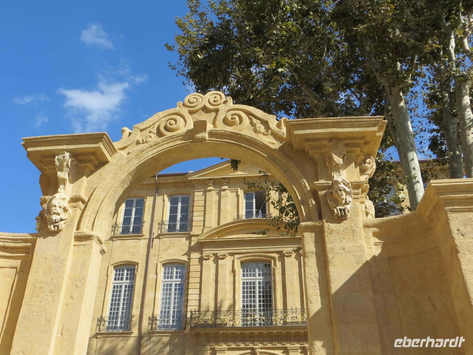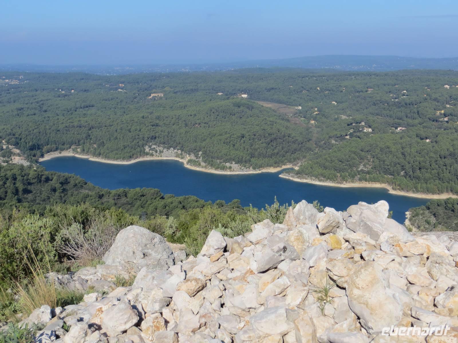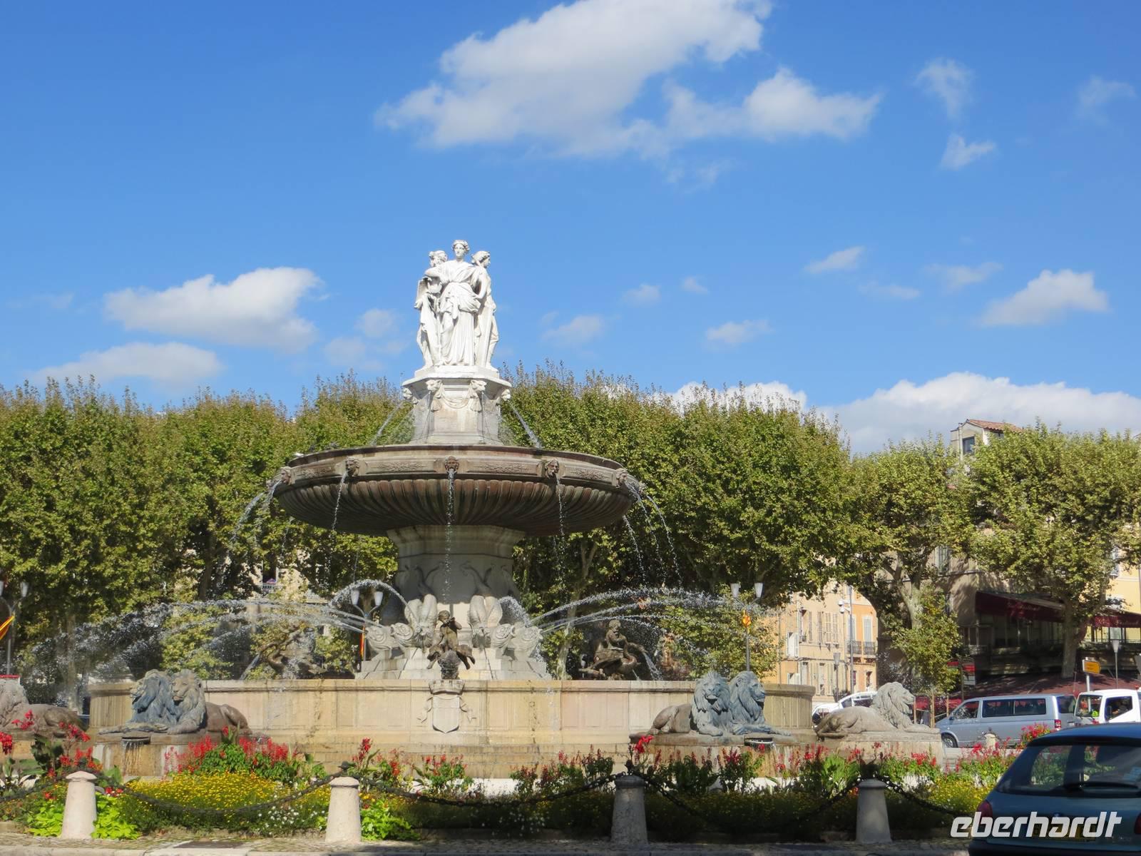 Fast vom Hotel aus könnte man den Hausberg von Aix sehen. Neunhundert Meter erhebt er sich über der Ebene mit einem markanten Kreuz. Die Südseite des Berges sieht sehr alpin aus. Alle Gäste nahmen zwölf Gäste gemeinsam die Besteigung über den langen Westgrat in Angriff. Vom Stausee Bimont stiegen wir auf gut markiertem, bald schmalen und steinigen Pfad nach oben. Nach ein und einer halben Stunde hatten wir dreihundert Höhenmeter bewältigt und einen Vorgipfel bezwungen. Mächtige Sturm war oberhalb der Baumgrenze aufgekommen. So entschlossen wir uns am Sattel unterhalb des Hauptgipfels zum Rückzug, nicht ohne ein „"Vorgipfelfoto" zu machen und in die weite provencialische Landschaft zu schauen. Mit viel Sonne stiegen wir zum Stausee ab und hatten nach geschwinder Fahrt zum Hotel ein wenig Zeit fürs Duschen, bevor wir zum Stadtbummel in Aix aufbrachen. Wir bummelten durch das Zentrum von Aix, vorbei an Adelspalästen aus dem 17. Jahrhundert, dem Ursprungsgebäude der Universität und durch die Gassen der Altstadt; natürlich auch vorbei an den Brunnen der Stadt, denn es war das Wasser, was der Stadt den Namen einst gab. So war es ein nicht so anstrengender und mannigfaltiger Reisetag. (Wanderung 6 km)