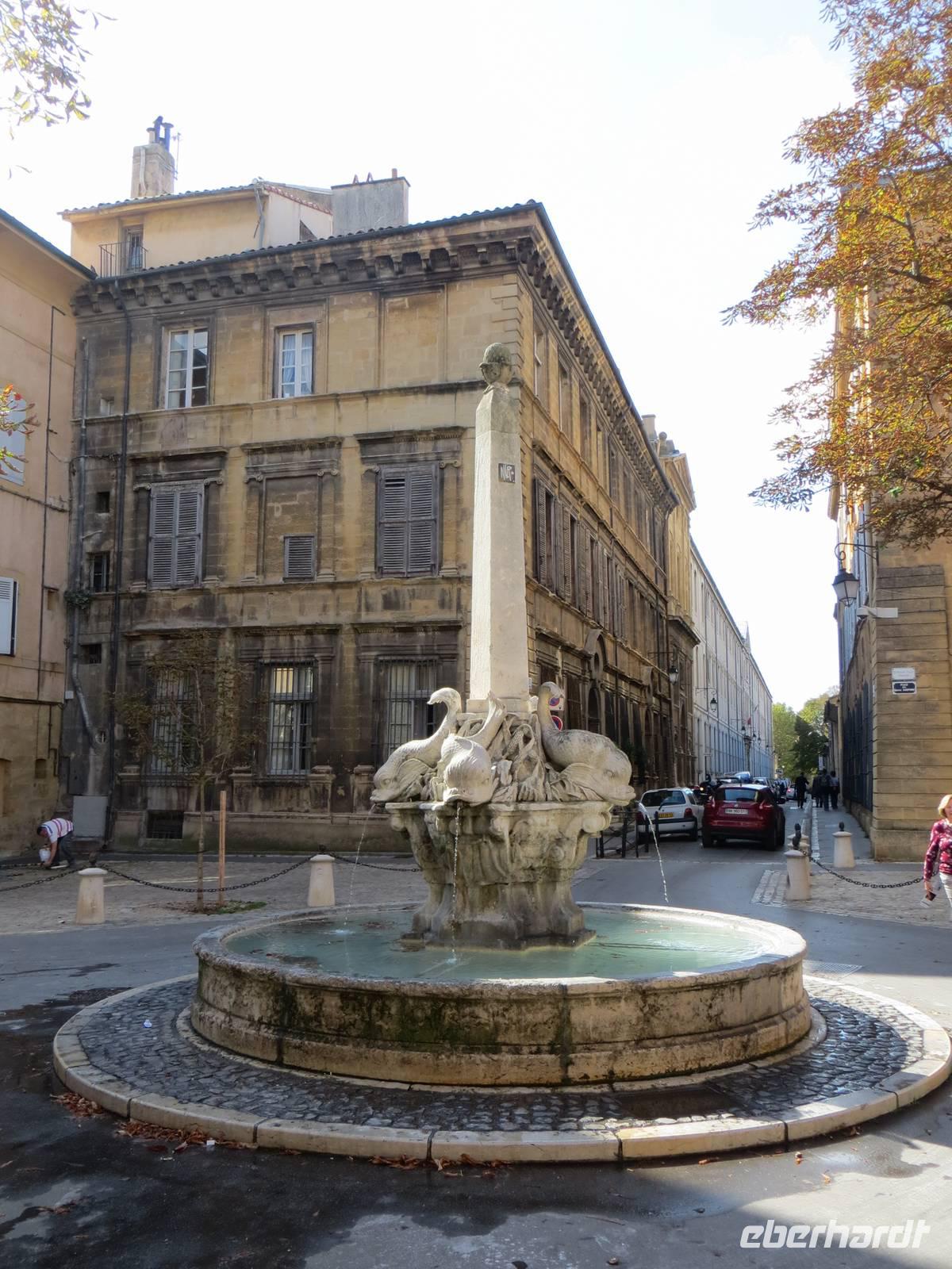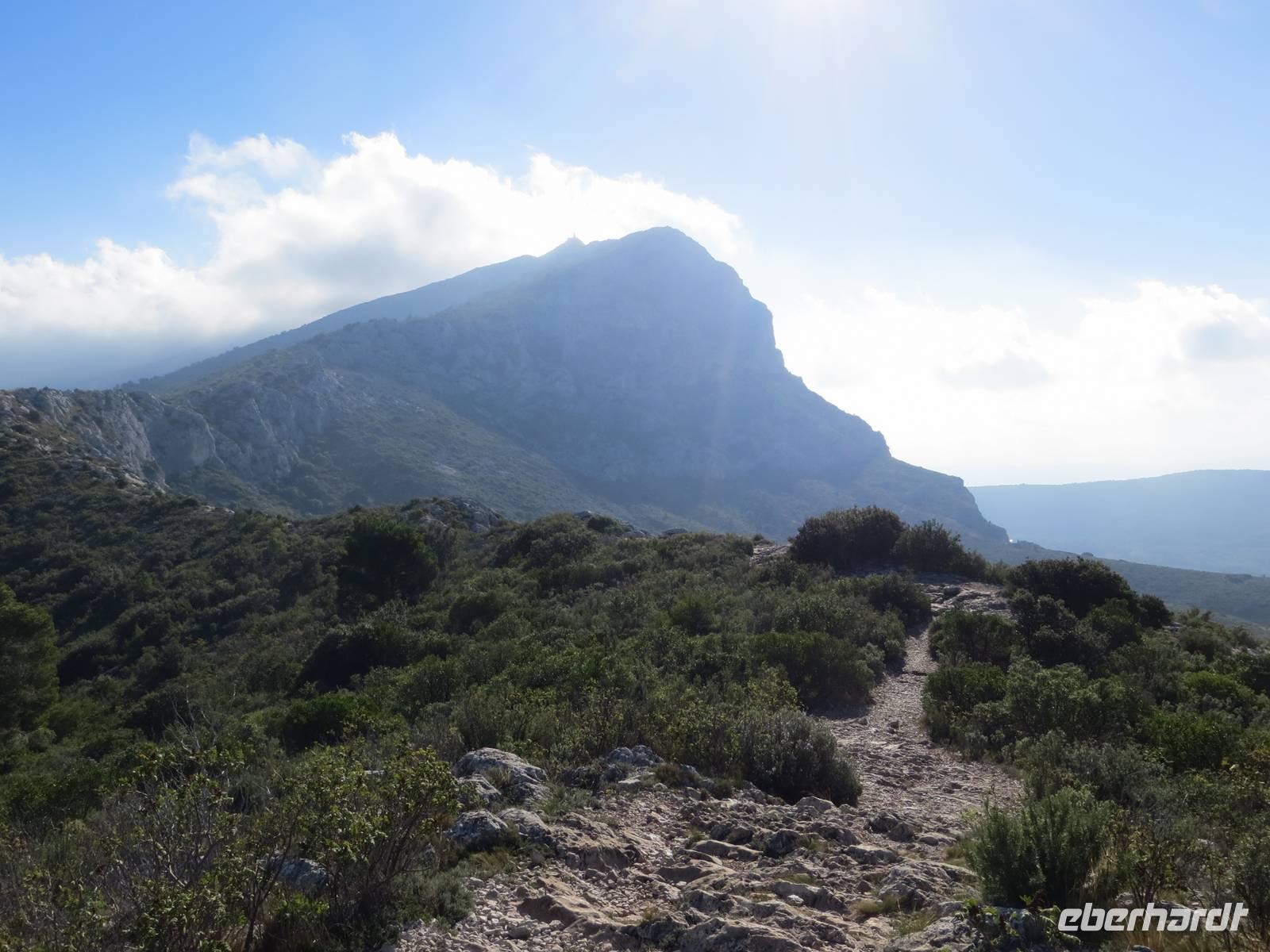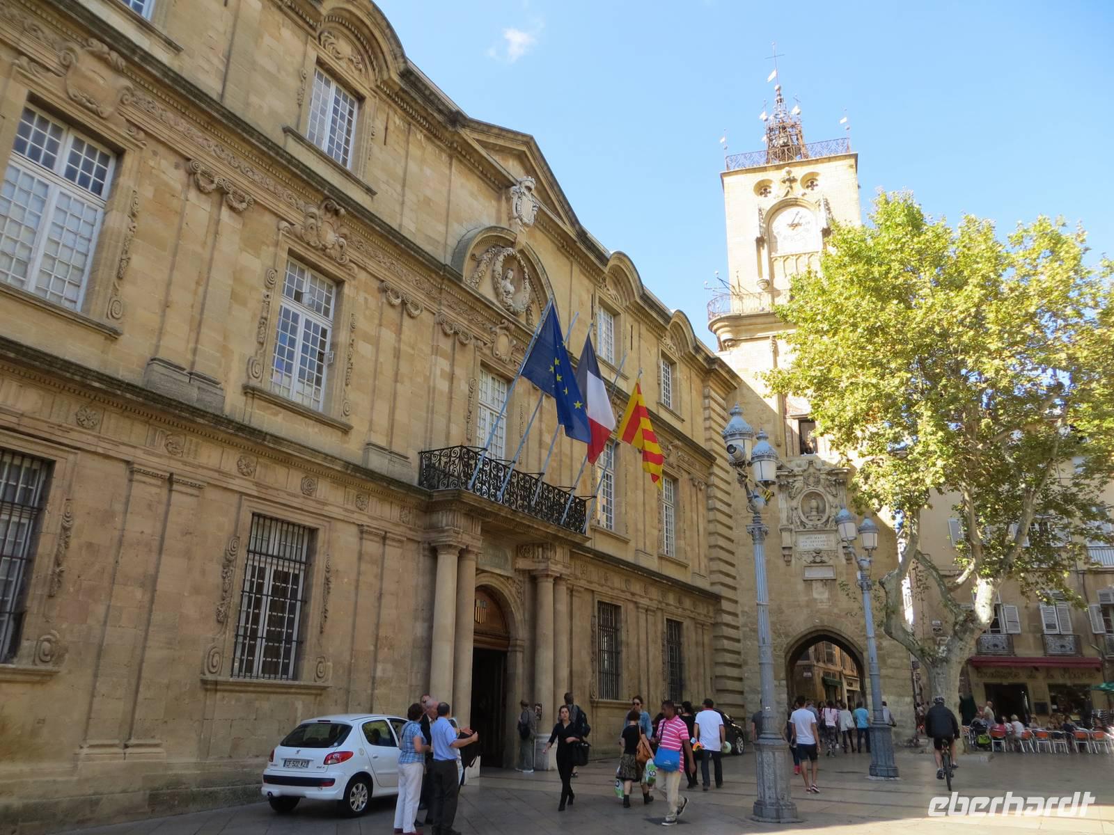 Fast vom Hotel aus könnte man den Hausberg von Aix sehen. Neunhundert Meter erhebt er sich über der Ebene mit einem markanten Kreuz. Die Südseite des Berges sieht sehr alpin aus. Alle Gäste nahmen zwölf Gäste gemeinsam die Besteigung über den langen Westgrat in Angriff. Vom Stausee Bimont stiegen wir auf gut markiertem, bald schmalen und steinigen Pfad nach oben. Nach ein und einer halben Stunde hatten wir dreihundert Höhenmeter bewältigt und einen Vorgipfel bezwungen. Mächtige Sturm war oberhalb der Baumgrenze aufgekommen. So entschlossen wir uns am Sattel unterhalb des Hauptgipfels zum Rückzug, nicht ohne ein „"Vorgipfelfoto" zu machen und in die weite provencialische Landschaft zu schauen. Mit viel Sonne stiegen wir zum Stausee ab und hatten nach geschwinder Fahrt zum Hotel ein wenig Zeit fürs Duschen, bevor wir zum Stadtbummel in Aix aufbrachen. Wir bummelten durch das Zentrum von Aix, vorbei an Adelspalästen aus dem 17. Jahrhundert, dem Ursprungsgebäude der Universität und durch die Gassen der Altstadt; natürlich auch vorbei an den Brunnen der Stadt, denn es war das Wasser, was der Stadt den Namen einst gab. So war es ein nicht so anstrengender und mannigfaltiger Reisetag. (Wanderung 6 km)