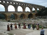 Am heutigen Tag hatten unsere Fahrräder Ruhepause, und unser Bus fuhr ohne Radanhänger ins nahegelegene Arles. Arles war eine bedeutende römische Stadt, und davon zeugen noch heute viele eindrucksvolle Bauwerke wie z.B. die Arena, das antike Theater und die Konstantinthermen. Während der gemeinsamen Stadtbesichtigung spazierten wir aber auch eine ganze Weile an der Rhône entlang, statteten dem „Nachtcafé" von van Gogh einen Besuch ab und besichtigten das Rathaus und die romanisch-gotische Kirche St. Trophime, besonders das schöne Portal! Samstags ist in Arles großer Wochenmarkt - das nutzten wir natürlich, um so hautnah die Spezialitäten der Provence kennenzulernen und das farbenfrohe Getümmel zu genießen. Wir hatten reichlich Zeit dafür, denn erst nachmittags fuhren wir mit dem Bus weiter nach Remoulins und unternahmen von dort aus einen Spaziergang zum eindrucksvollen Pont du Gard - dem wohl bekanntesten römischen Aquädukt, das in mehreren Ebenen ein ganzes Tal überspannt. Wir hatten - neben dem sonnigen Wetter - auch noch zusätzlich Glück, denn an diesem Tag war am Pont du Gard ein ganzer Verein in historischen Trachten zu einem Fotoshooting. Das gefiel uns natürlich besonders! Da wir viel Zeit hatten, konnten wir das meisterhafte Bauwerk von allen möglichen Aussichtspunkten aus besichtigen. Am Ende hatten wir auch noch Zeit zum Kaffeetrinken im Besucherzentrum. Unser radfreier Tag war für uns sehr schön und erlebnisreich.