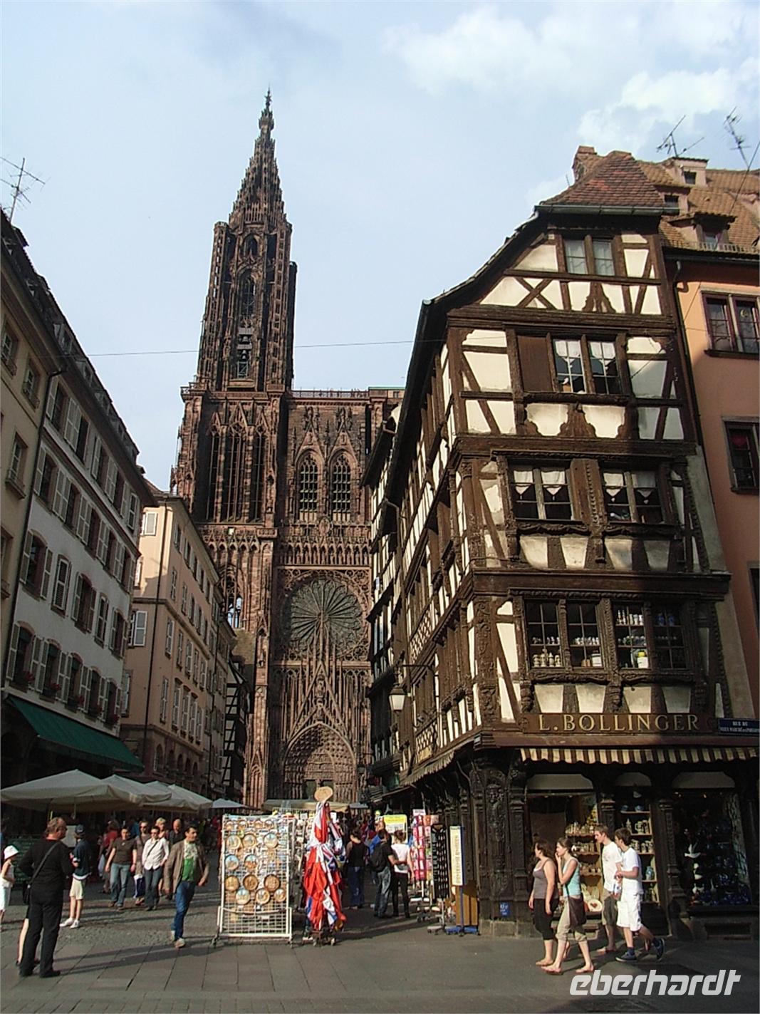 Nach einigen wenigen Schritten über den Place Kléber, den Gutenberg-Platz, vorbei am Kammerzell-Haus durch sehr belebte Gassen, erreichen wir die Kathedrale, das berühmte Straßburger Münster. Das Liebfrauen-Münster aus rosa Vogesensandstein mit seinem 142 m hohen Nordturm und seiner typischen asymmetrischen Form erhebt sich majestätisch vor uns. Das Wahrzeichen des Elsass war von 1647 bis 1874 das höchste Bauwerk der Welt. bewundern die Engelspfeiler, die astronomische Uhr und die Orgel.