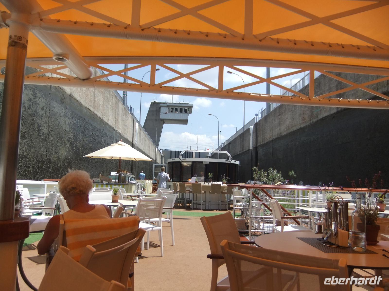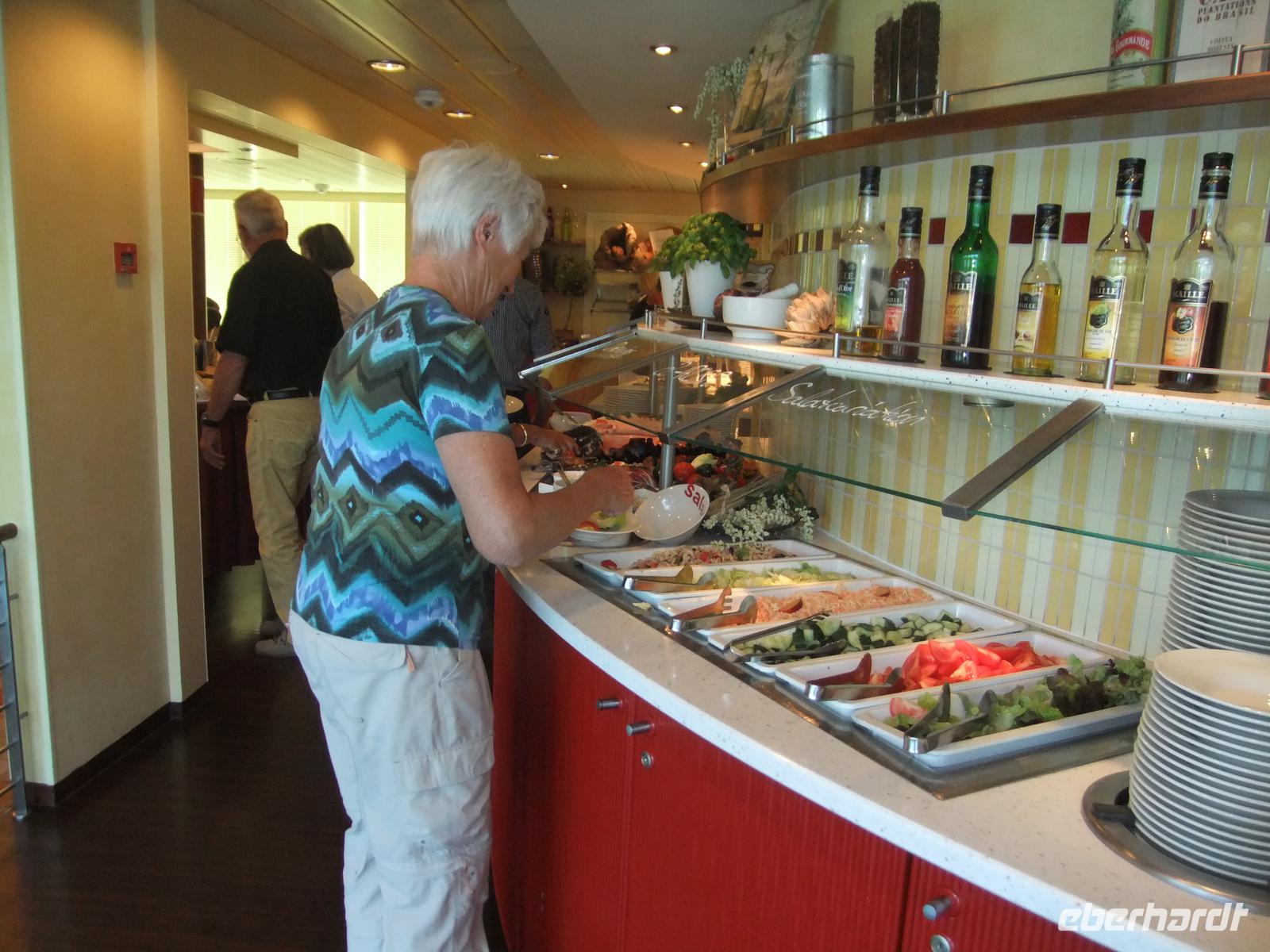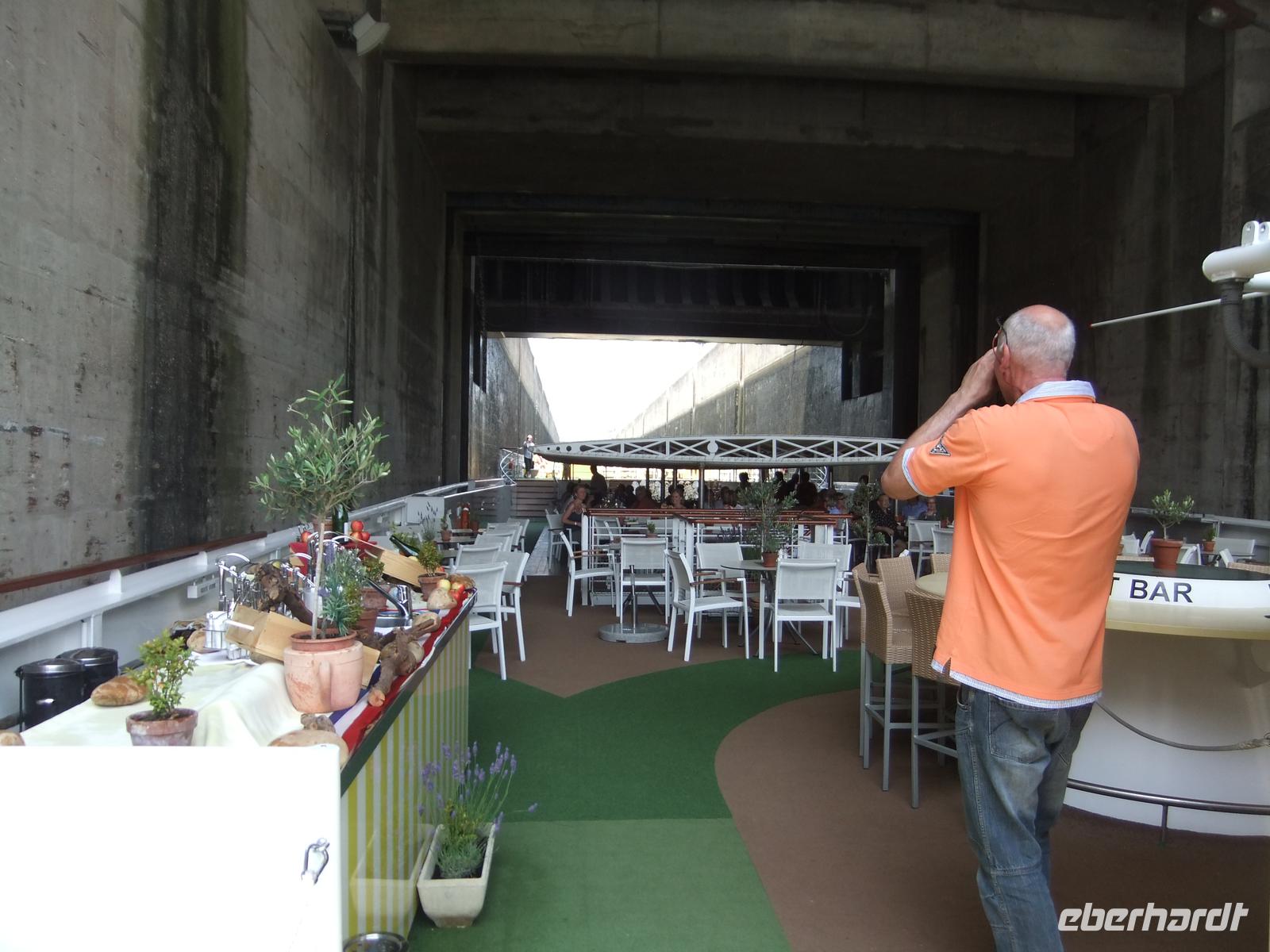 Die A Rosa wartet schon auf uns, 125 m lang, 11,4 m breit (das ist wichtig bei 11,6 m Schleusenbreite) mit maximal 174 Gästen, aber 51 Personen Personal, die sich um das Wohlergehen der Gäste kümmern. Das ist kein Ausflugsboot sondern ein schwimmendes Hotel mit allen Einrichtungen vom Sonnendeck über Restaurant, Bar, Lobby, gut ausgestattete, geräumige Kabinen, Wellness- und Fitness-Bereich, alles was man für eine Genießerreise braucht. Und das Schiff wurde in den neuen Bundesländern, auf der Neptunwerft in Warnemünde gebaut - geht doch. Die Gäste bekommen nach der Besichtigung des Schiffes alle notwendigen Informationen.