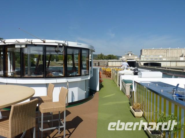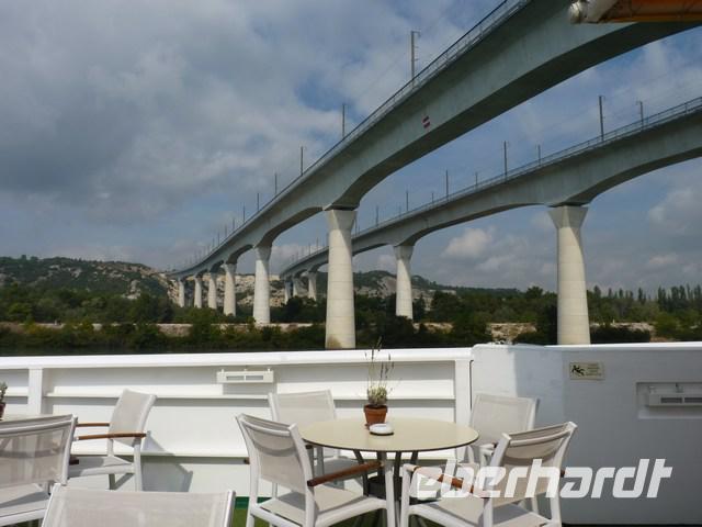 Das Schiff war inzwischen 40 km weiter gefahren und nahm uns in La Voulte-sur-Rhône wieder auf. Ein letztes Mal konnten wir vom Sonnendeck aus stundenlang die ruhige Flusslandschaft des Rhone bei einem Glas Wein genießen, bevor Abendessen und Verabschiedung durch die Crew den Tag beendeten.