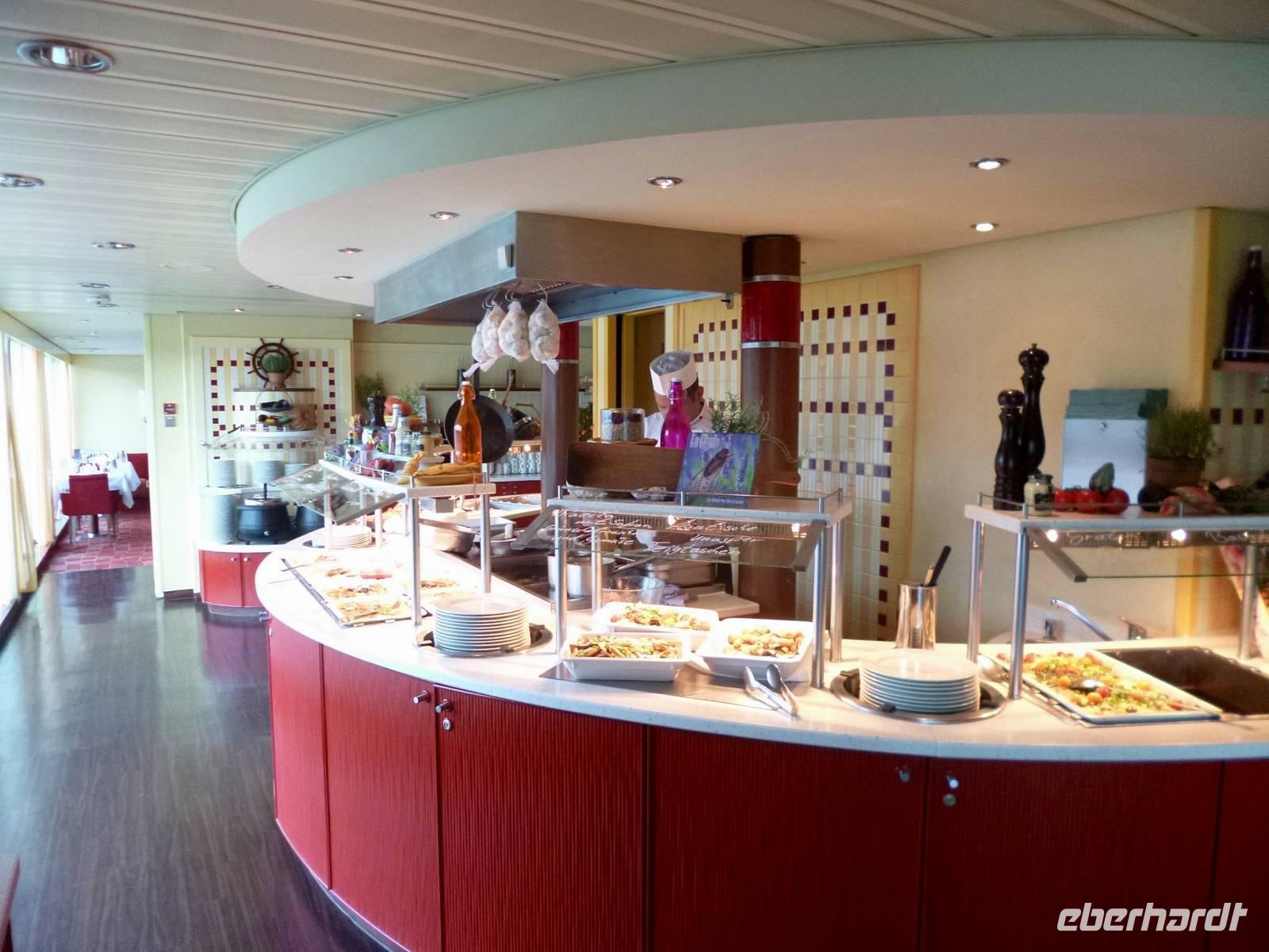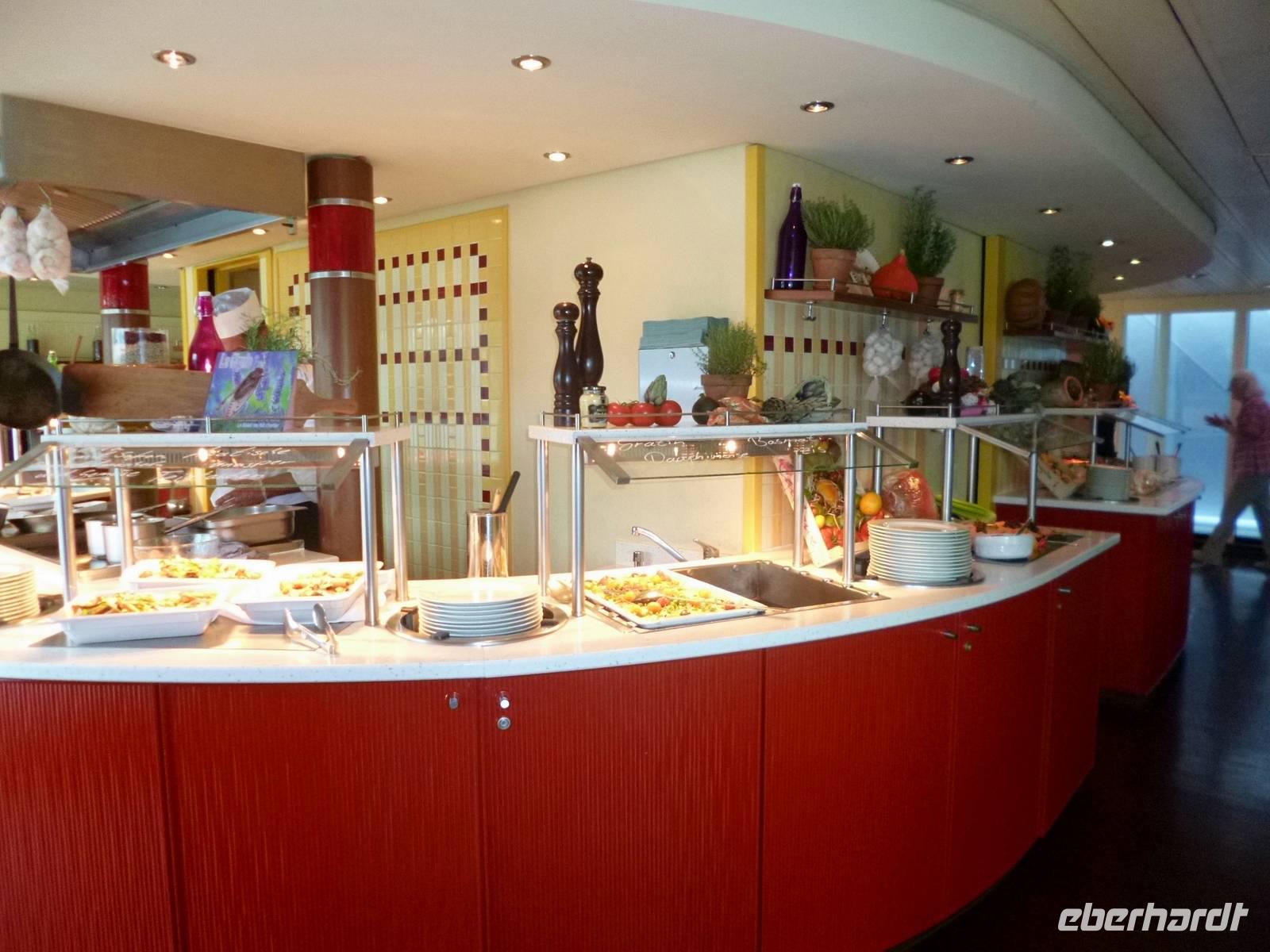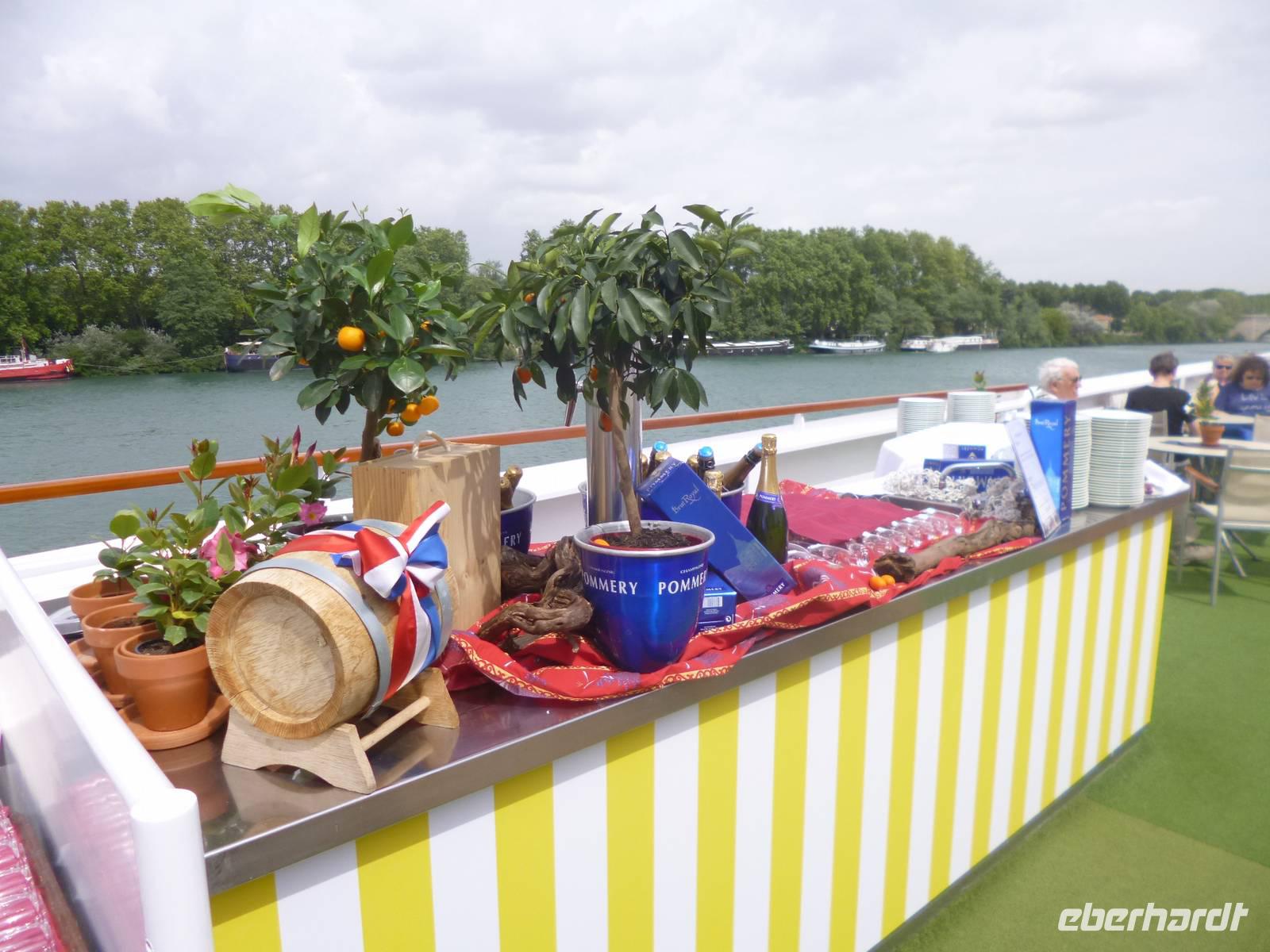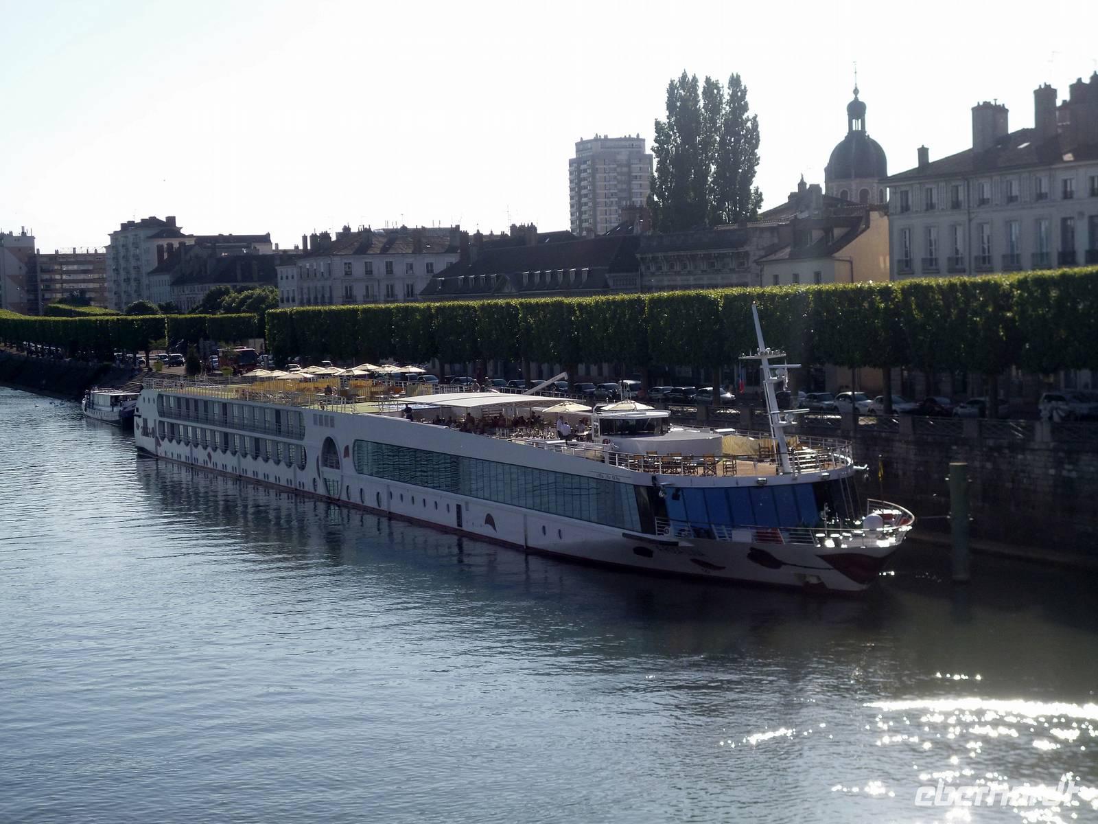 Der Verkehr Richtung Süden auf der „Autoroute du Soleil", der „Autobahn der Sonne" ist flüssig. Bisher sind wir sehr gut vorangekommen. Aber was wäre Frankreich ohne Stau. Auf den letzten acht Kilometern stecken auch wir vor dem Tunnel des Lyoner Fourvière-Hügels in einem „Bouchon". Mehrere Minuten später ist wieder freie Fahrt und wir können die letzten Kilometer zurücklegen. An der Anlegestelle der A-ROSA Luna werden wir bereits erwartet. Während die Crew sogleich für uns die Koffer auf die Kabinen befördert, überreicht der Hotelmanager der A-ROSA Luna allen Damen eine Rose. Nach dem Check-In bleibt Zeit zum Frisch machen, Koffer auspacken und Stärken bei einem kleinen Snack im Restaurant, bevor wir von unserem Gästebetreuer Florian zur Sicherheitsübung in die Lounge gebeten werden. Gleich im Anschluss stellt er uns die Landausflüge vor. Die Entscheidung über die Wahl der Ausflüge fällt nach wie vor schwer. Ebenso schwierig ist die Wahl dann später beim Abendessen am Büffet. So viele Leckereien, verlockend schön angerichtet. Da ist für jeden Geschmack etwas dabei.
