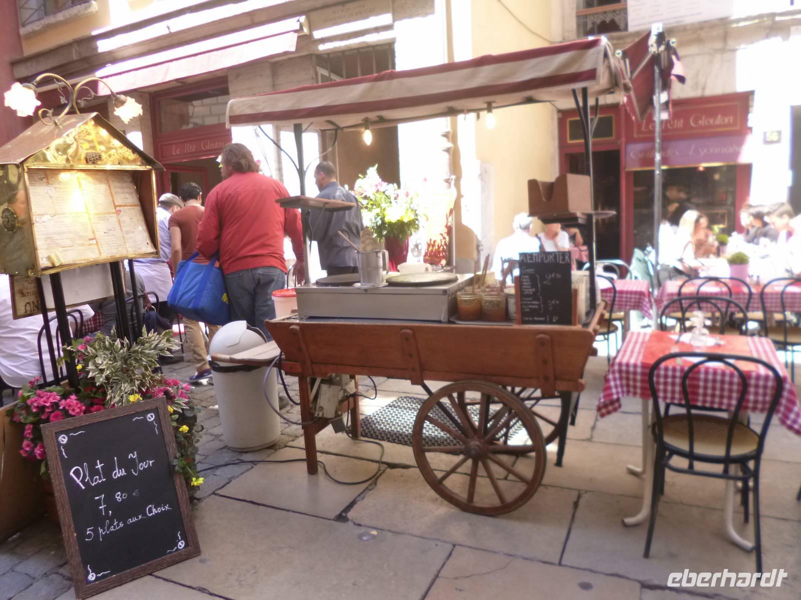 Nach dem für französische Verhältnisse reichhaltigen Frühstück setzen wir gut gestärkt unsere Reise in den Süden fort. Die letzten 500 Kilometer bis zur Anlegestelle unseres Flussschiffes A-ROSA Luna in Lyon liegen vor uns. Kaffeepause für Kaffeepause fühlen wir die steigenden Temperaturen. Die Sonne strahlt und Urlaubsstimmung stellt sich ein. Die Zeit nutzen wir, um uns die von der Reederei angebotenen Landausflüge während unserer Flussreise noch einmal genauer anzuschauen und bereits eine Auswahl zu treffen. Alles klingt sehr interessant.