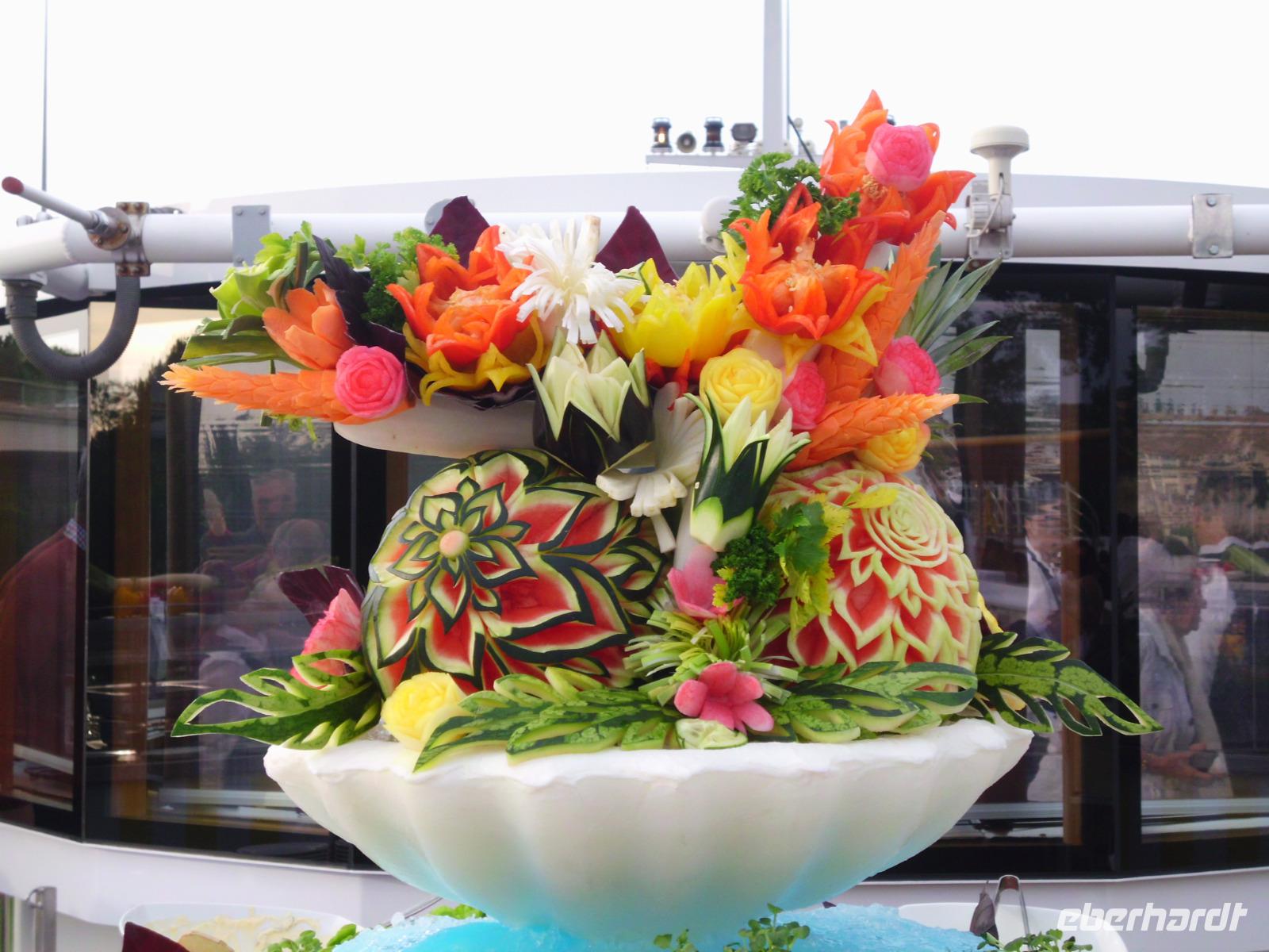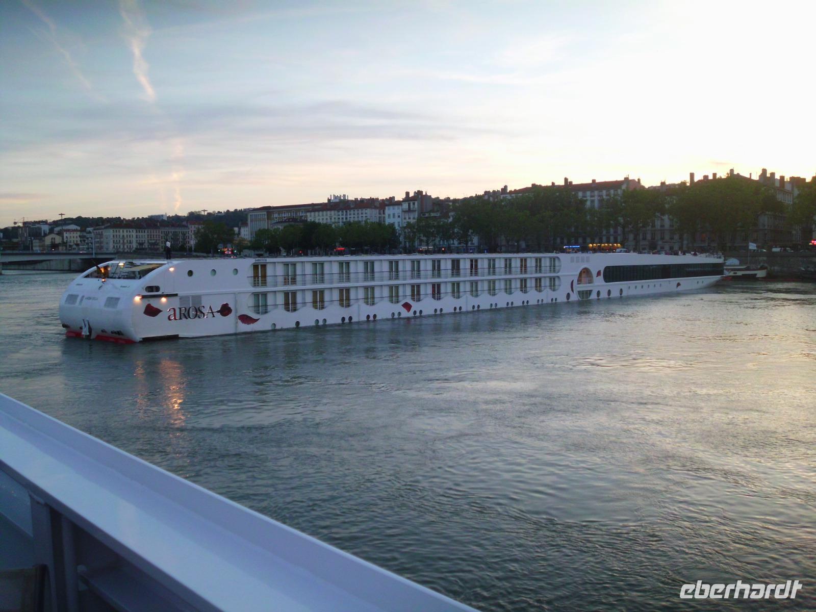 Dank „freier Fahrt" auf der Autobahn sind wir 15 Uhr am Schiff und somit die ersten Gäste, die aufs Schiff dürfen. Liebevoll ist der Empfang mit einer Rose- wie sollte es auf AROSA anders sein- durch Hotelmanager Herrn Lerch. Später sitzen wir endlich in der hellen gemütlichen Lounge des Schiffes und erhalten Informationen über das Ausflugsprogramm der ersten 3 Tage. Cruisemanagerin Stefanie Lämmerhirt steckt uns alle mit ihrer guten Laune an und wird sich auch später immer wieder als eine „echte Perle" des Schiffs erweisen, wenn es um Wünsche und kleine Probleme geht. Fix buchen wir noch die letzen Ausflüge, genießen das erste leckere Abendessen an Bord und finden uns 21 Uhr auf dem Sonnendeck zur Abfahrt des Schiffes ein. Beim Eintauchen in die abendliche Lichterwelt Lyons verblassen die Anstrengungen des Tages. Ein lauer Sommerabend bietet die Kulisse und wir ziehen mit einem Gläschen Coktail in der Hand vorbei an der erleuchteten Stadt.