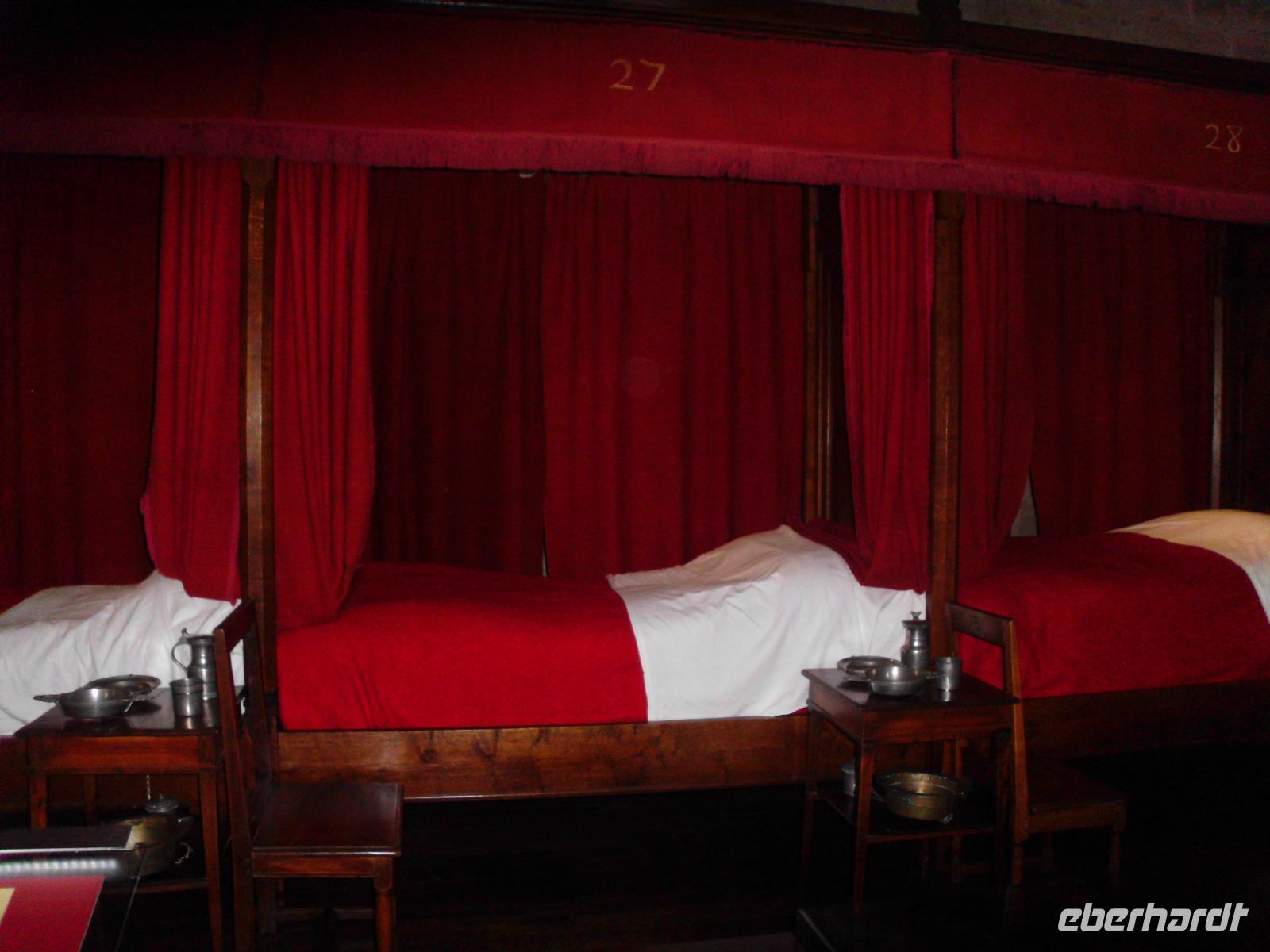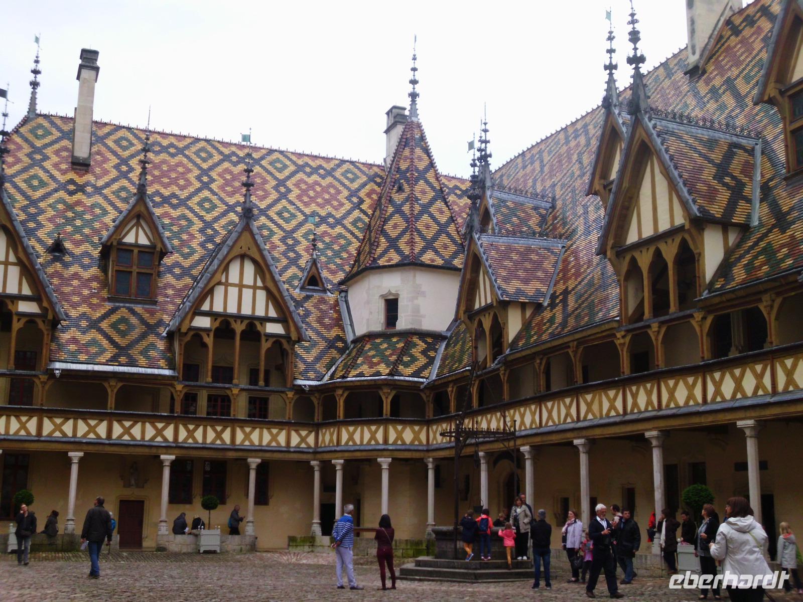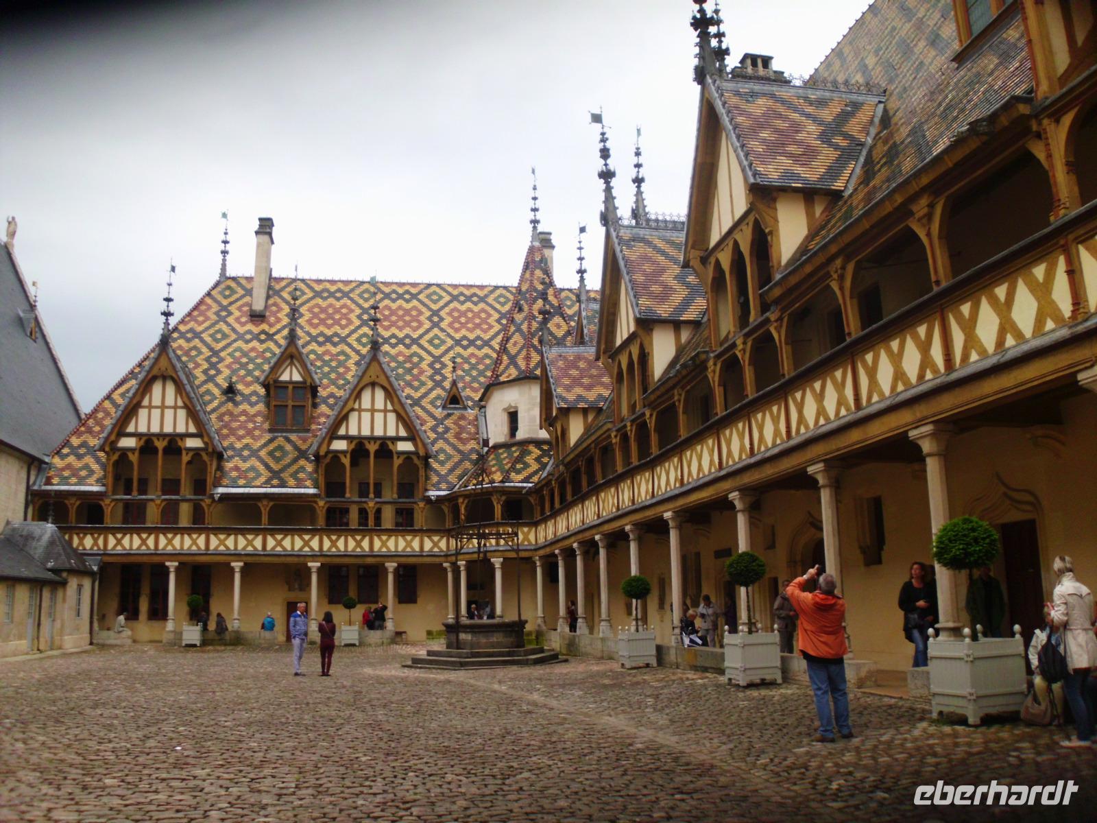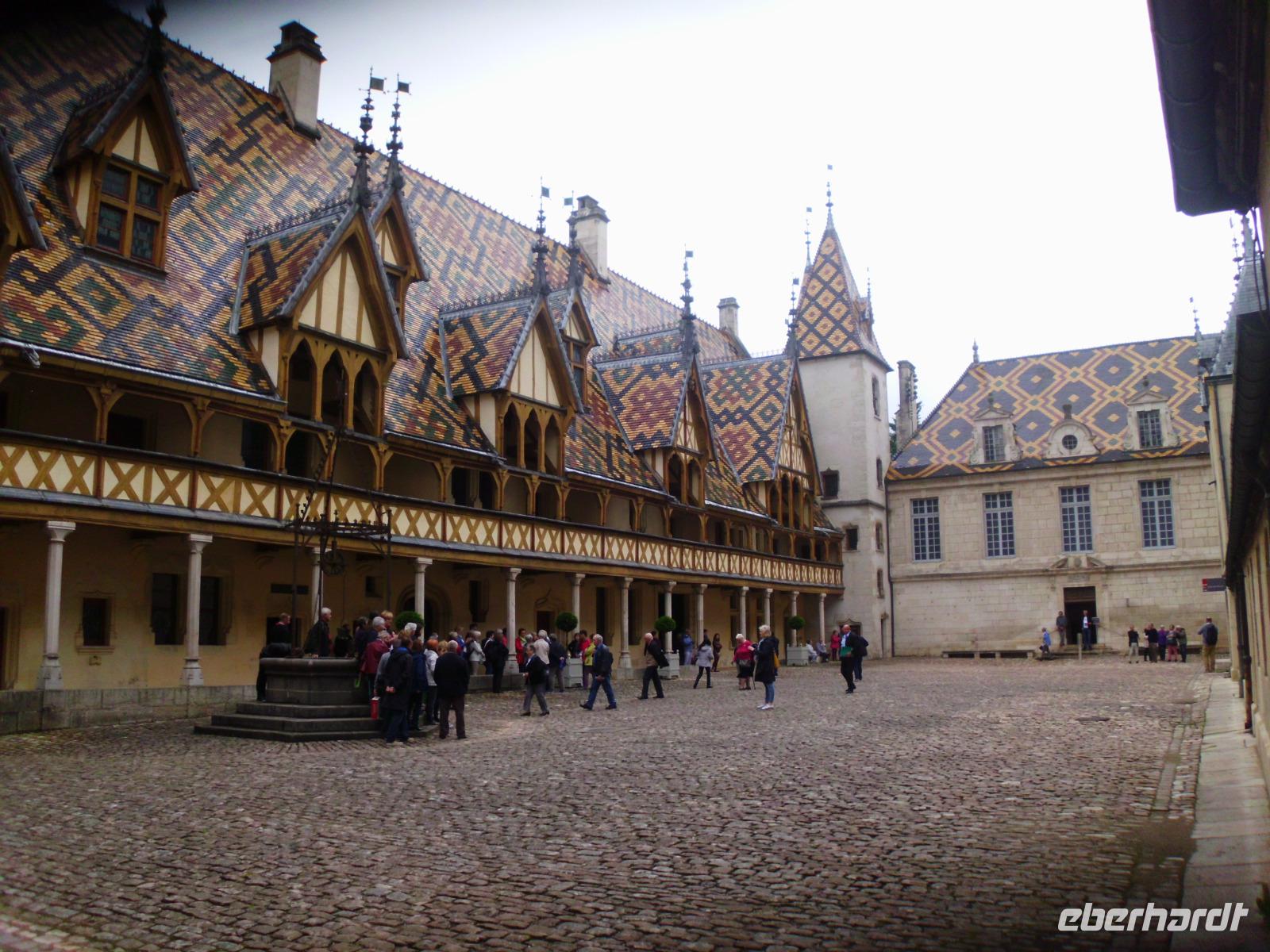 Die erste Etappe unserer Flussreise bewältigen wir auf der Saone und erreichen gegen Mittag nach 137 km das Städtchen Chalon - Sur -Saone und somit die nördlichste Stadt unserer Kreuzfahrt. Nach dem Frühstück gibt es in der Lounge die Informationen für die weiteren Ausflüge. Um 14 Uhr starten wir unseren Ausflug nach Beaune. Beginnend mit einer kleinen Stadtrundfahrt durch Chalon-Sur-Saone, machen wir später den 1.Fotostop im Weingebiet des Burgund und bestaunen seltene Pflanzen wie den Paulonia-Baum, eine herrlich blau blühende Pflanze. Ziel unserer Reise ist aber der Ort Beaune mit dem berühmten mittelalterlichen Krankenhaus „Hotel Dieu". Dessen Gründer Nicolas Rolin hat dieses beispielhafte Krankenhaus im 14.Jahrhundert als „Palast für die Armen" errichten lassen und seither fungierte es über 500 Jahre zu diesem Zweck. Erst seit 1977 ist es Museum und Altenheim. Nicht nur das Museum an sich beeindruckt, sondern auch die Architektur des Hauses ist überwältigend. Die Dächer sind mit farbig glasierten Dachziegeln gedeckt. Wir besichtigen die Schlafsäle, Laboratorium und Küche des Hauses.