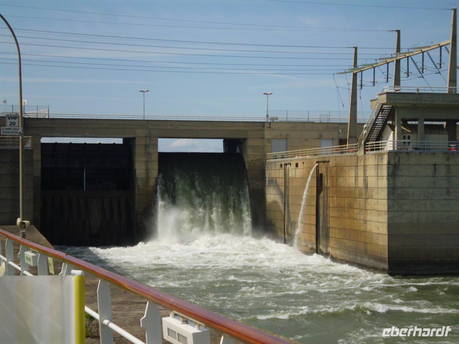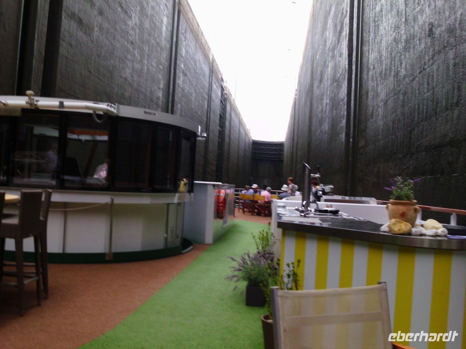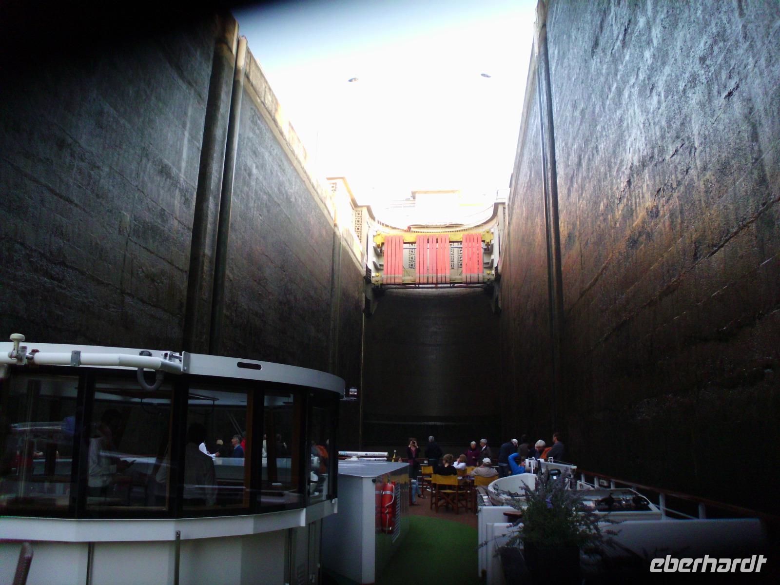 Abends gegen 20.30 Uhr erreichen wir die größte Schleuse unserer Fahrt mit 23m. Es ist beeindruckend, das Hinunterschleusen auf dem Sonnendeck mitzuerleben.