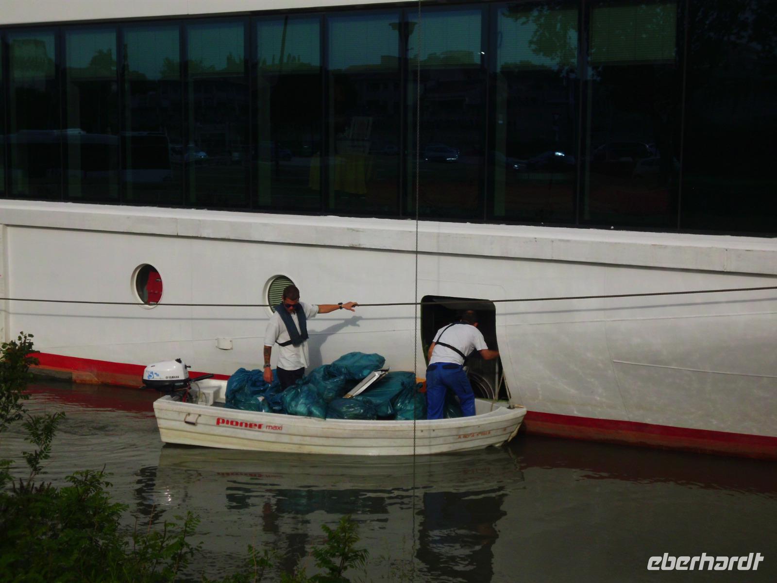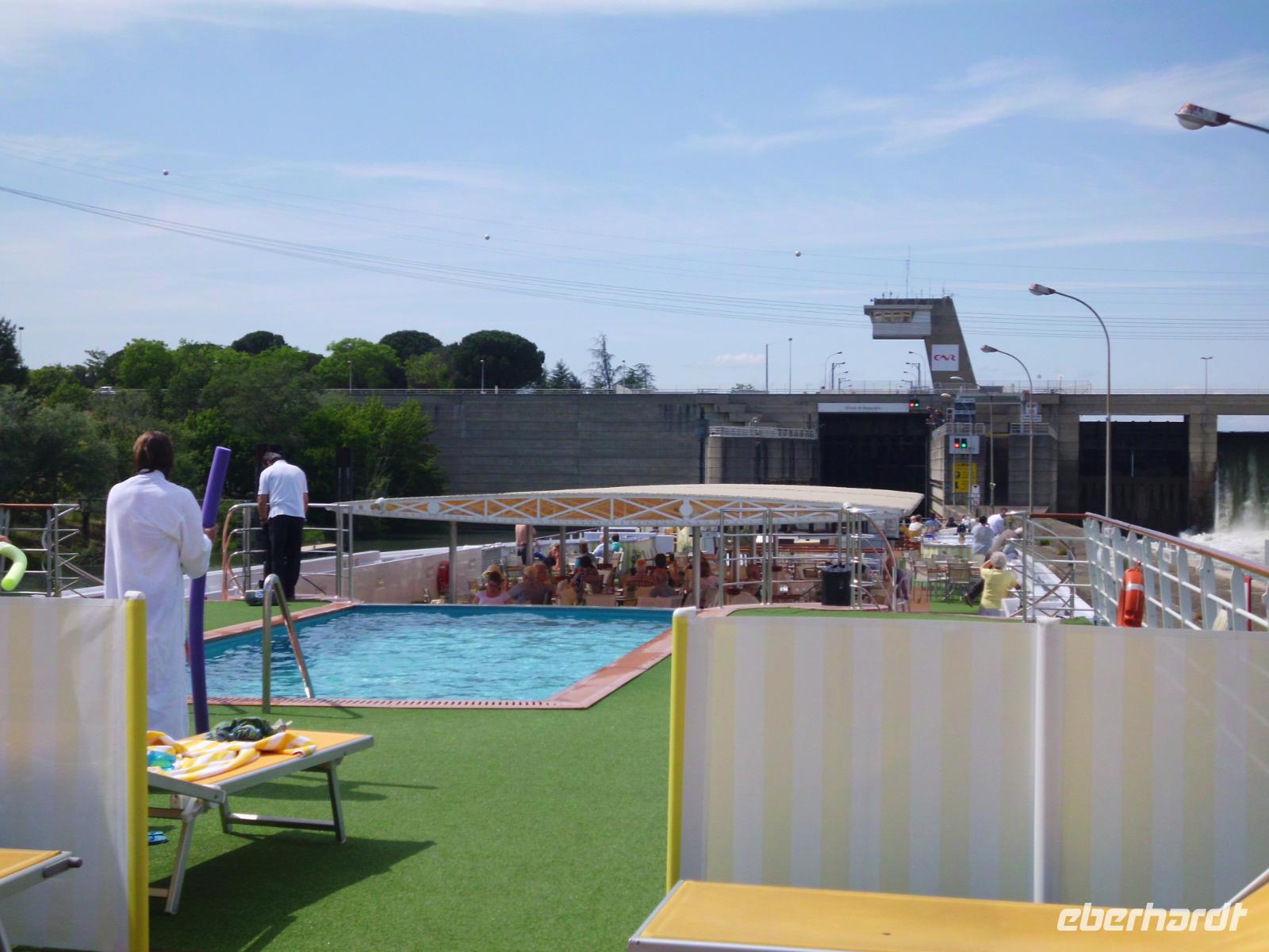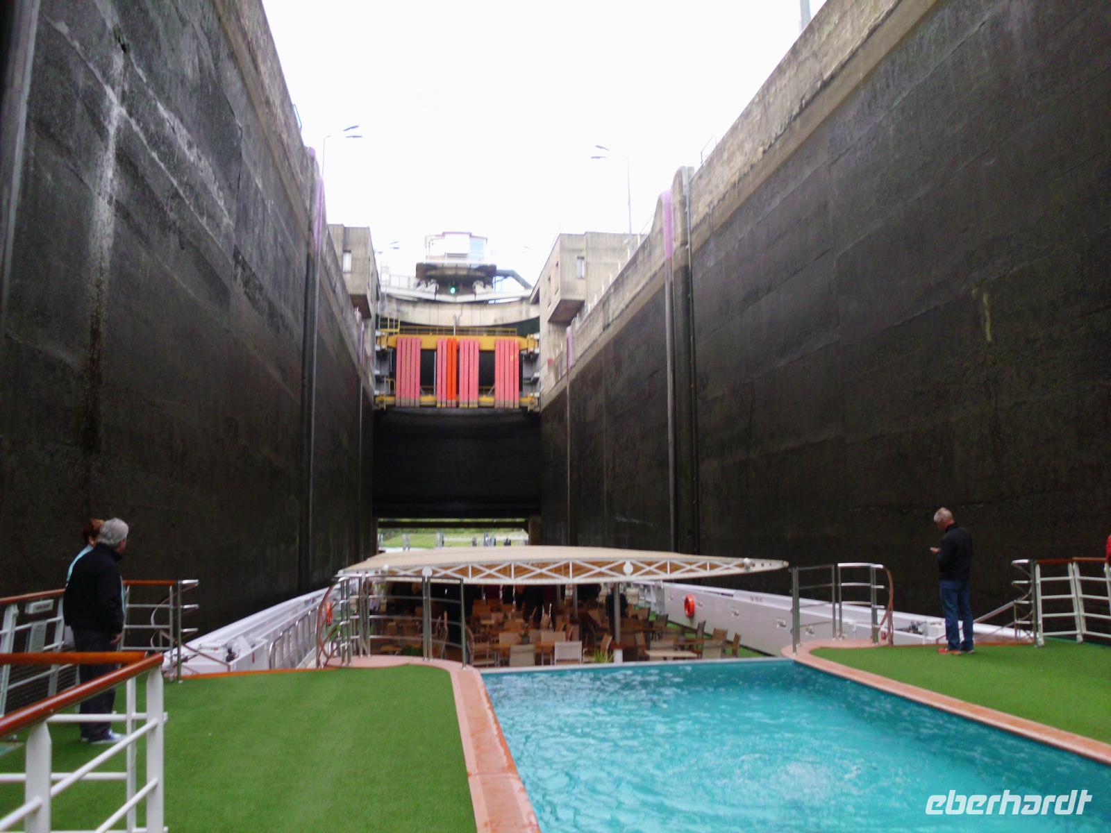 Abends gegen 20.30 Uhr erreichen wir die größte Schleuse unserer Fahrt mit 23m. Es ist beeindruckend, das Hinunterschleusen auf dem Sonnendeck mitzuerleben.