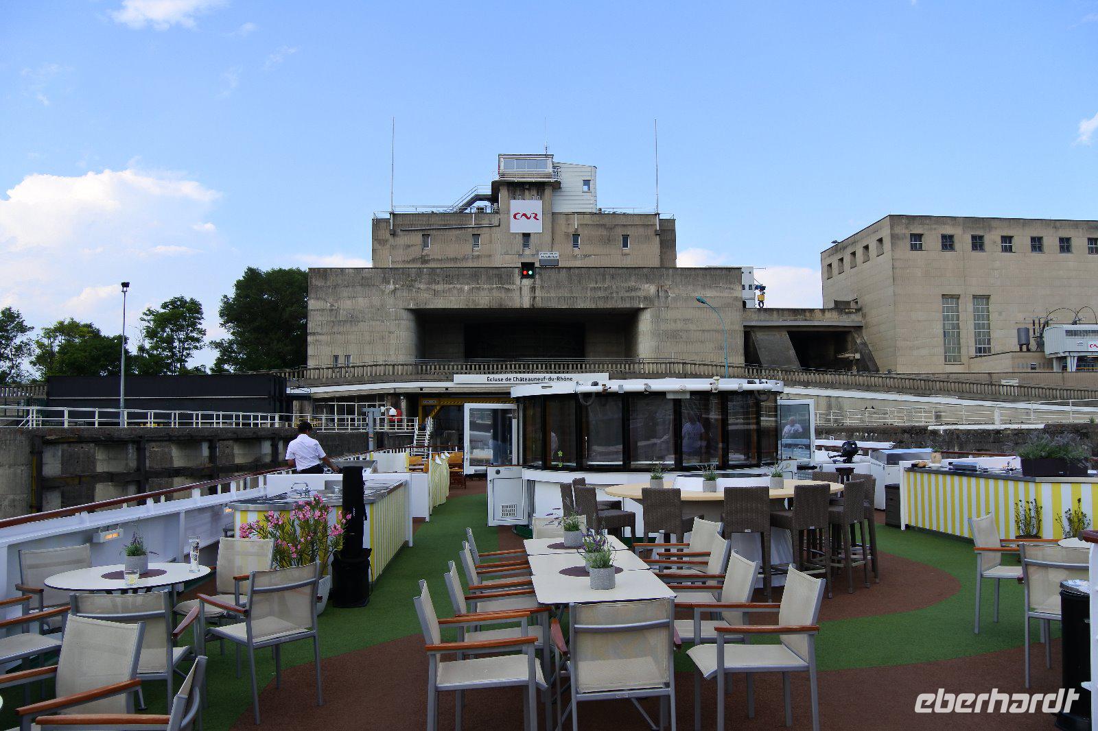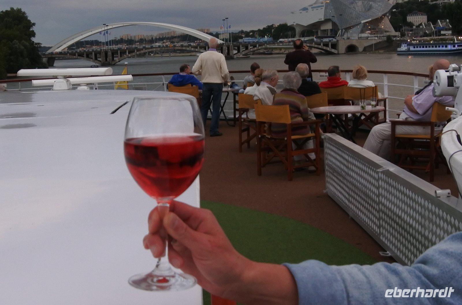 Nach dem Frühstücksbuffet unternahmen wir mit einer örtlicheren Stadtführerin eine Stadtrundgang durch die Altstadt von Avignon, bei der wir den Papstpalast von Innen besichtigt haben. Einige von uns machten einen Ausflug mit dem Bus zum Pont du Gard, dem weltberühmten römischen Aquädukt. Gegen 12:30 Uhr fuhr das Schiffes von Avignon nach Lyon zurück. Die Abfahrt und den Nachmittag genossen wir bei herrlichem Sonnenschein auf dem Sonnendeck. Zum Abendessen lud der Reiseleiter Gerd die 7 Alleinreisenden Damen zur einem gemeinsames Abendessen an einer runden Tafel mit Blumendeckoration und Aperitif. Als kleine Aufmerksamkeit überreichte er jeder Dame ein Lavendelsäckchen. Die meisten von uns ließen den Tag bei Unterhaltungsmusik und Cocktails in der Lounge ausklingen